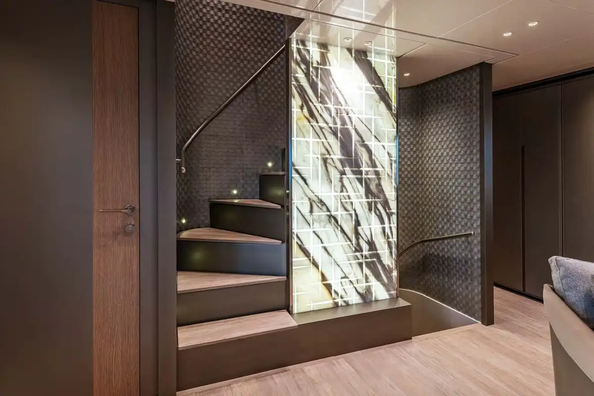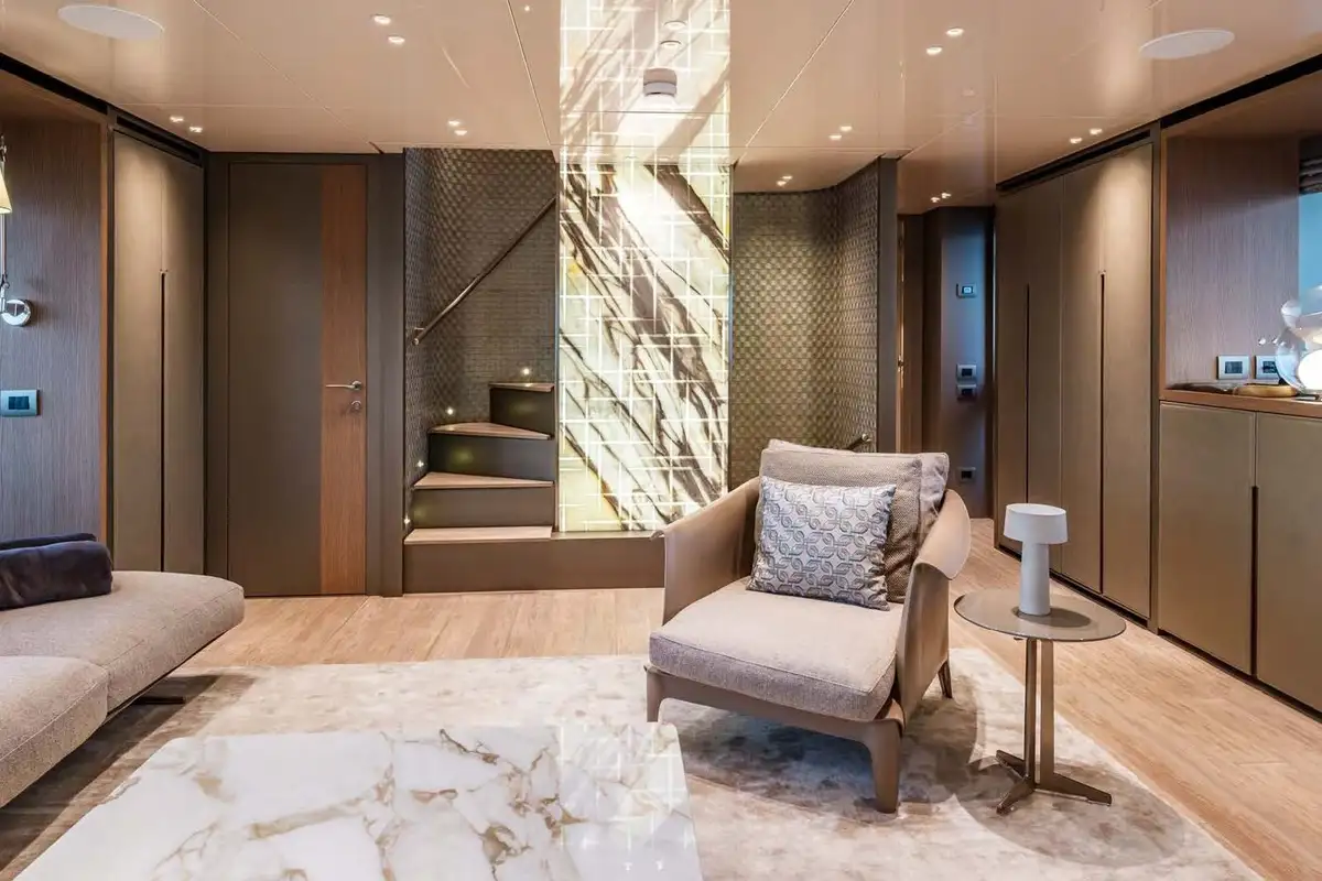 The main deck lounge and sky lounge have a soothing air of refined elegance. Both of these spaces are finished with a gentle, neutral palette and and furnished in a clean, contemporary style. The lounge is on the main deck level and the dining area above, with 10 seats around a marble table and excellent sea views through floor-to-ceiling glass on three sides.