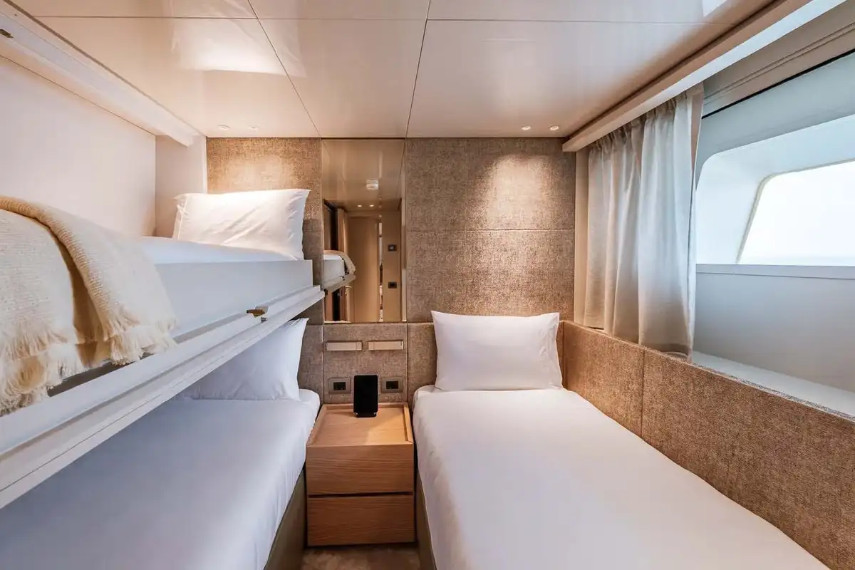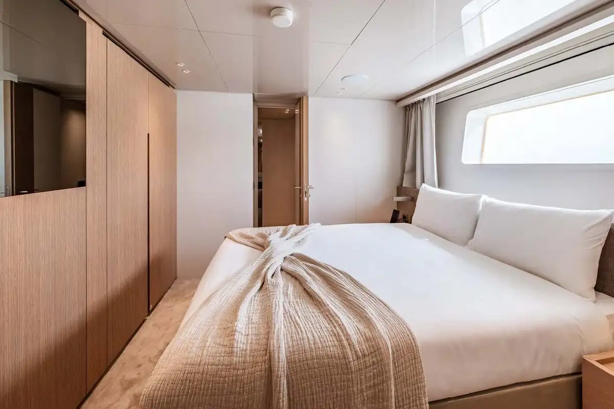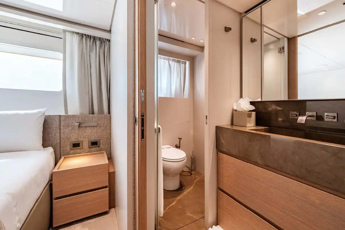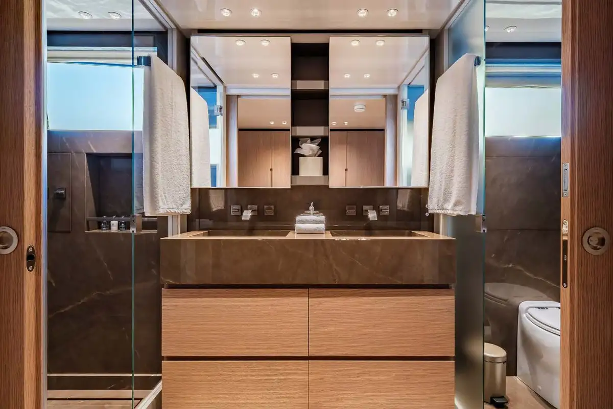 All the way forward on the main deck level is the master suite, where the L-shaped main cabin offers ample wardrobe space, a study desk and an armchair and a king size double bed. The en suite master bathroom is fully clad in marble with twin sinks and a large rain room shower. The lower deck accommodation includes two large doubles and two twin-bed cabins, one of which has an extra pullman bunk. All of these have their own private en suite bathrooms.