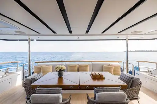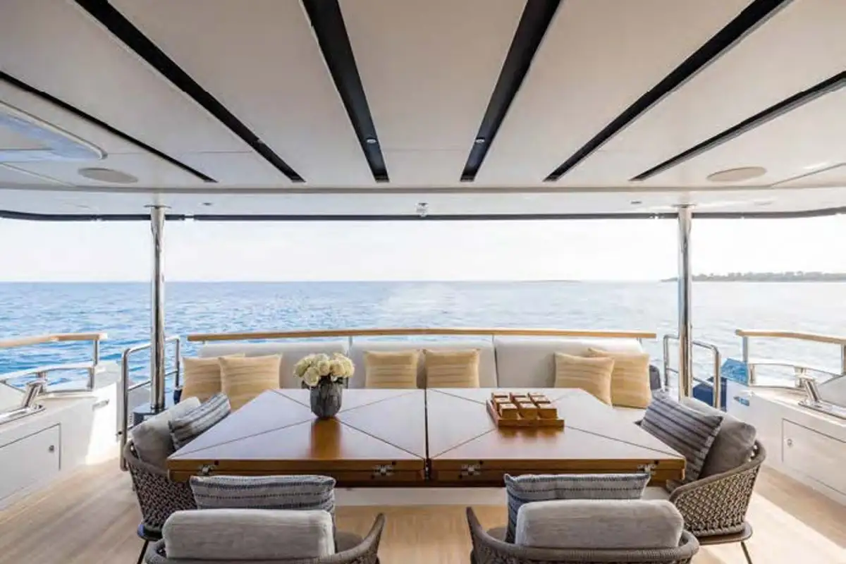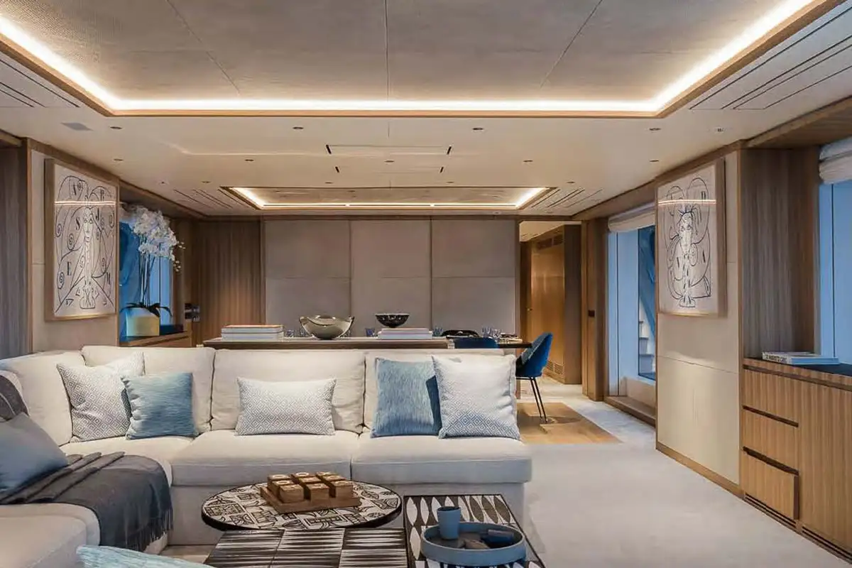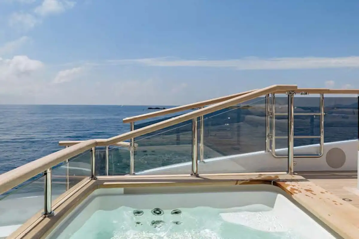 Notable features include the big jacuzzi, lounge and sunbathing zone on the spacious foredeck terrace, a nice variety of open-air seating and dining spaces on three different levels, an elevator that connects her top three levels – she’s fully wheelchair accessible – and the stern garage converts into a beach club when the anchor goes down and her tender and toys are deployed.
