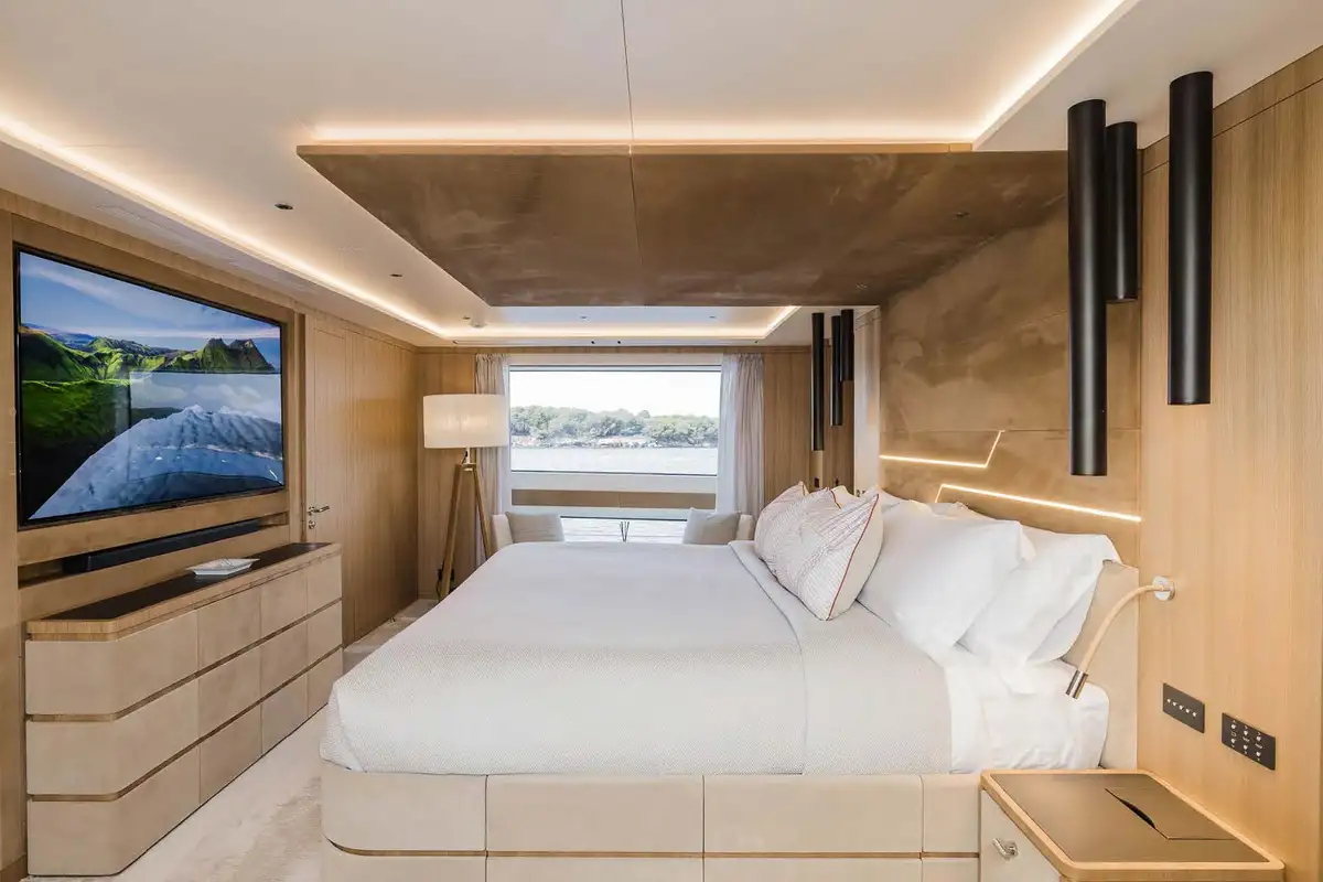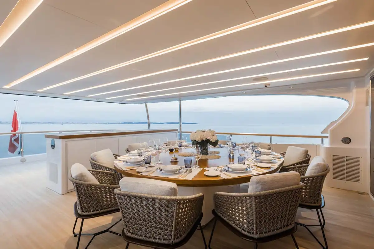 The main deck lounge is a large and comfortable smart-casual lounge with a huge TV for cosy evenings on board and a separate dining area where her chef’s contemporary cuisine can be enjoyed in an elegant setting. The upper deck saloon is a proper onboard cinema and there’s a great outdoor dining space on the upper aft deck, plus another one on the main deck below.
