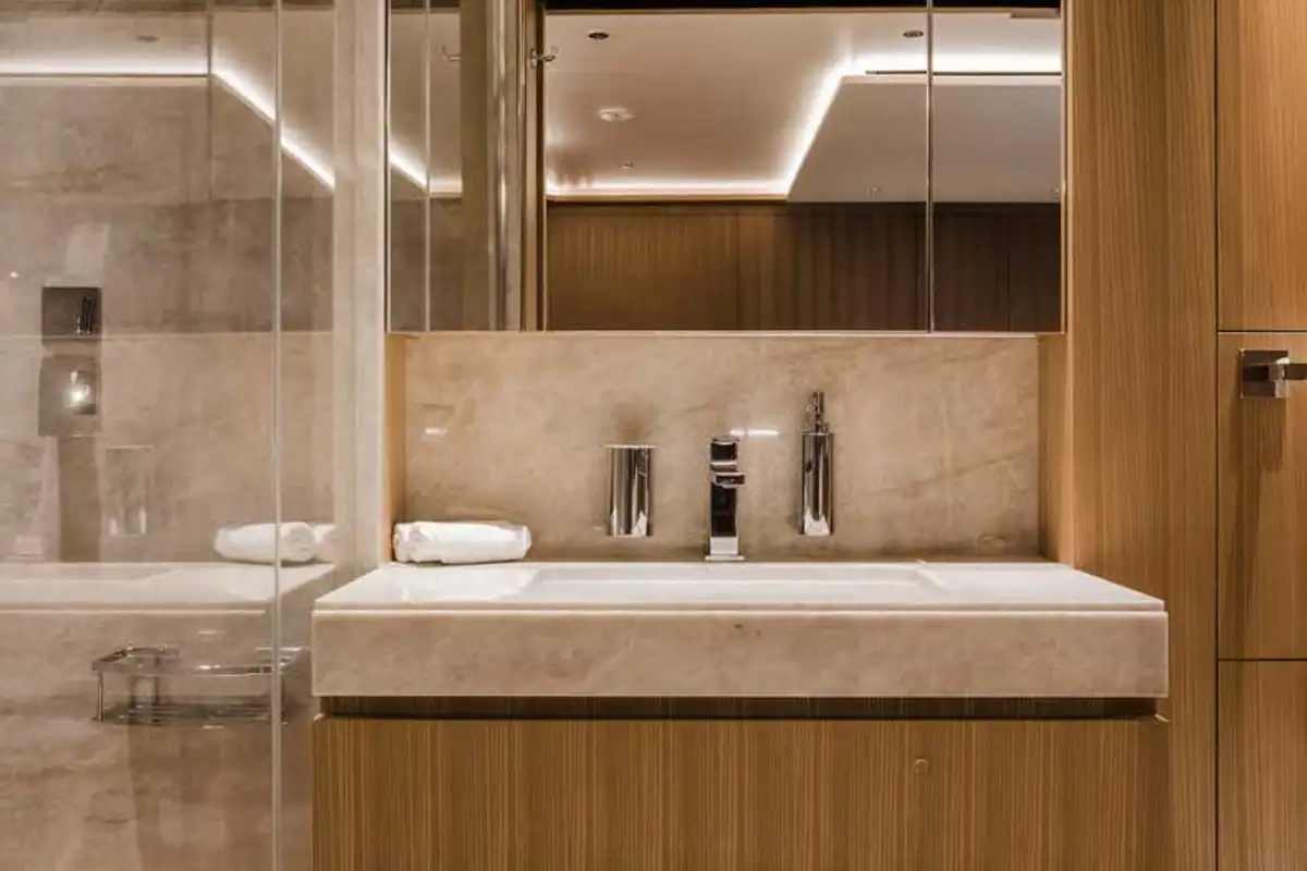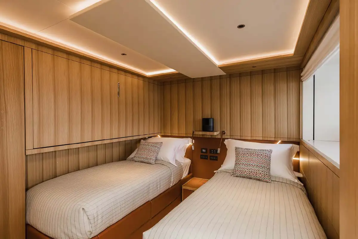 Up front on the main deck, the full-beam master suite is a tasteful and soothing oasis of calm with warm minimalist modern design and a luxurious en suite bathroom. With two further doubles and two convertible cabins, she’ll adapt to the needs of you and your guests with ease. Welcome aboard for a perfect charter holiday cruise
