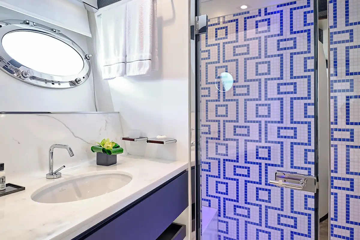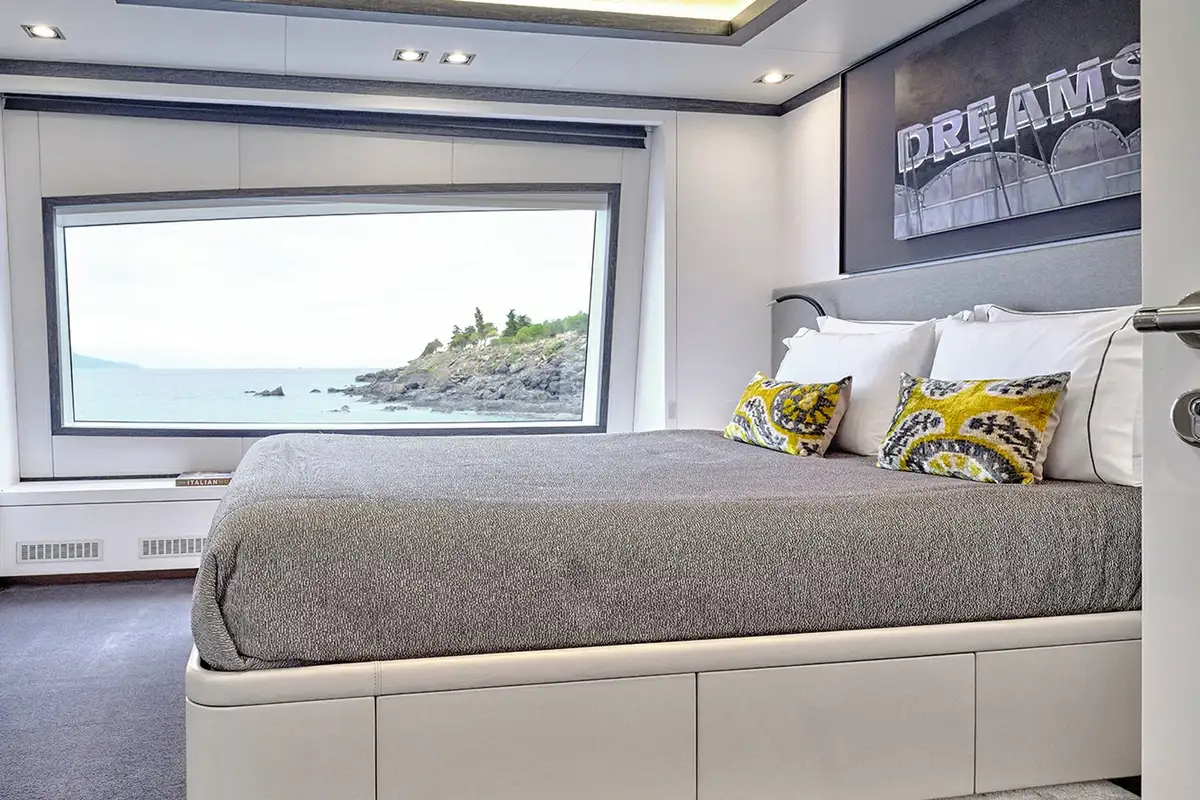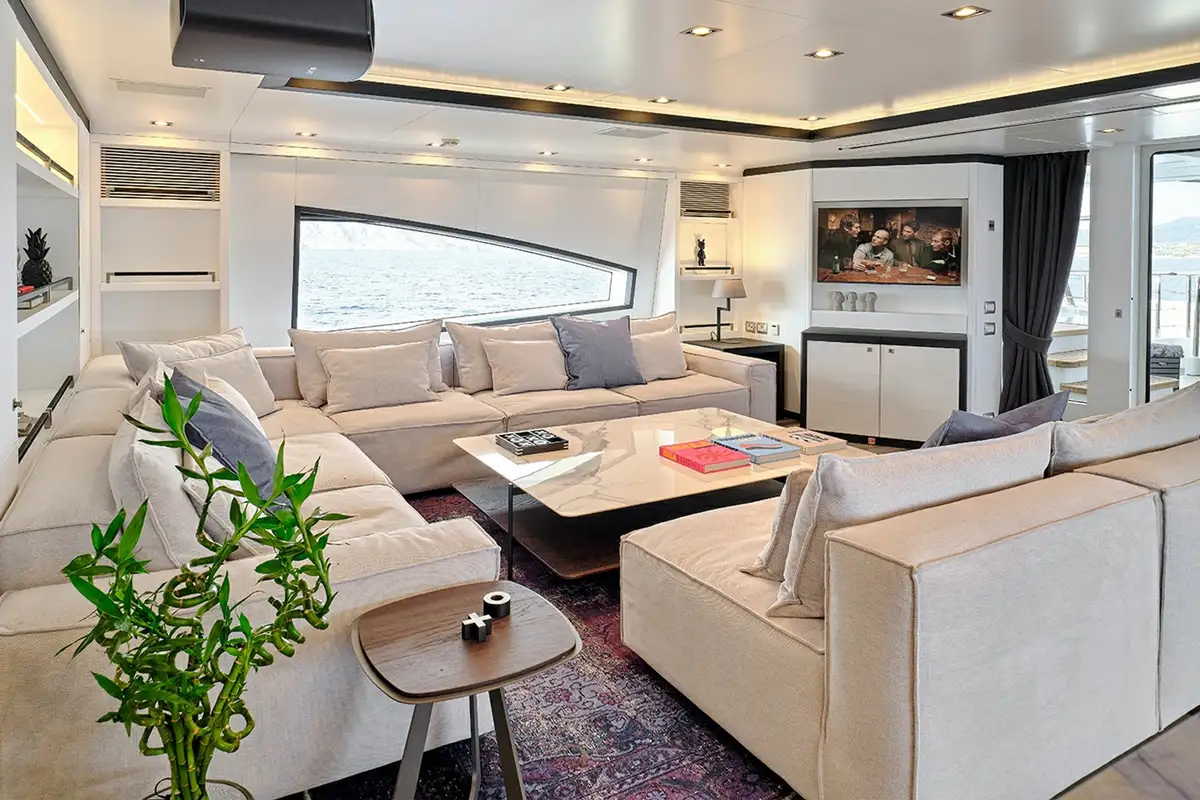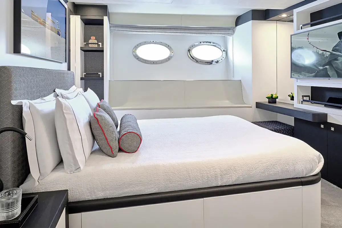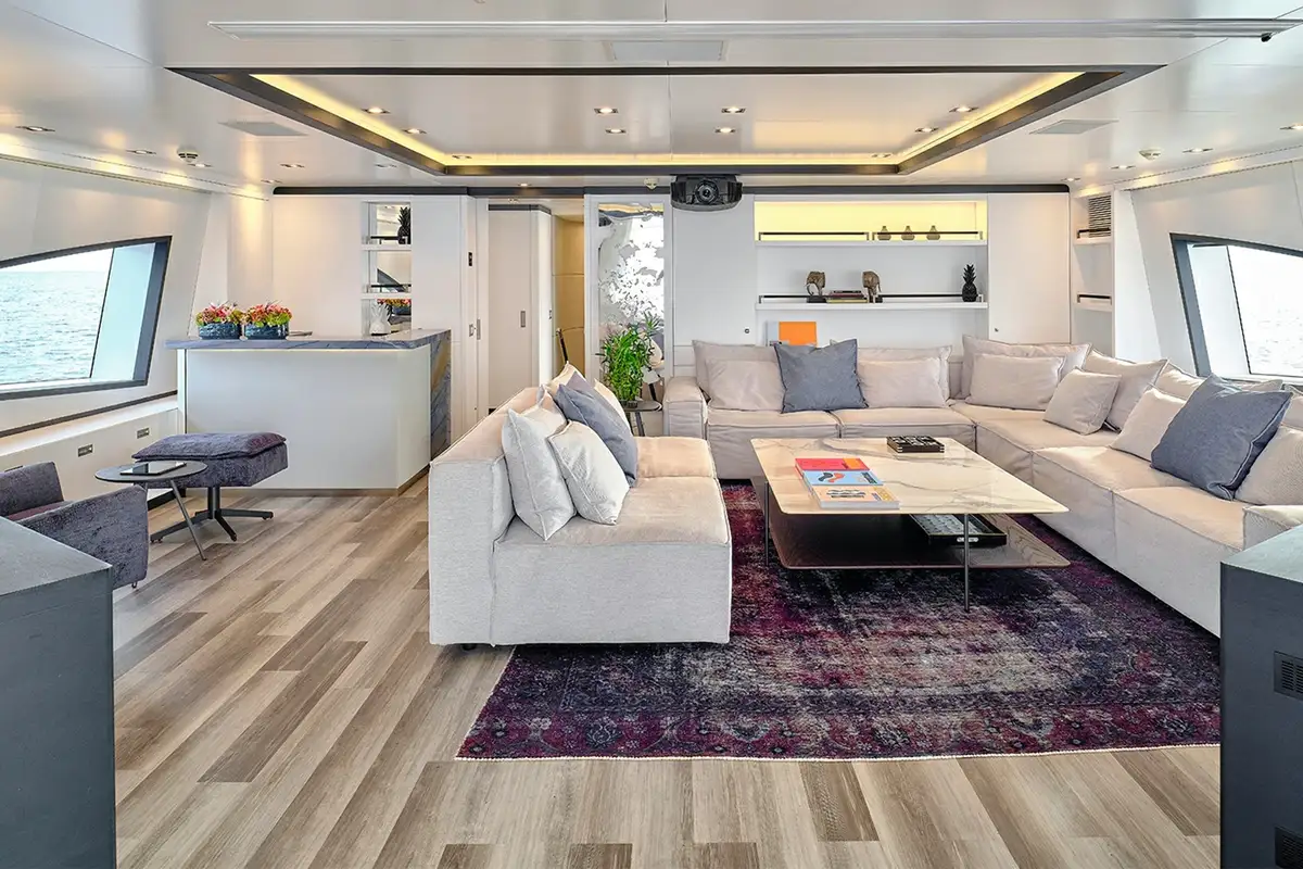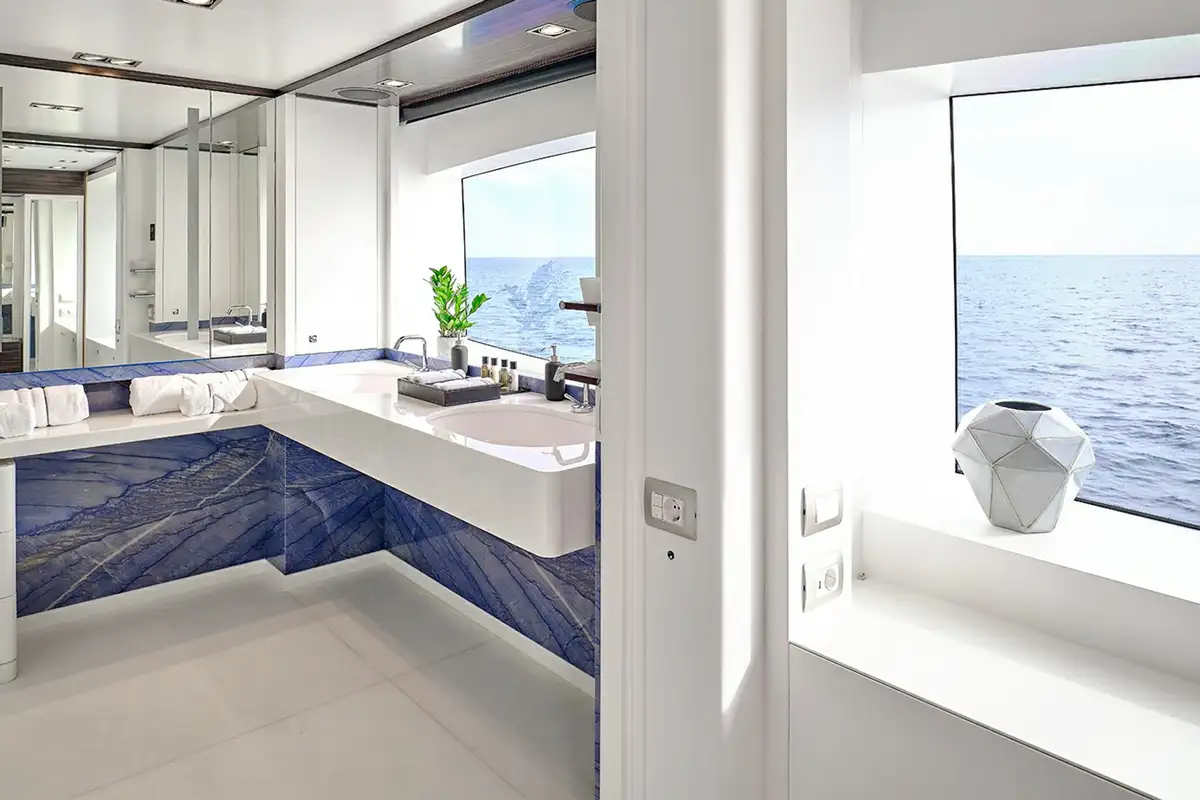 On the main deck, the full-beam master cabin features a private deck area, a rare luxury that allows guests to soak in ocean views in complete privacy. Five additional well-appointed cabins, including a VIP suite on the upper deck, sleep up to 12 guests in style and comfort. Wheelchair accessibility on the main deck ensures smooth navigation throughout, welcoming guests of all ages and needs.
