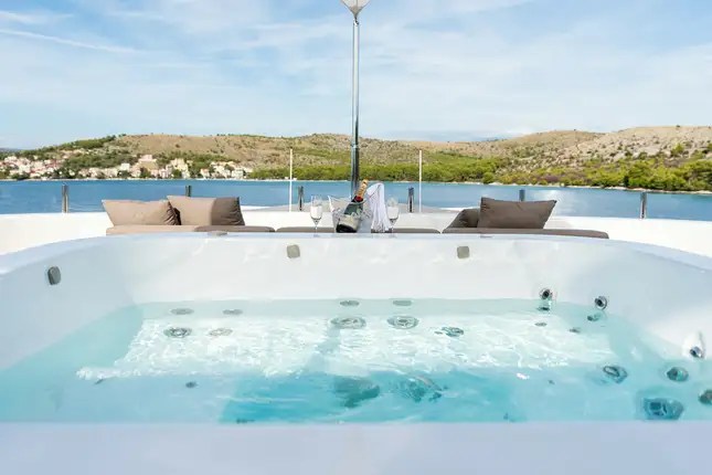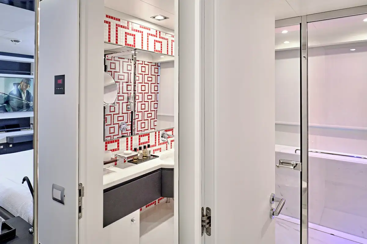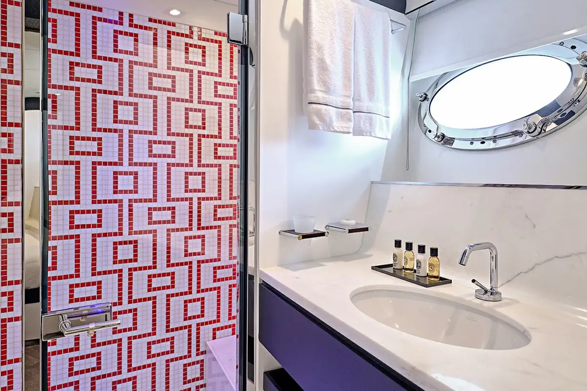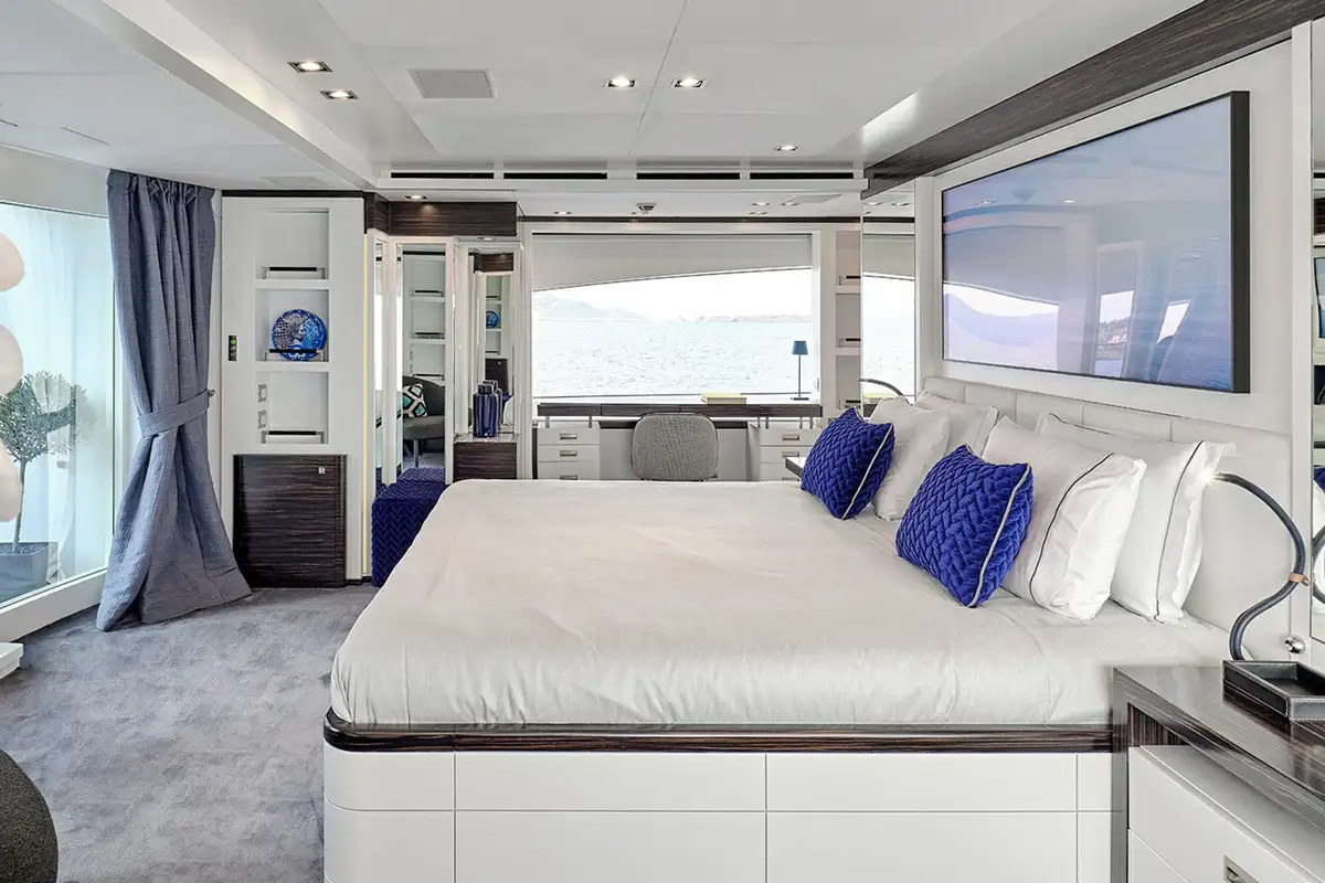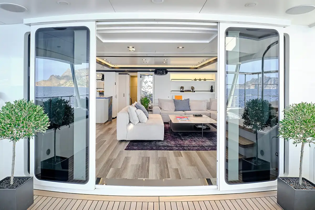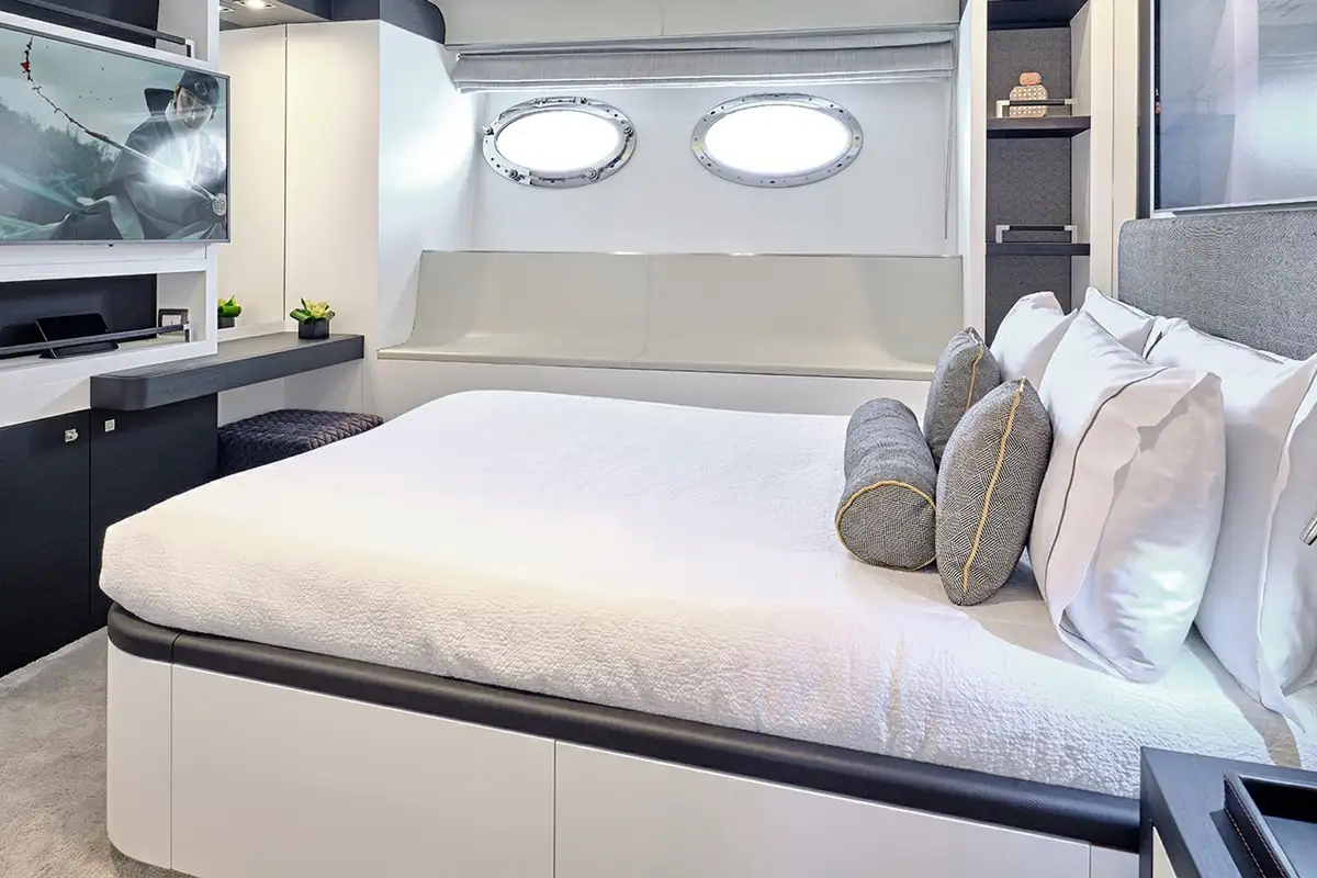 On the main deck, the full-beam master cabin features a private deck area, a rare luxury that allows guests to soak in ocean views in complete privacy. Five additional well-appointed cabins, including a VIP suite on the upper deck, sleep up to 12 guests in style and comfort. Wheelchair accessibility on the main deck ensures smooth navigation throughout, welcoming guests of all ages and needs.