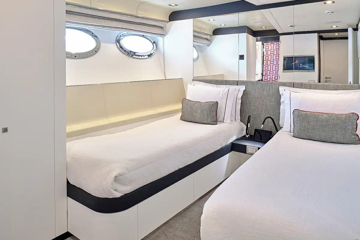 Step aboard AFRICA I and into the wilds of adventure. Her sleek exterior lines are matched by a rapid top speed of 24.2 knots for high octane fun on the water. With comfort at the fore, stabilisers mitigate roll when at anchor and underway, guaranteeing a comfortable and relaxing onboard experience. Inside, a fresh modern interior from the design boards of Francois Zuretti will please style aficionados, setting the scene for a charter to remember.