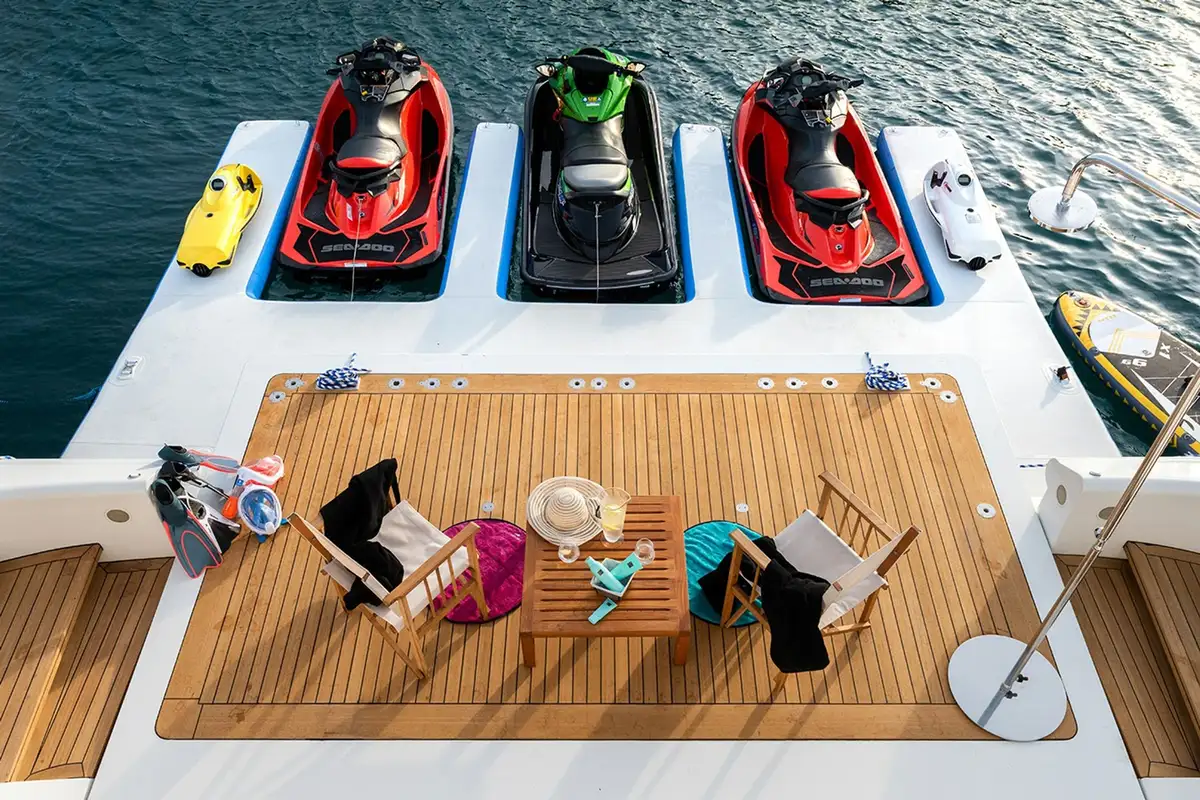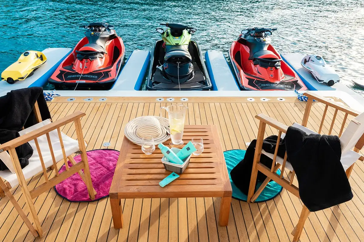 For those seeking action and adventure on the water, AFRICA I comes fully equipped with an impressive array of the latest water toys. Guests can explore in style with the RIBCO Venom 44 chase tender, perfect for fast transfers or scenic coastal cruising. The fleet also includes an Onda GT 10m tender and a Castoldi 21 Beach Ladder 6m tender for seamless shore access. Watersports enthusiasts can enjoy high-speed thrills on Seadoo Waverunners, glide beneath the surface with Seabobs, or paddle across calm bays on stand-up paddleboards.