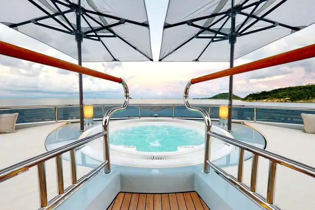 Her signature colour scheme, a combination of oyster white and a deep Chianti red, means she stands out in any harbour and you'll certainly turn heads as you arrive in the 7.5m limo tender. Workout in the air conditioned sun deck gym before soaking in the jacuzzi or pampering yourself in the dedicated spa with on board masseuse.