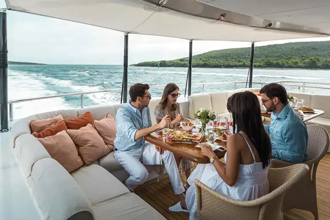 The upper aft deck is a wonderful outdoor dining space with a big round table where you and your guests can gather to enjoy superb contemporary cuisine with excellent, elevated views. The main deck aft makes a great impression as you ascend the curved steps from her large stern platform and it’s the ideal place for sundowners, gazing across the bay with cocktails and the waves gently lapping close by.