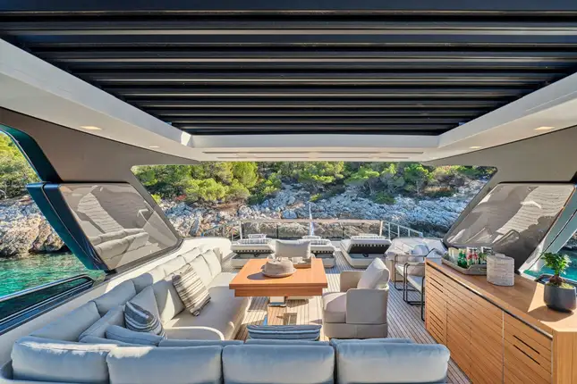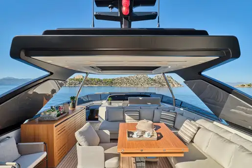 Highlights include a sleek sun deck shaded by a hardtop, a full stabilisation system for smooth cruising both at anchor and underway, and a curated selection of watertoys to elevate every moment on board.