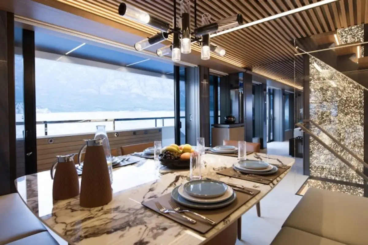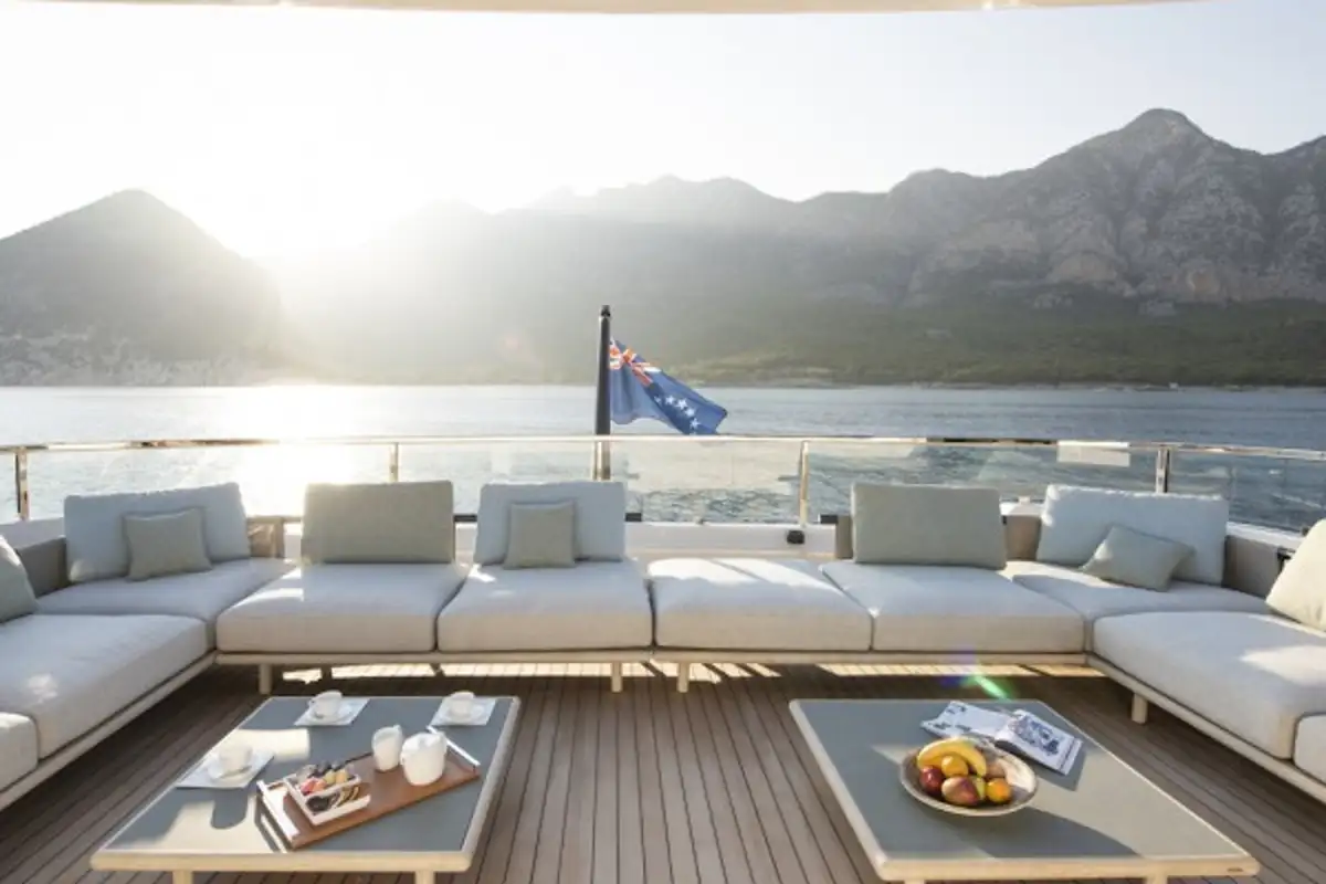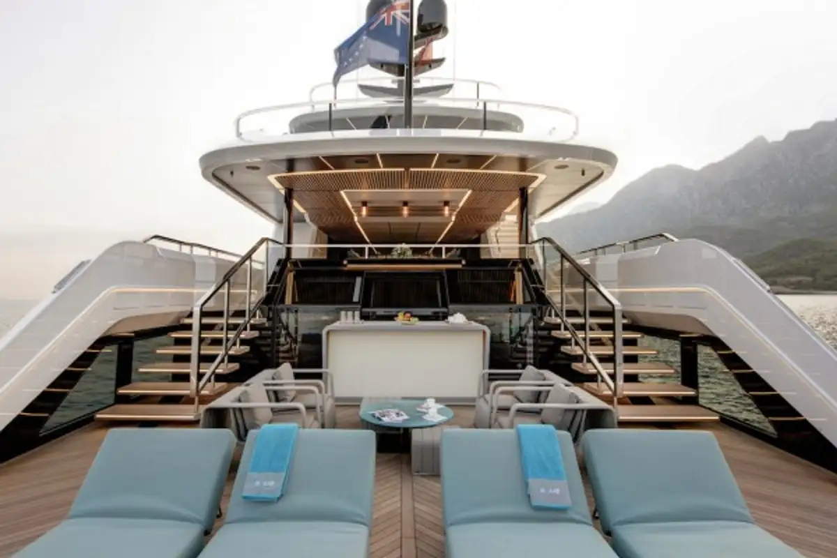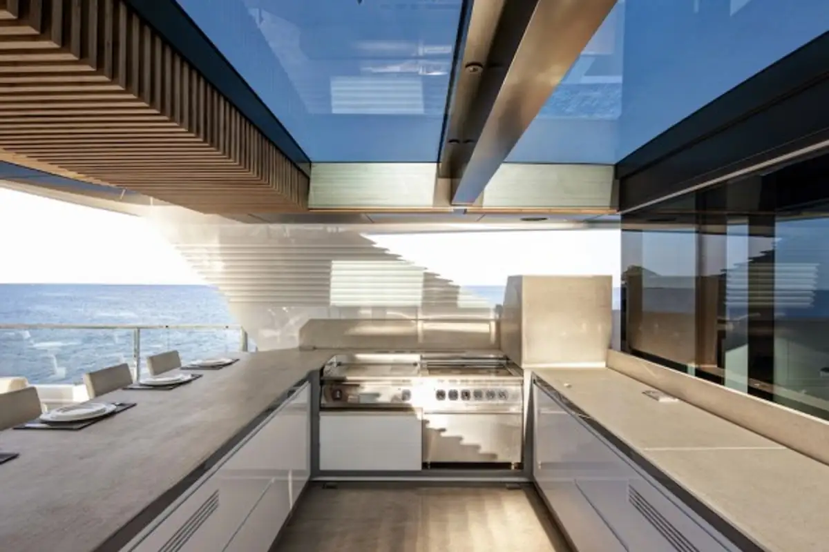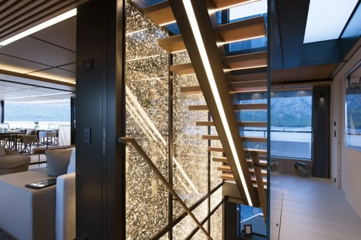 Her welcoming waterside al fresco lounge area is one of many places designed to help you relax and make the most of this modern waterborne oasis. Stairs outboard lead to the main deck, while an inboard staircase, concealed by tinted glass, leads down to the onboard gym and treatment room.