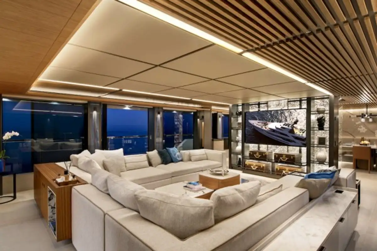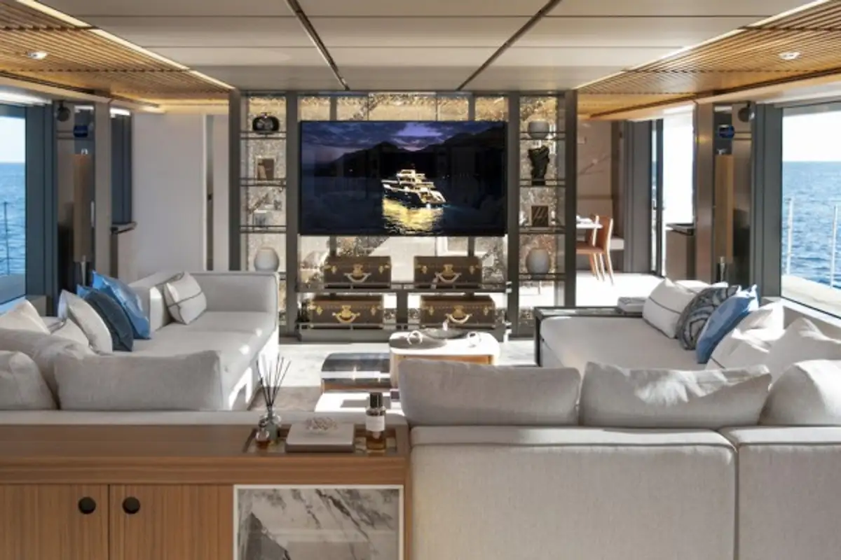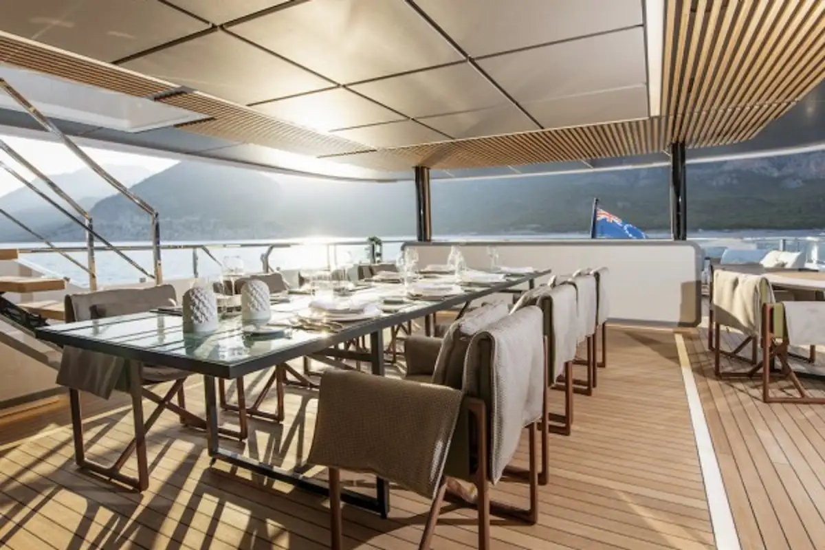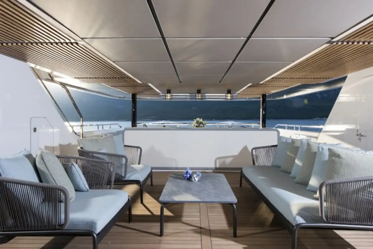Her welcoming waterside al fresco lounge area is one of many places designed to help you relax and make the most of this modern waterborne oasis. Stairs outboard lead to the main deck, while an inboard staircase, concealed by tinted glass, leads down to the onboard gym and treatment room.