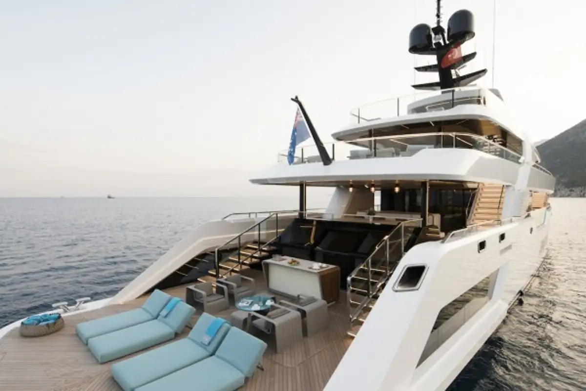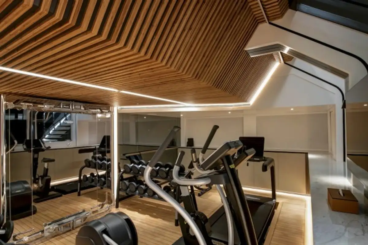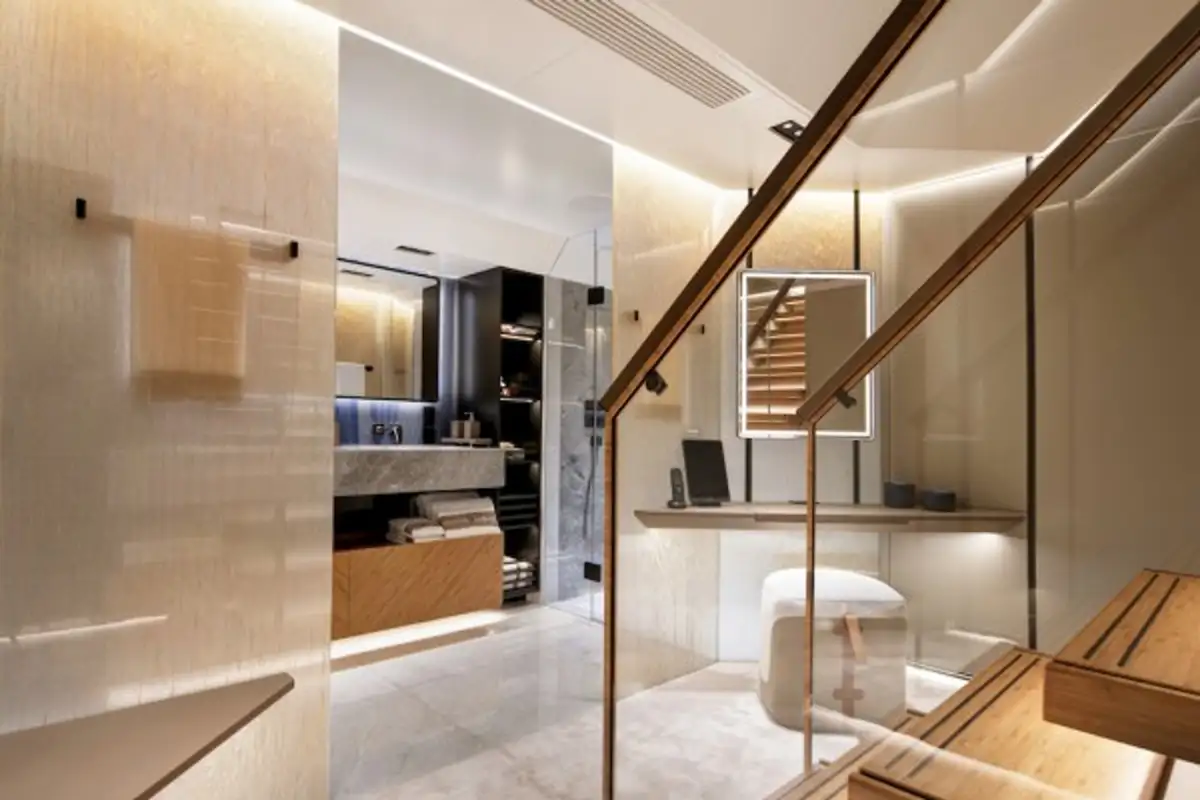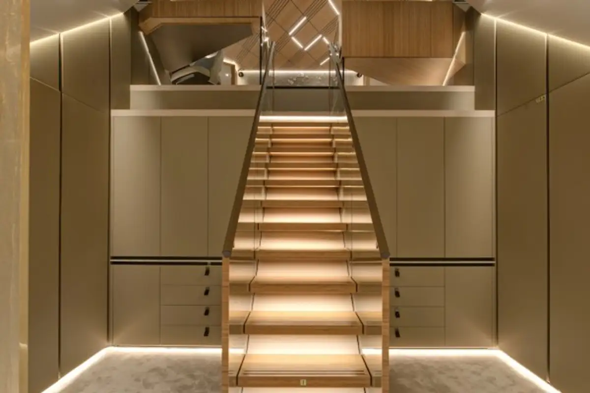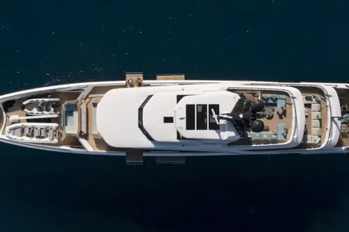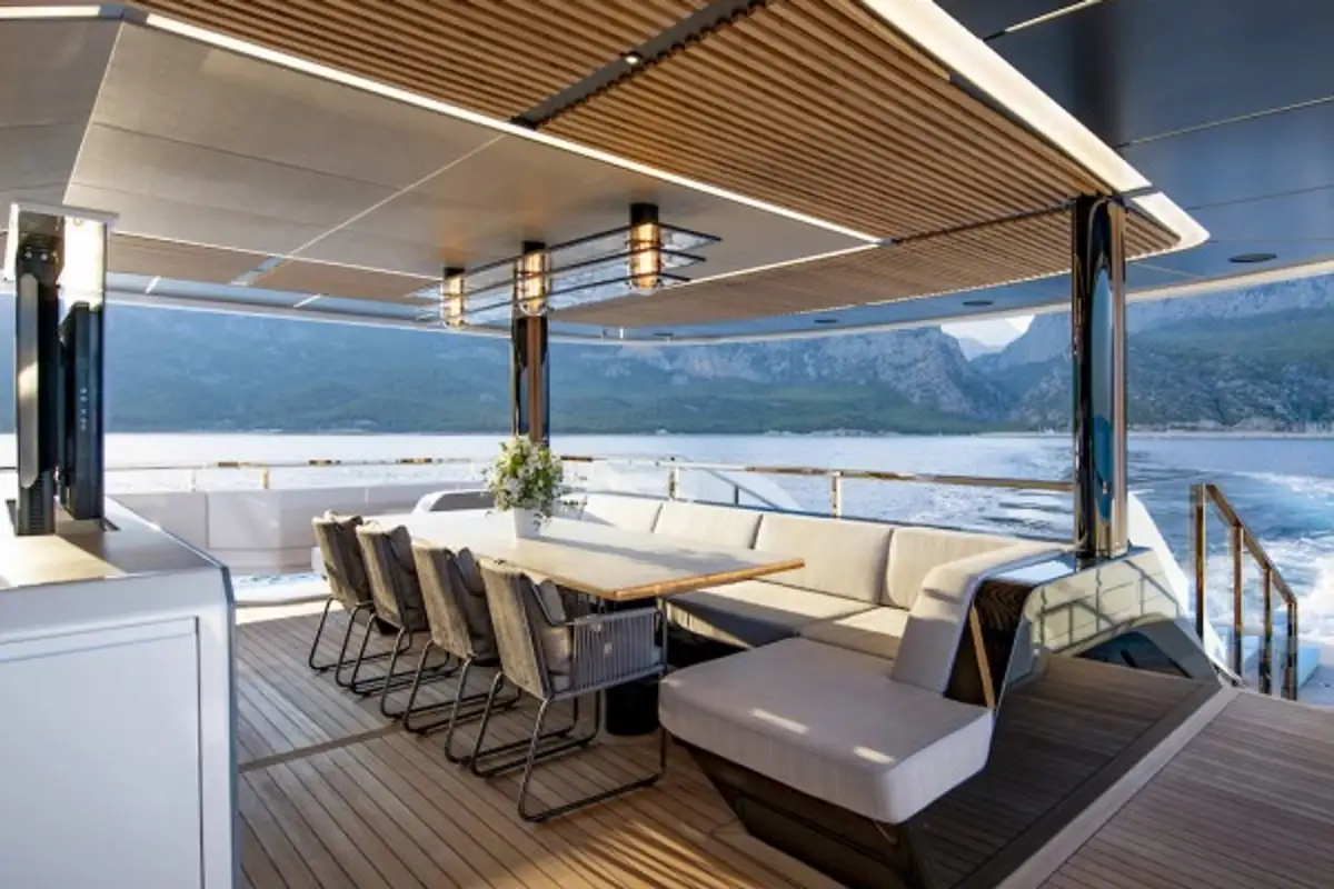 Her welcoming waterside al fresco lounge area is one of many places designed to help you relax and make the most of this modern waterborne oasis. Stairs outboard lead to the main deck, while an inboard staircase, concealed by tinted glass, leads down to the onboard gym and treatment room.