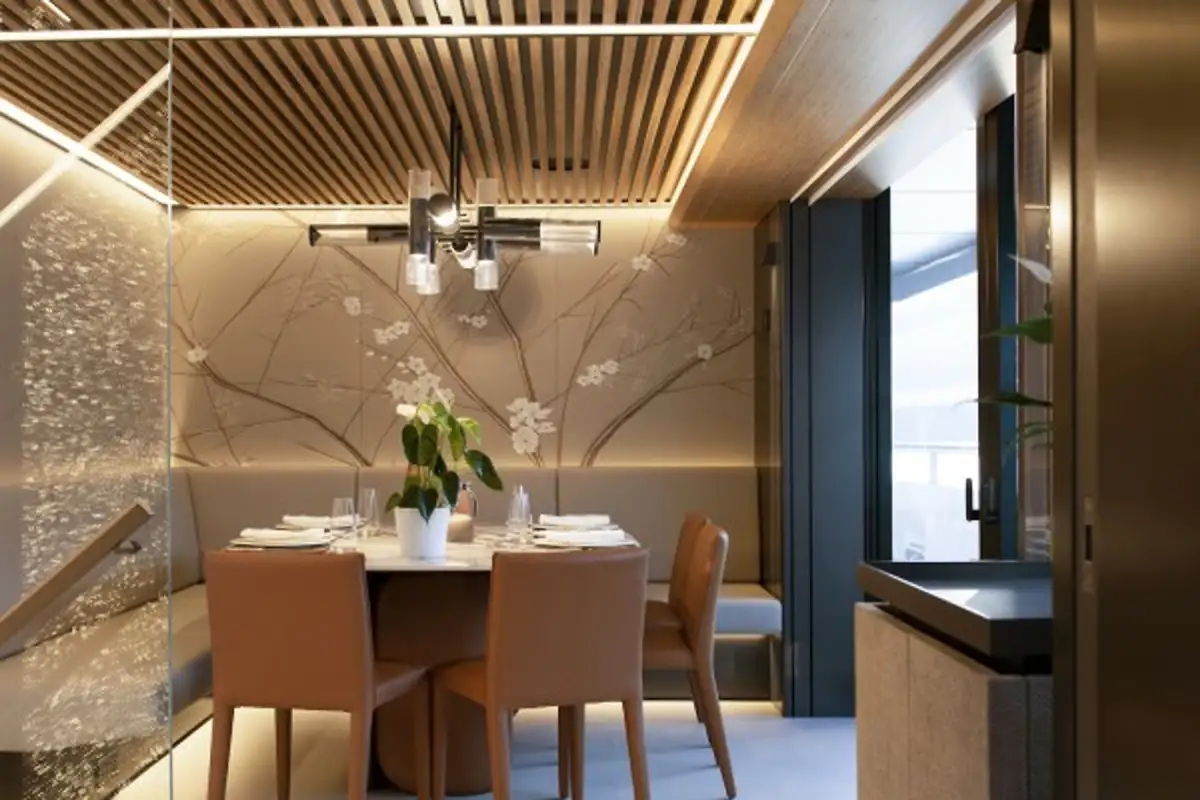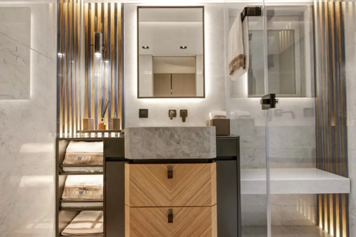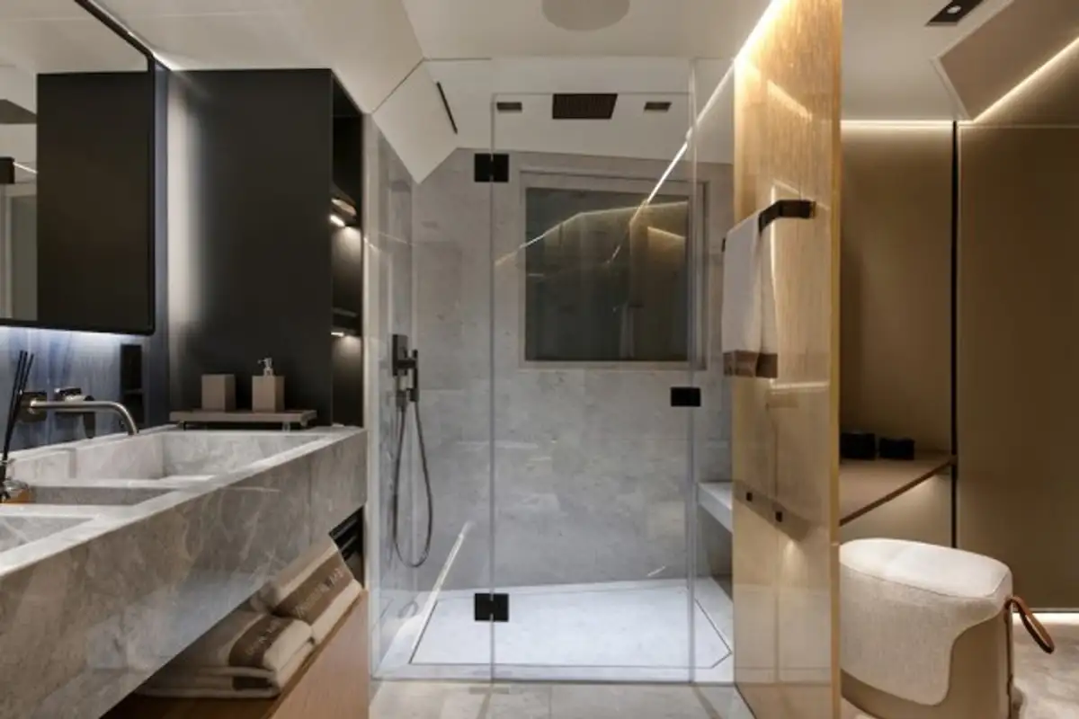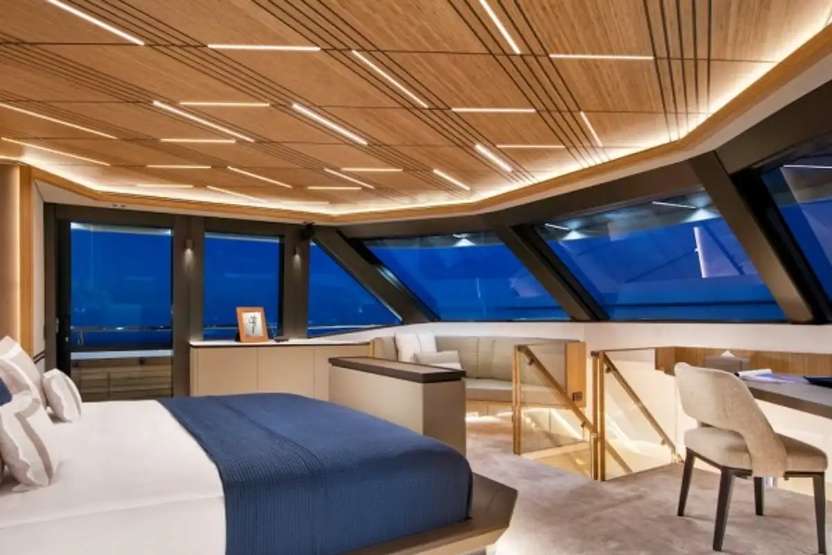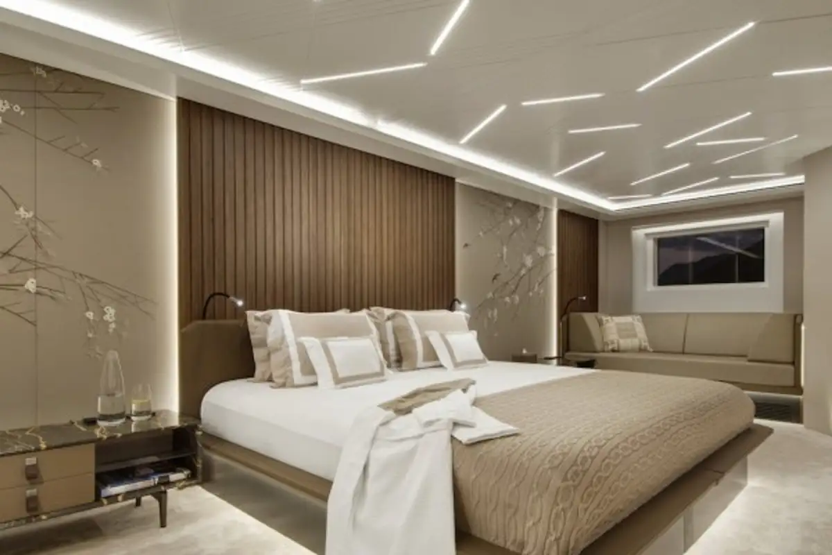 AL WAAB can host 12 guests in seven suites. The master suite benefits from its raised location on the upper deck. The suite and forward-facing king-sized berth and wraparound windows give you panoramic views to indulge in, and doors on either side give access to your private terrace and pool. A forward staircase, between a seating area and office space, descends to your exquisite en suite bathroom. The beautiful guest retreats are located on the lower deck. Here your guests will discover four double berth suites and two twin-berth suites all have the privacy of en suite facilities.