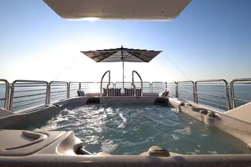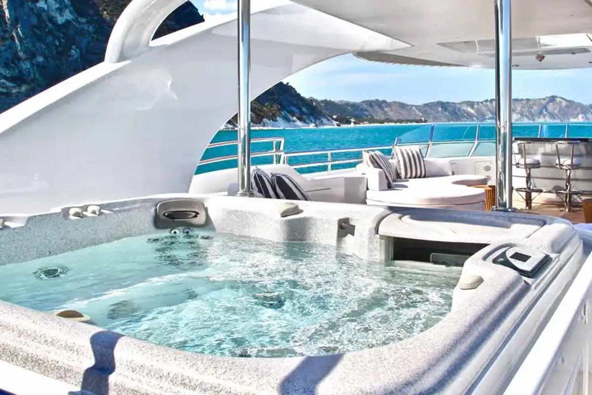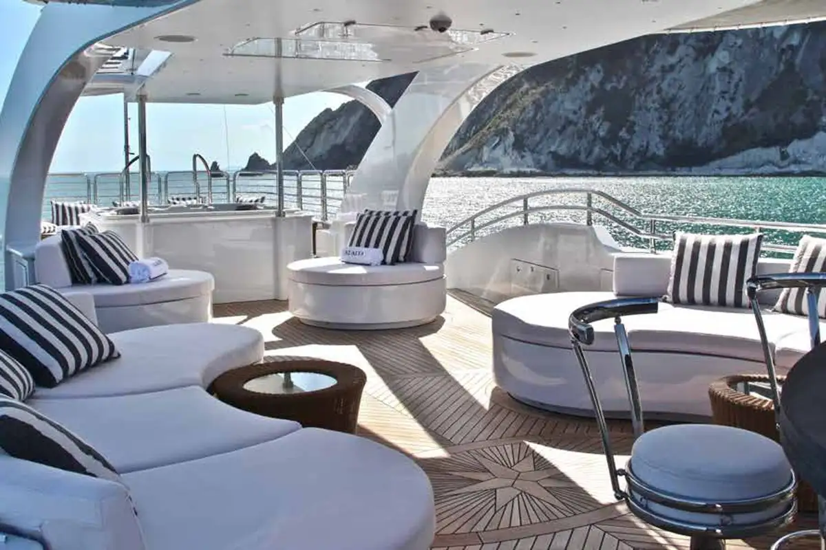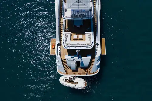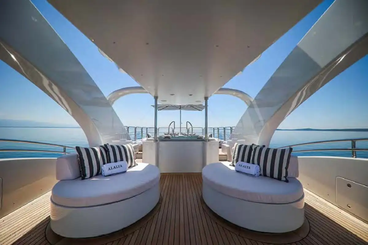 With staircases on either side sweeping from the water’s edge up to the stunning sun deck, you can move effortlessly from deck to deck and make the most of ALALYA’s fabulous al fresco guest areas. From her wonderful social circular seating arrangement in the cockpit to the broad al fresco lounge and dining areas on the upper deck, to the desirable sun deck – adorned with a raised jacuzzi, wet bar area, social seating areas and large rear sunpad – you and your guests will be spoilt for choice as to where to enjoy the sunshine.