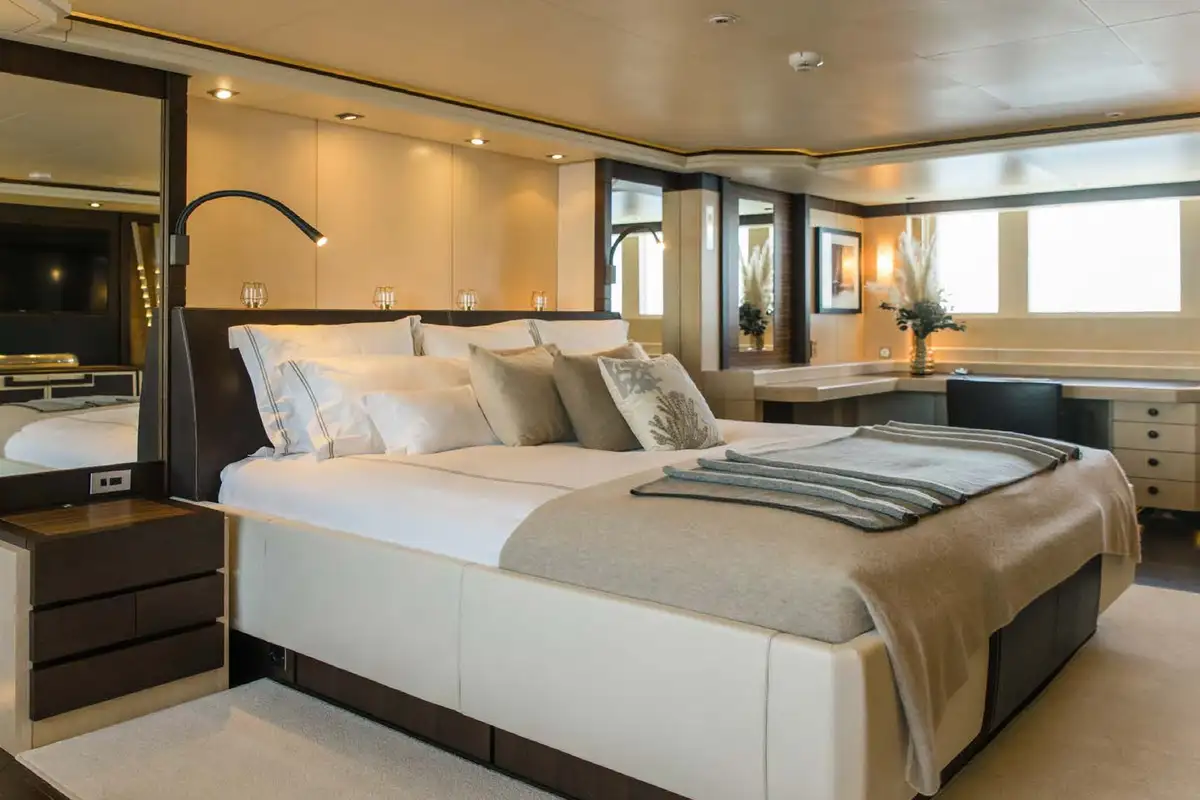 ALALYA boasts five elegant suites for your party’s use. The master suite can be found on the main deck. This sensational full-beam suite has a forward-facing king-sized berth with a TV recessed ahead. Forward in the suite is the palatial oasis of the full-beam en suite bathroom, accessed via a dressing room on either side the suites has his and hers sinks, and central spa bath and a separate shower compartment. It’s the perfect place to de-stress. Your guests have the choice of three stunning king-sized double suites and a twin-berth suite. There is also a multi-purpose cabin that can be an exercise suite or treatment area – if the two pullman berths aren’t required.