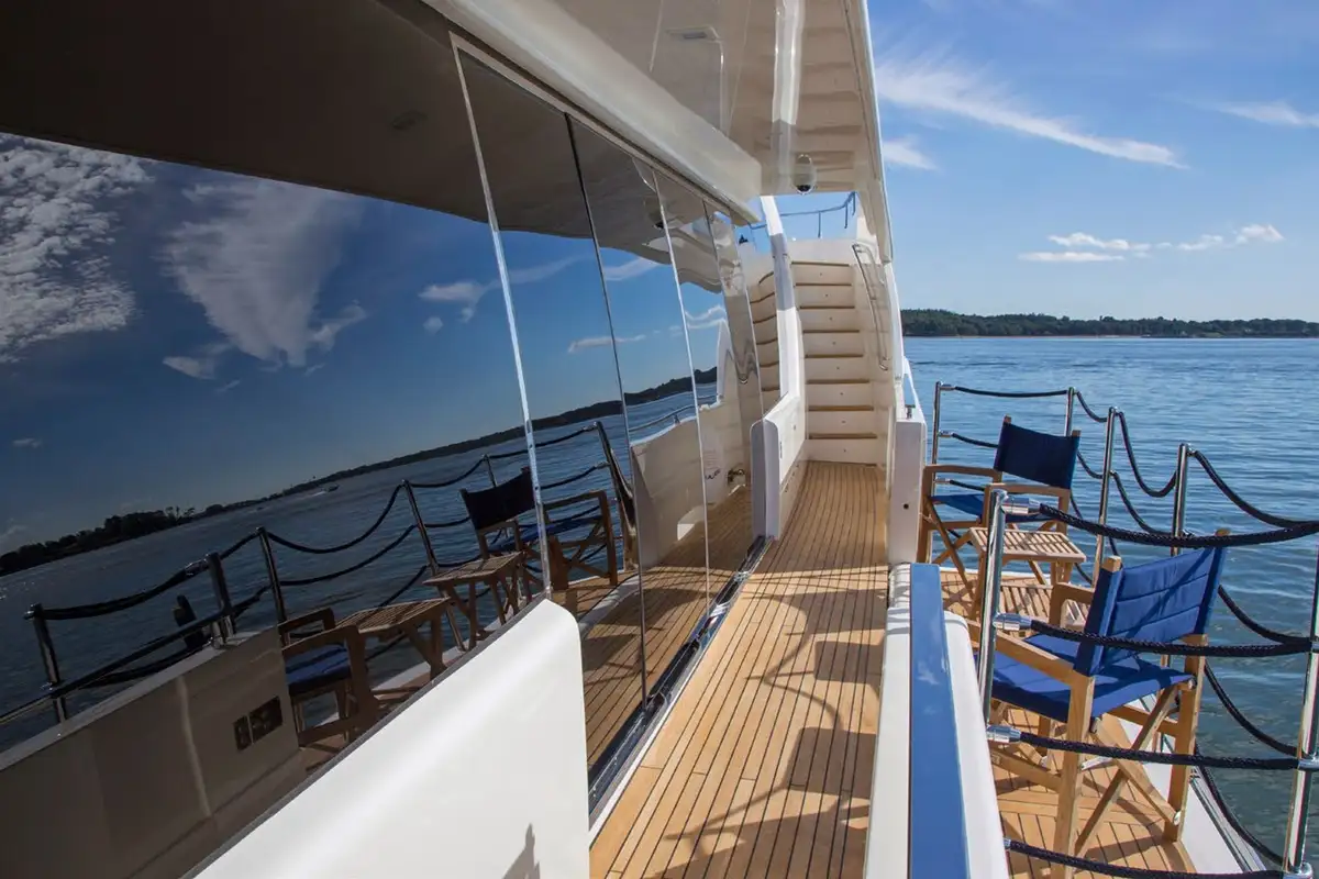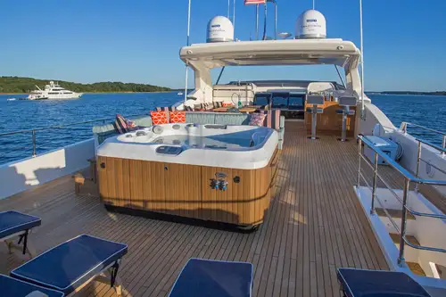 Efficient by design, with a relatively modest footprint, she makes no compromises in the levels of onboard luxury and comfort that she offers to her guests. Her cruising speed is swift enough to easily outpace most other yachts and claim the best spot in an anchorage without shaking your Martinis and she has the power to deliver an exhilarating burst of adrenaline at her top speed of 26 knots.