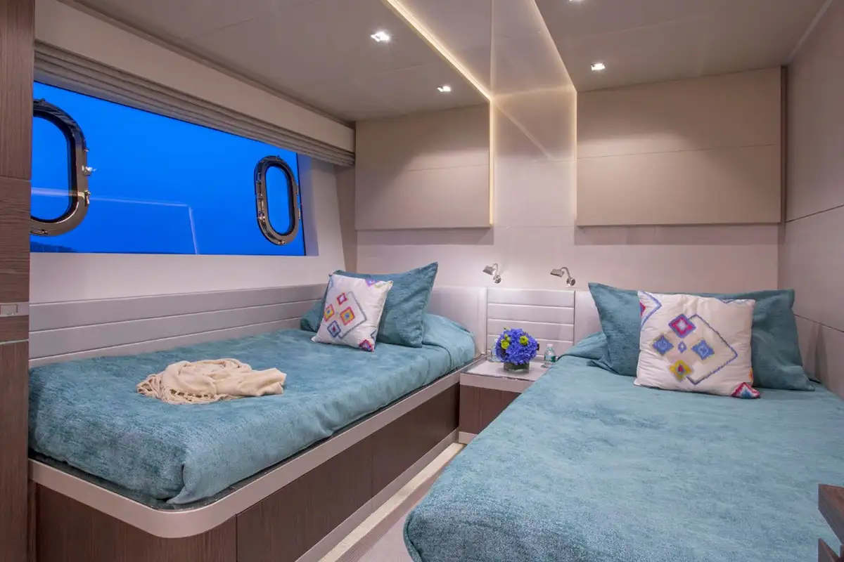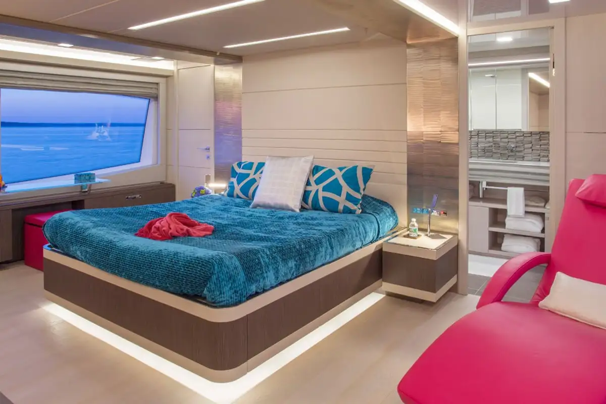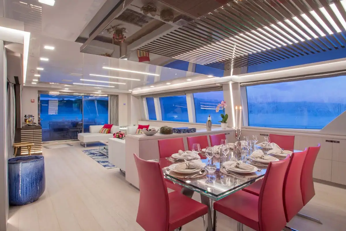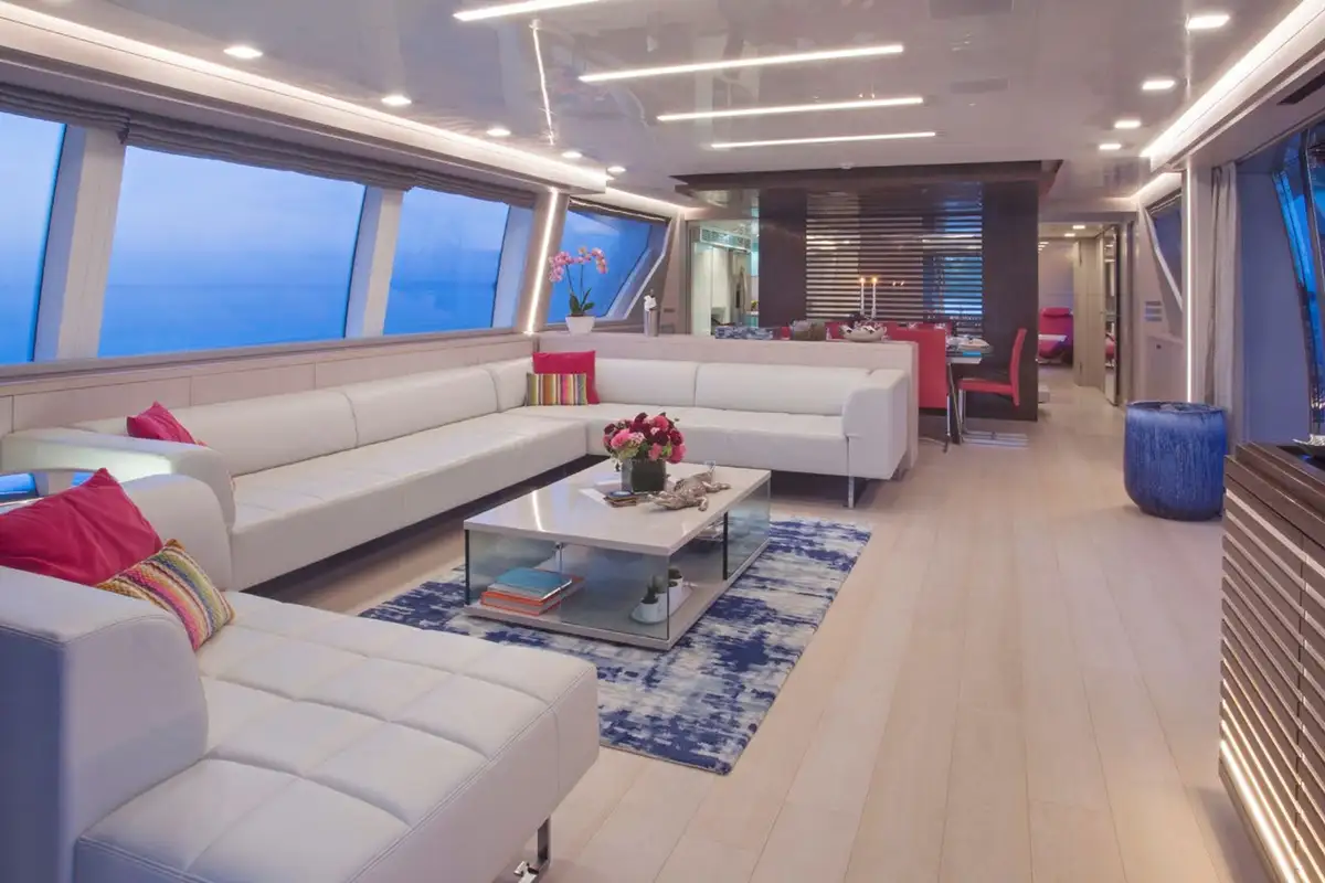 Her inside spaces are bright, clean and beautifully finished in luxe contemporary Italian style. The main deck saloon is fully glazed on both sides, with design classic sofas in a spacious, comfortable lounge and an elegant eight-seat dining table for memorable dining experiences.