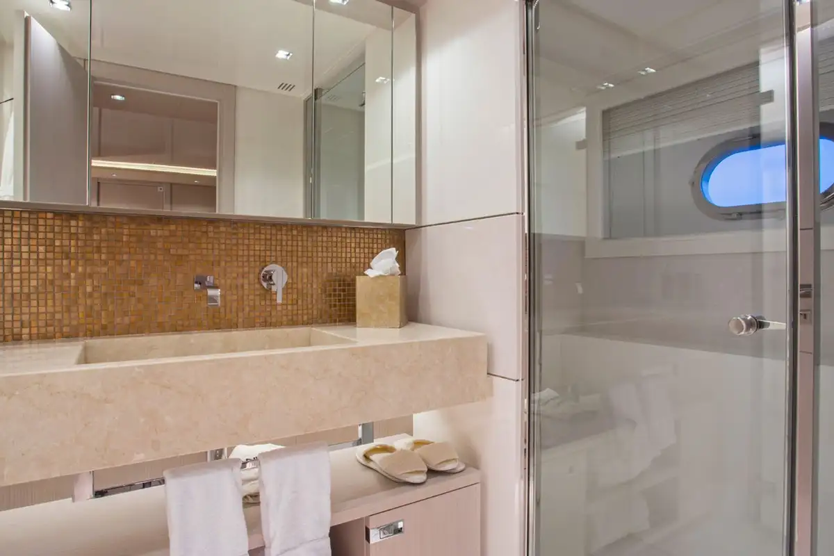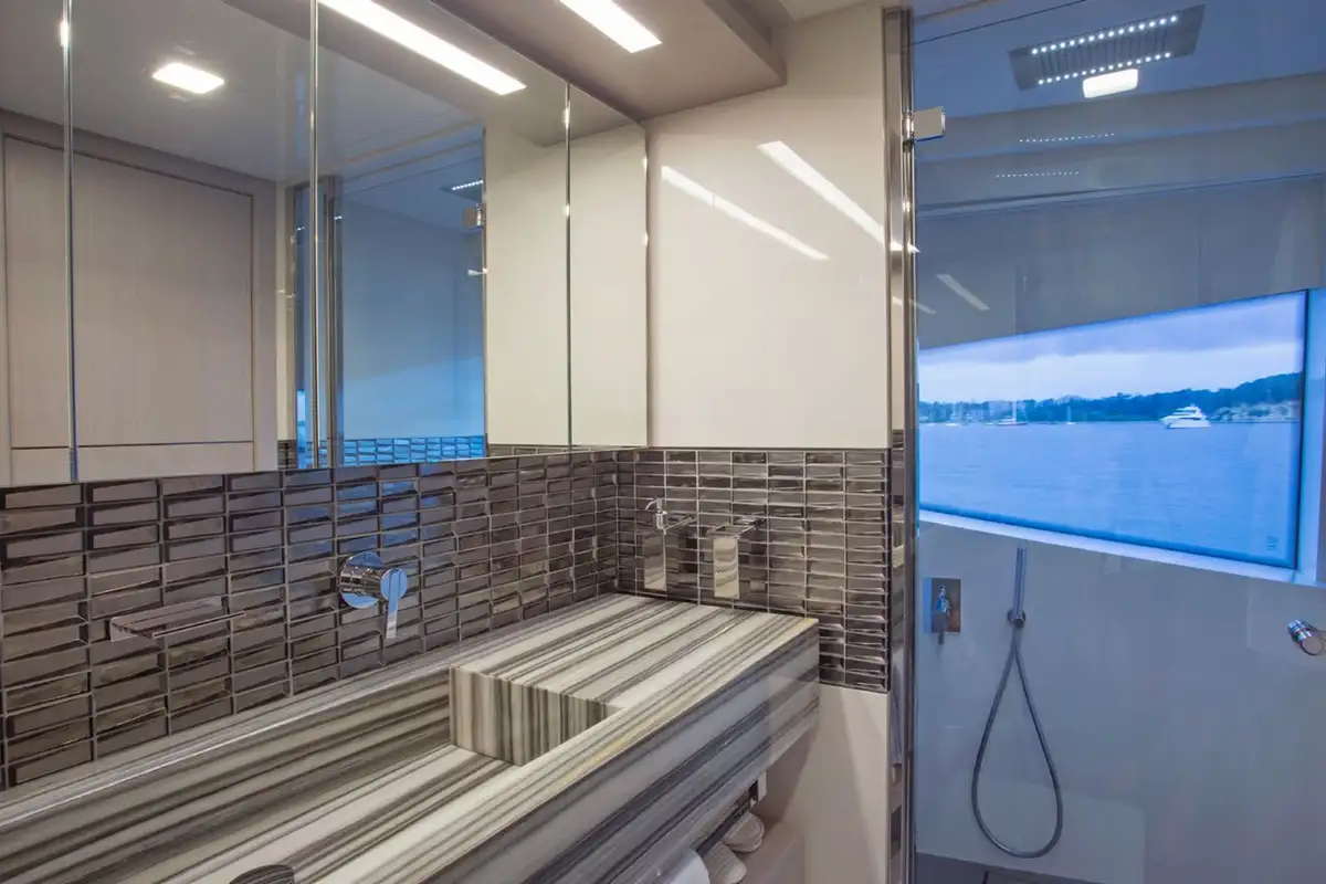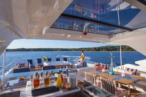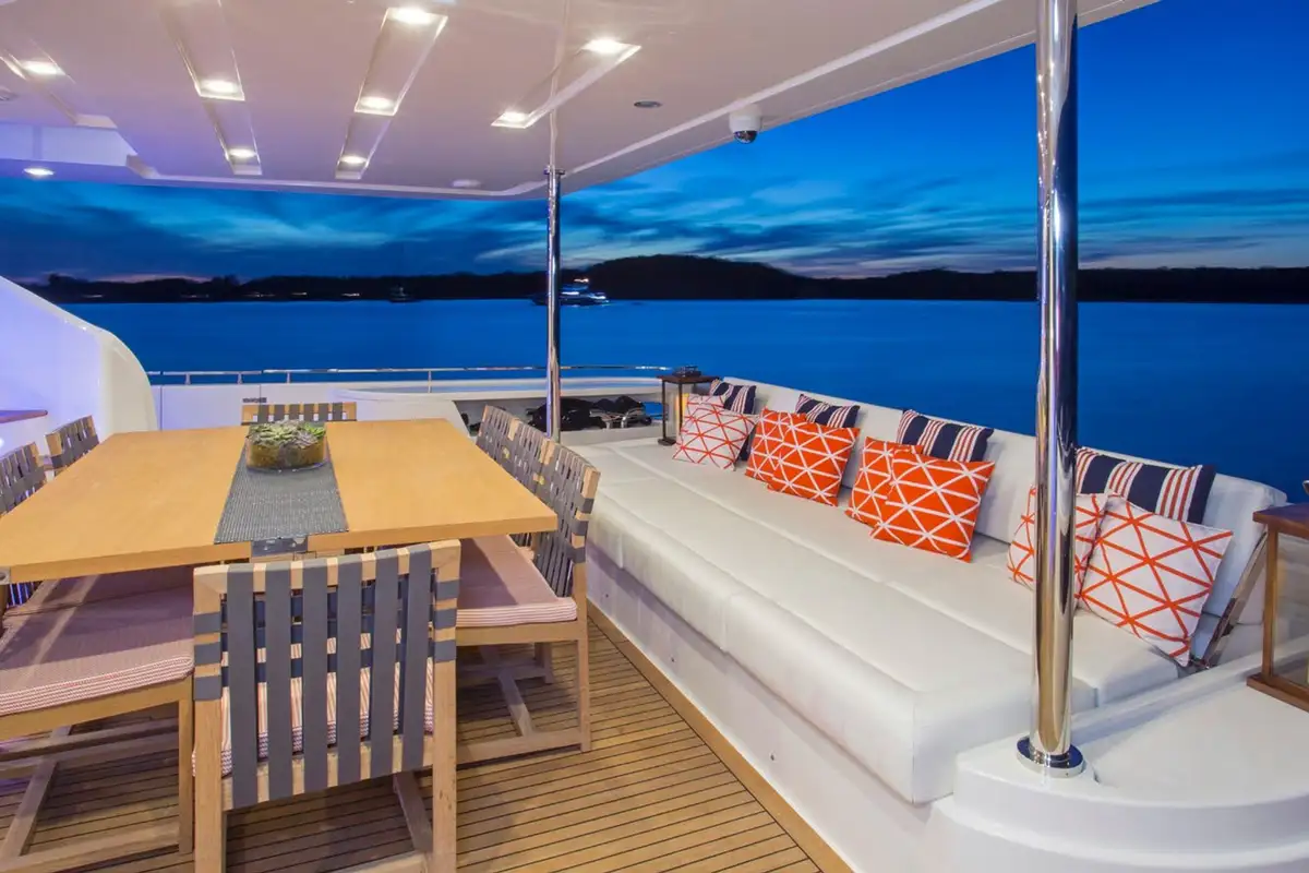 Her inside spaces are bright, clean and beautifully finished in luxe contemporary Italian style. The main deck saloon is fully glazed on both sides, with design classic sofas in a spacious, comfortable lounge and an elegant eight-seat dining table for memorable dining experiences.