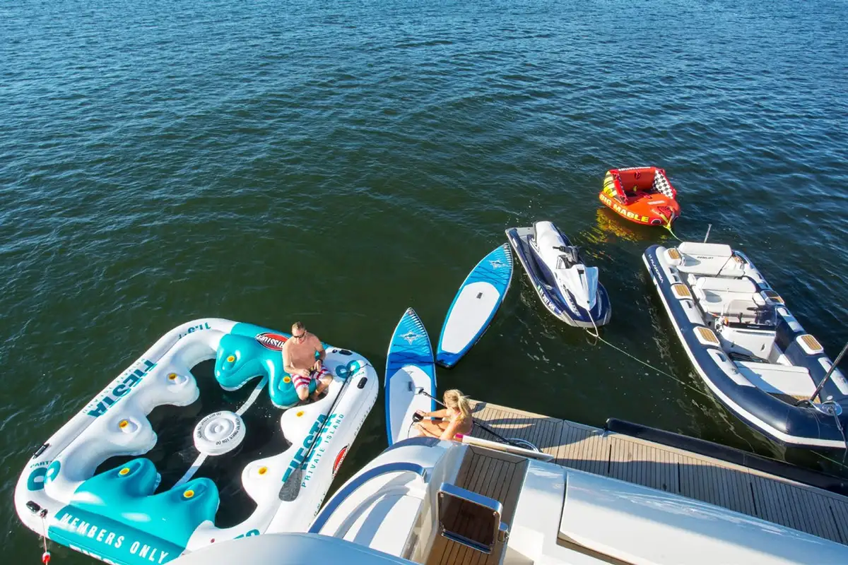 Her stern converts into a beach club that provides a great launch pad for watersports. Jet skiing, paddleboarding, a private island, high-speed rides behind the RIB on an inflatable tow… Back on board, the main deck saloon opens up with a balcony terrace to create an inside/outside living space. She’s very well set up to maximise the pleasure of being on the water.