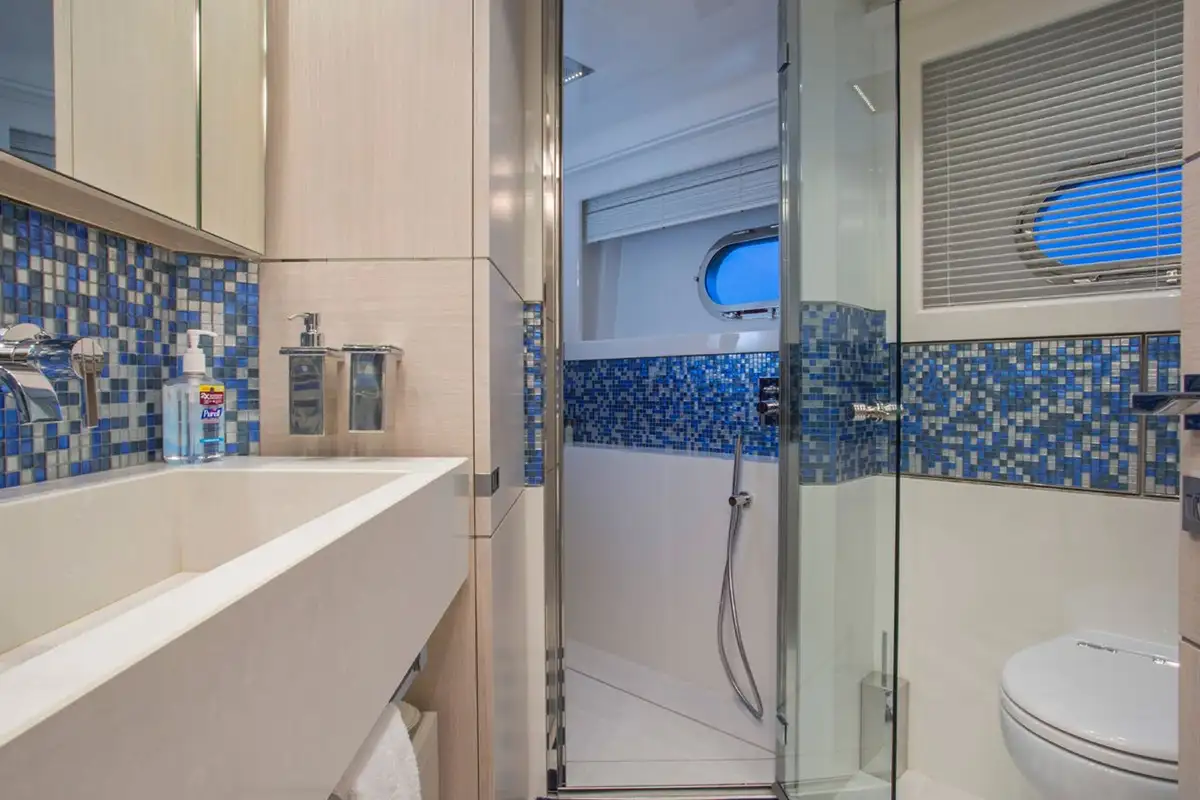 Up forward on the main deck, you’ll find the master suite with a chaise-tongue on one side of the king size bed, a desk on the other and a luxurious full-beam en suite bathroom. The lower deck guest cabins, as well as the master cabin, all have big plate glass windows so everyone wakes up with a great sea view.