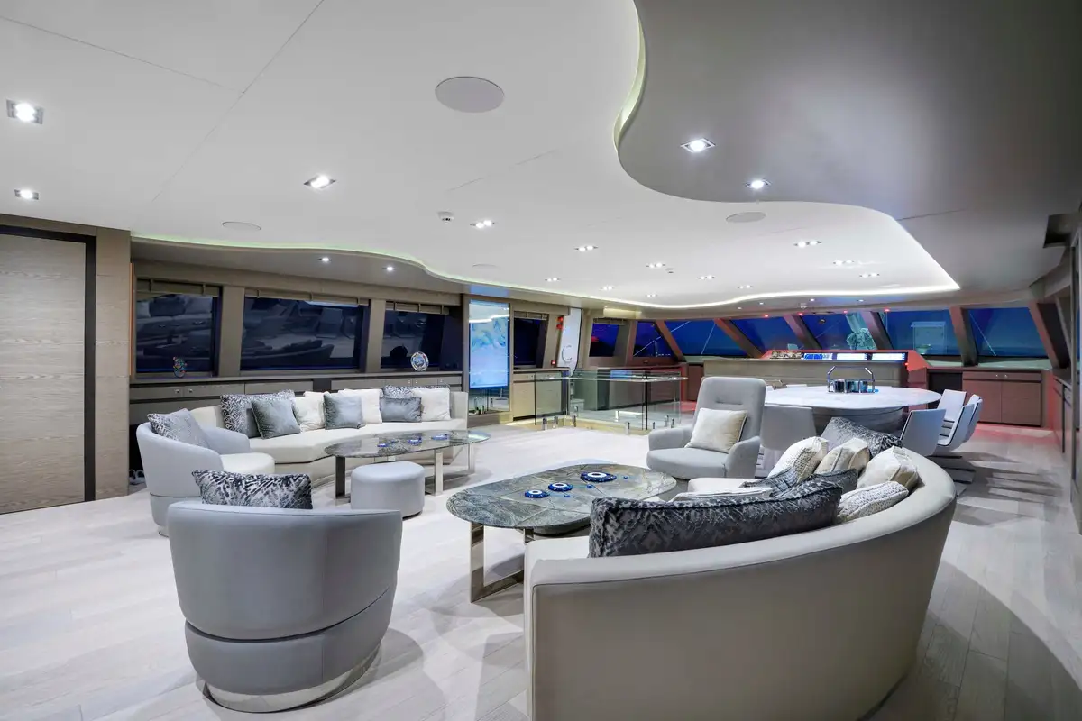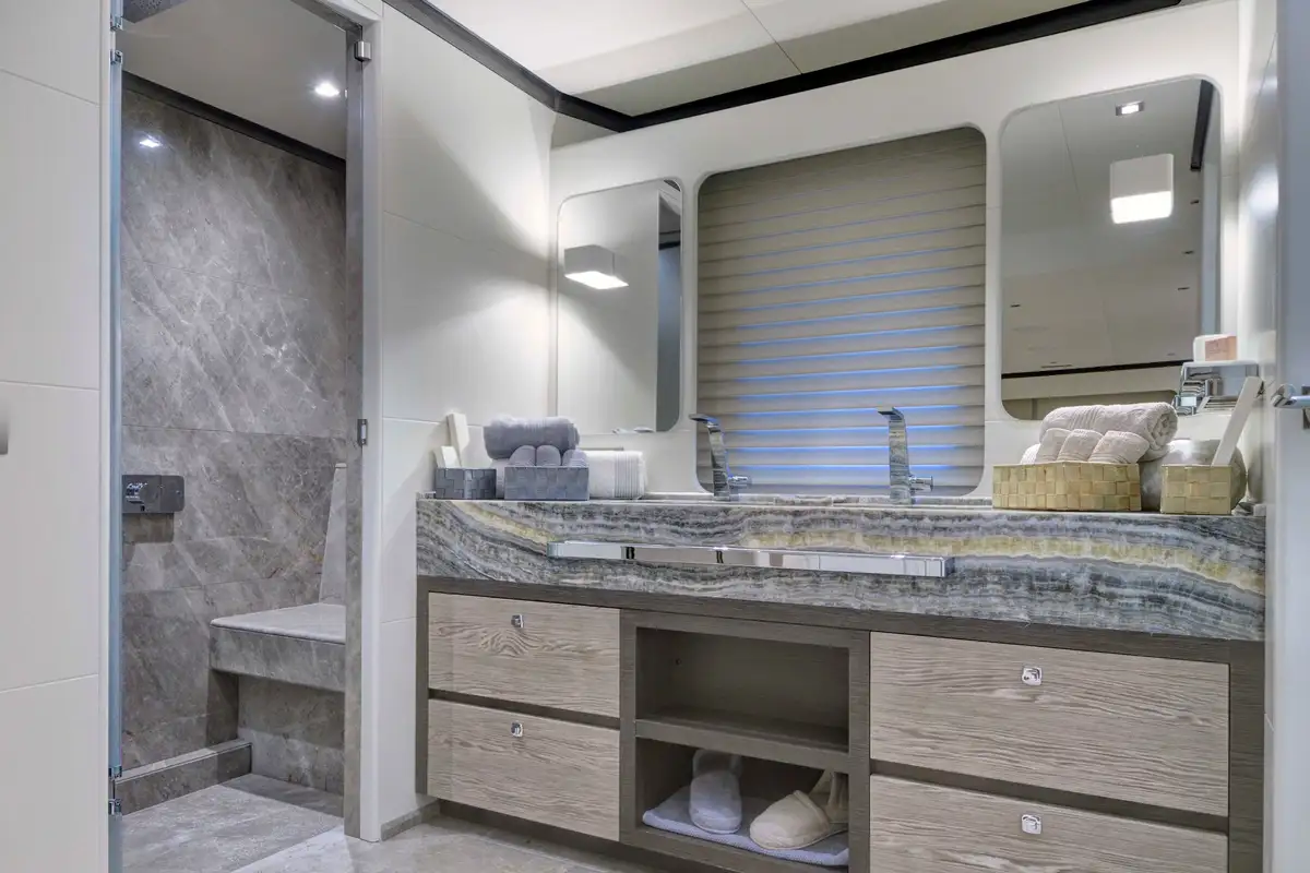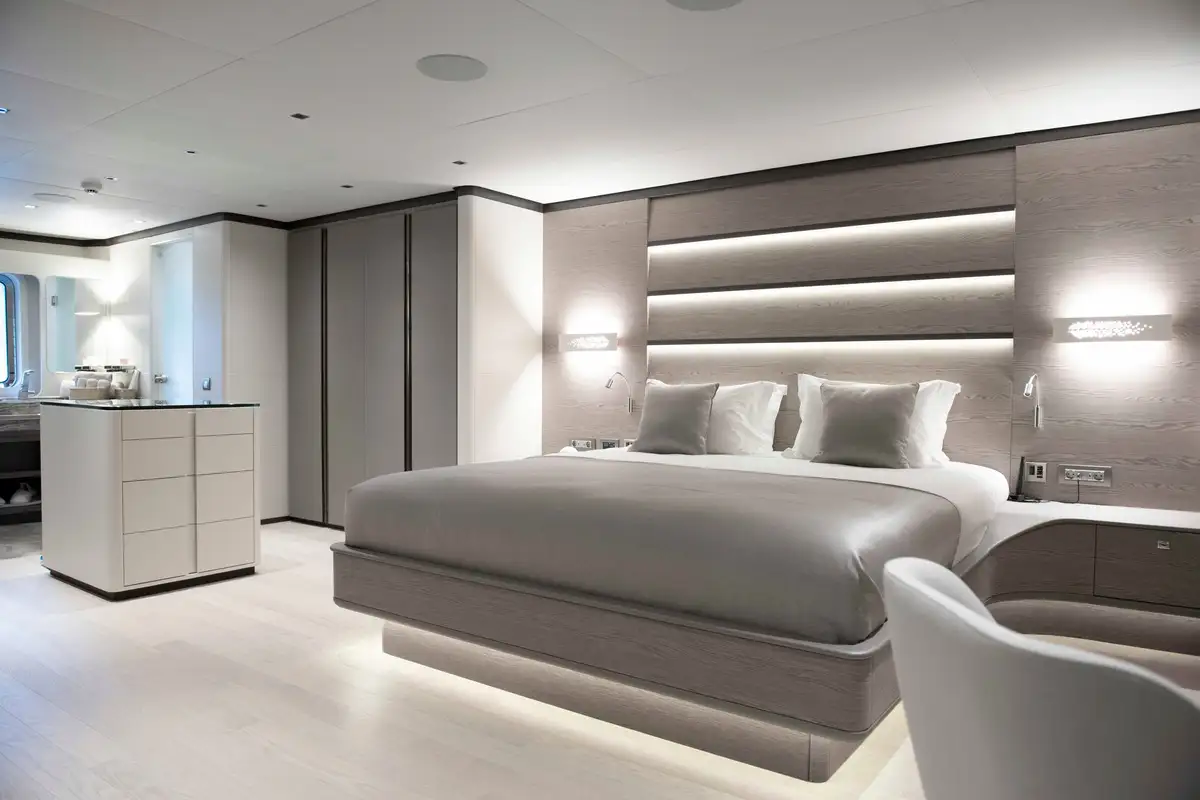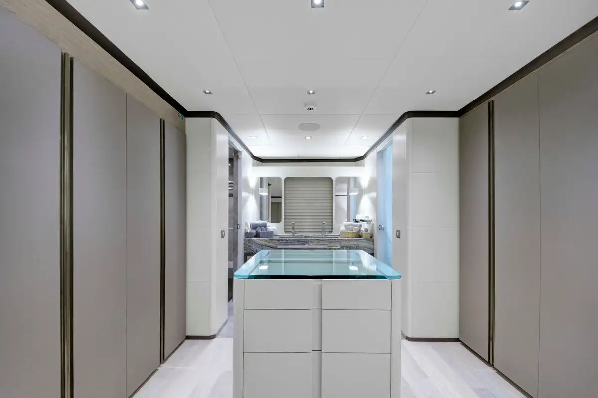 The primary guest can enjoy the space and luxury of the huge full-beam master suite. It is located ahead and benefits from a dressing room, en suite bathroom, and a large private lounge area. There is another full-beam suite aft; this double VIP suite has an en suite bathroom, dressing room area, sofa and desk space. Between these two delightful suites, four en suite guest suites all share the stylish and tasteful style found throughout this beautiful yacht.