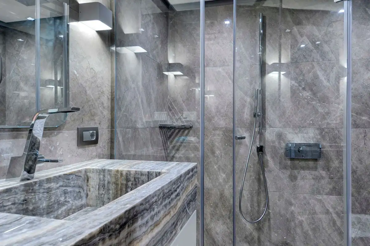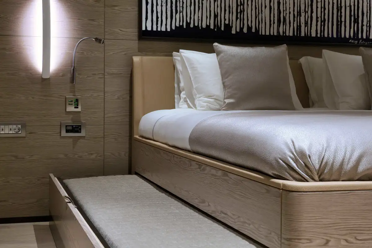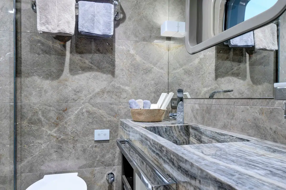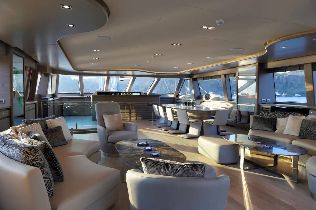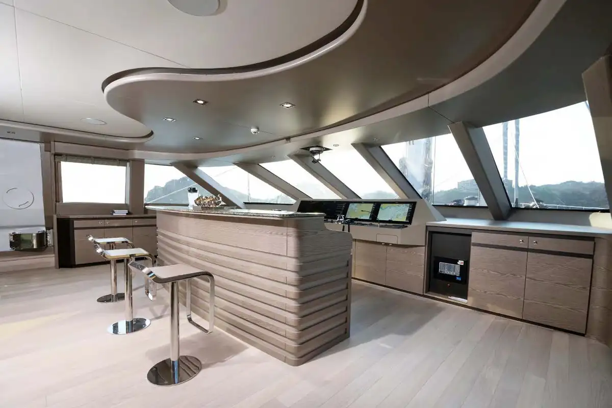 The primary guest can enjoy the space and luxury of the huge full-beam master suite. It is located ahead and benefits from a dressing room, en suite bathroom, and a large private lounge area. There is another full-beam suite aft; this double VIP suite has an en suite bathroom, dressing room area, sofa and desk space. Between these two delightful suites, four en suite guest suites all share the stylish and tasteful style found throughout this beautiful yacht.