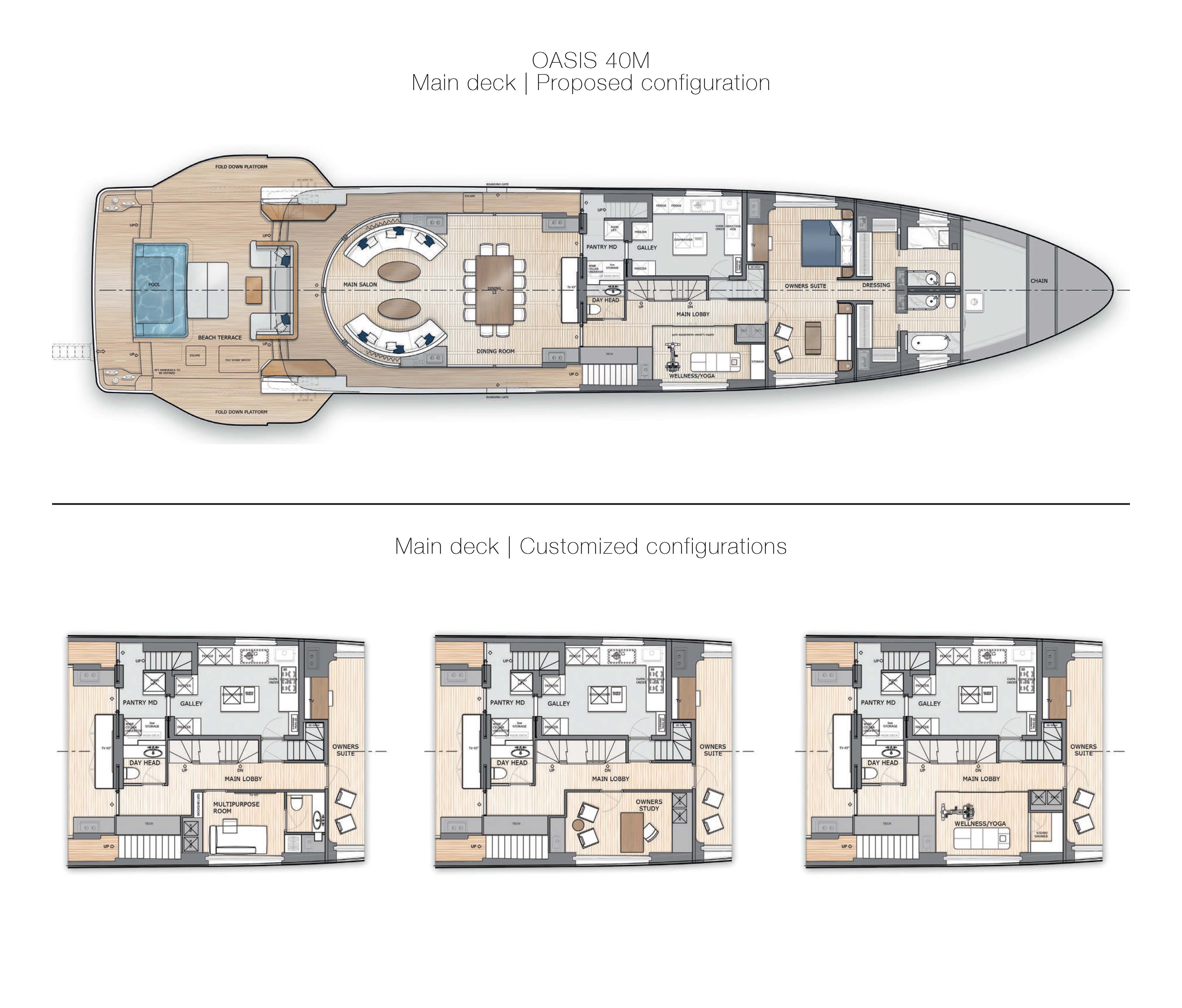 The master suite is a full-beam cabin at the forward end of the main deck with a seating area on one side of the main cabin, a big walk-in wardrobe and a marble en suite bathroom. The other four cabins on the lower deck include two VIP doubles and two twins.