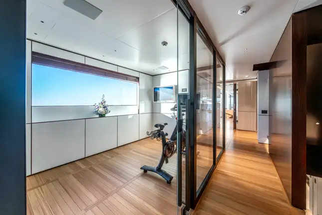 Designed to host 10 guests in five cabins with service from a crew of nine, she has a host of special features including a dedicated gym/wellness centre. An elevator connects all three levels from the main deck up to the sundeck and she’s wheelchair accessible throughout. The master suite has an outdoor balcony. The vast, elongated stern with its big heated pool, mezzanine lounge and fold-down side terraces is a stand-out highlight.