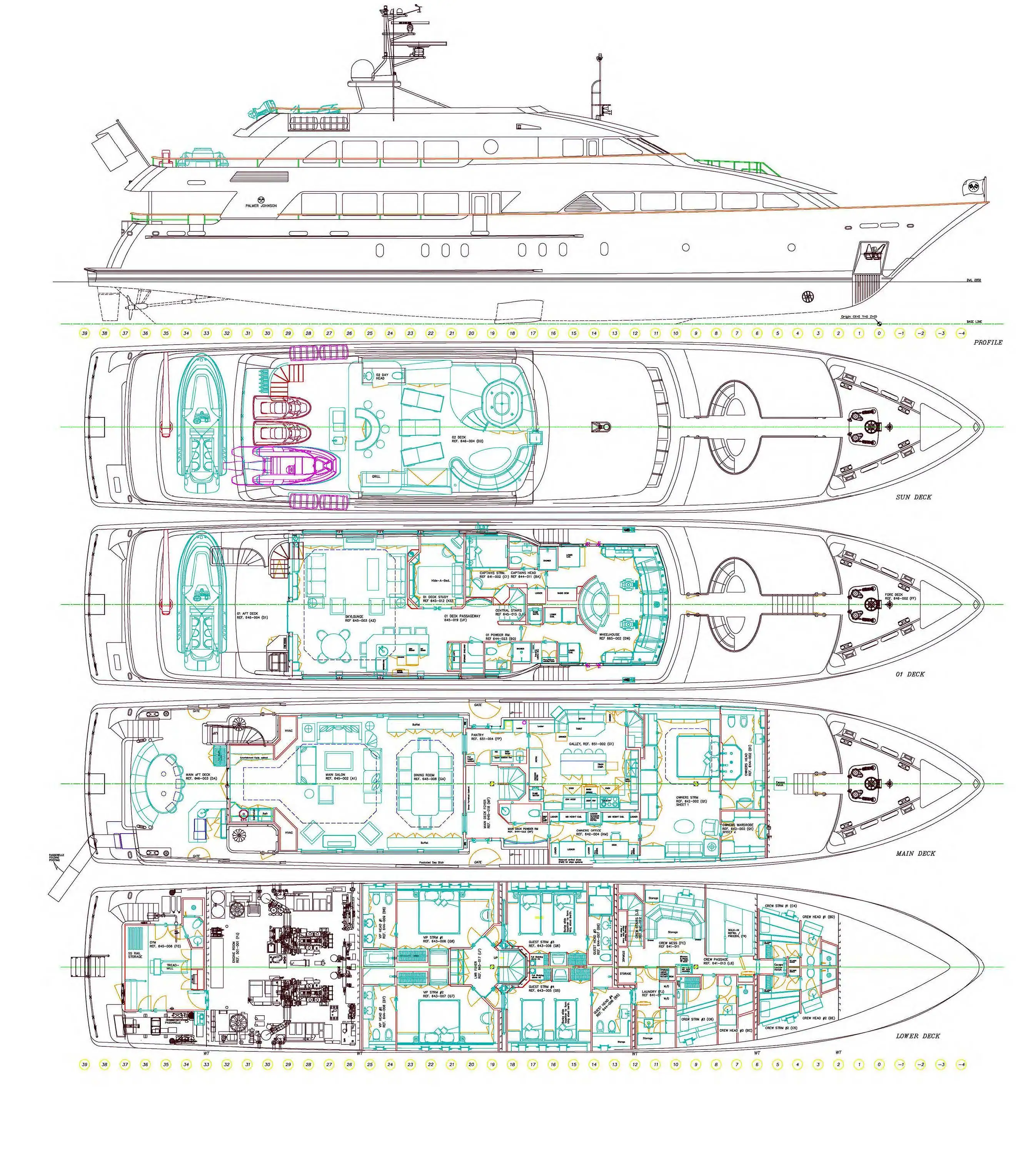 Knowles and the owner left no stone unturned when it came to scope of this project. The redesign, following the concept of a chic modern beach house, spans across all owner and guest interior areas, includes new finishes and new stone works throughout as well as on the main aft deck, bridge aft deck, sun deck & day head, stern beach club and the gym & gym head. A new forward crew cabin was added to accommodate additional crew members which will be instrumental in providing the utmost superb service to owners and charter guests alike. All interior furniture is custom manufactured to help maximize each space. Plans also include a replacement of all plumbing, hardware, lighting, lighting controls, and outlets, and a full audio visual upgrade.
