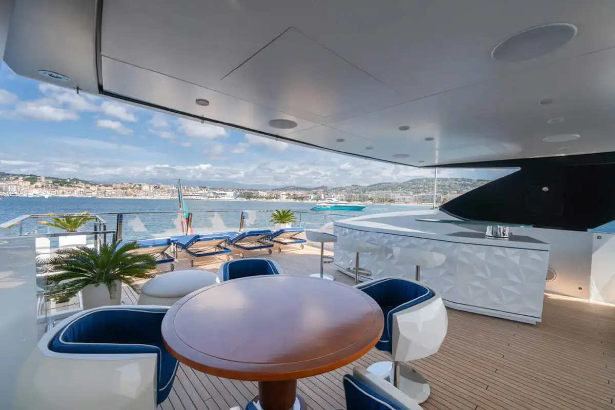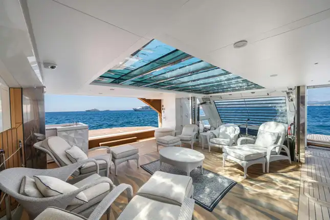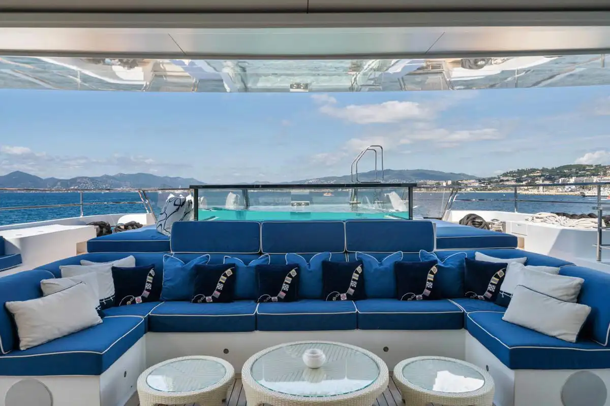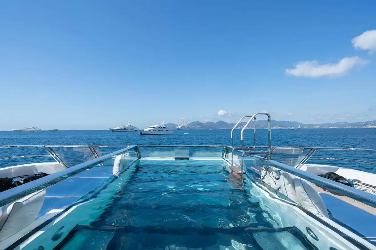 Each deck is designed with ease and elegance in mind. A glass-edged infinity pool defines the foredeck, offering a still-water perspective on the shifting horizon. Below, the beach club connects directly to the sea a place to pause between swims or prepare for time on the water. The upper deck aft offers shaded dining that flows into a relaxed lounge, ideal for conversation, long lunches or simply watching the light move across the sea. On the sun deck, a jacuzzi and bar are framed by open views in every direction.