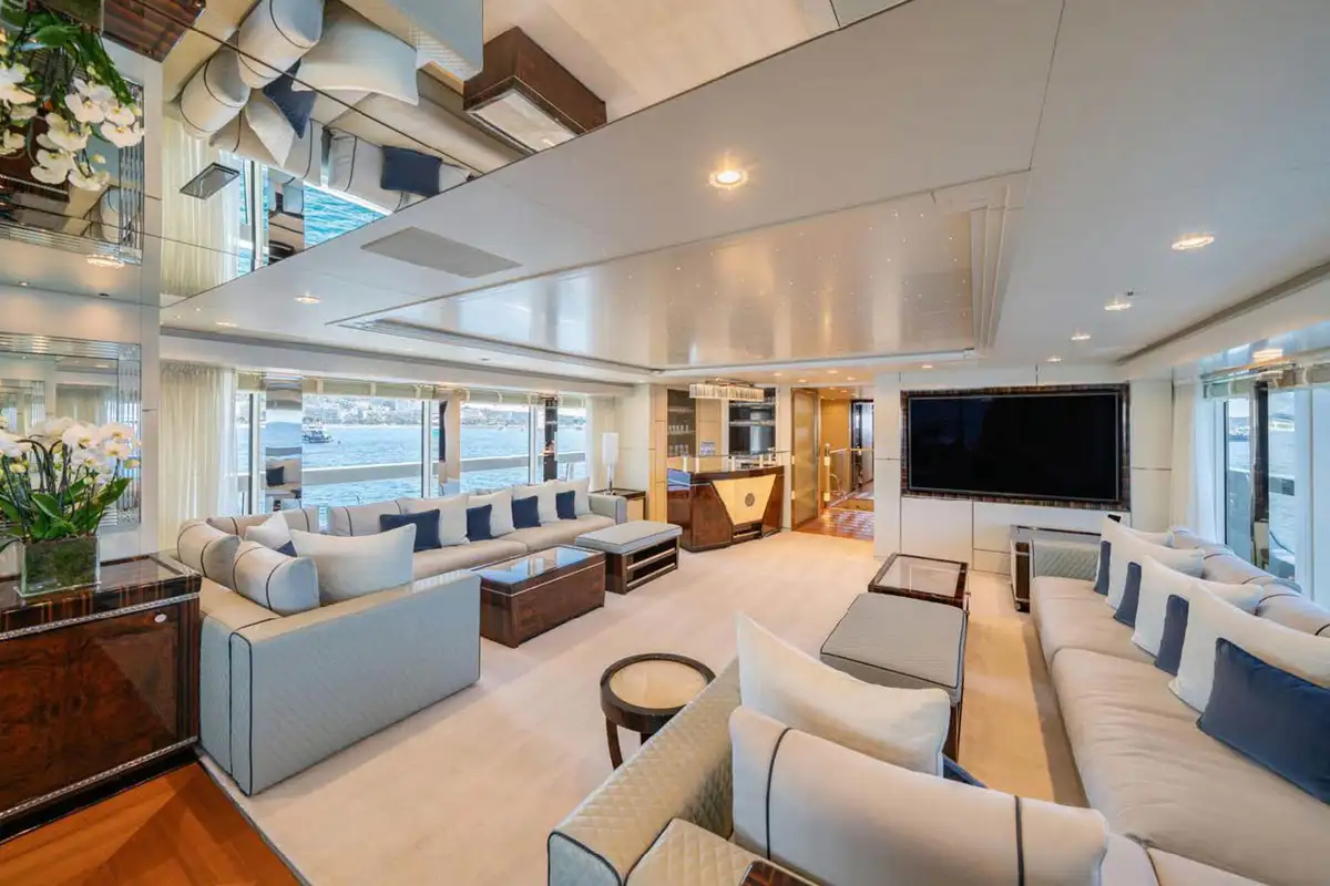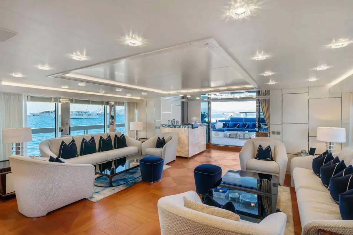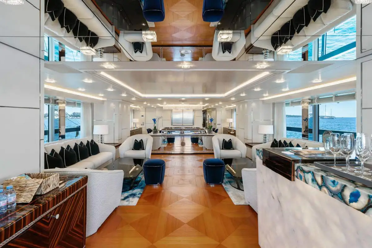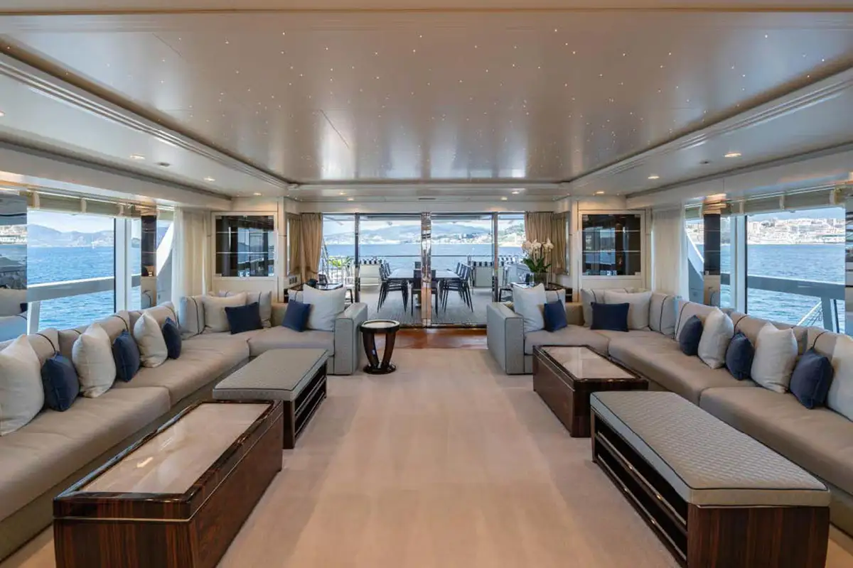 Inside, the atmosphere is calm and cohesive. Floor-to-ceiling windows fill the main deck lounge with natural light, while neutral tones and textured finishes create a space that is both contemporary and timeless. There is no need to embellish what already feels thoughtful and complete.