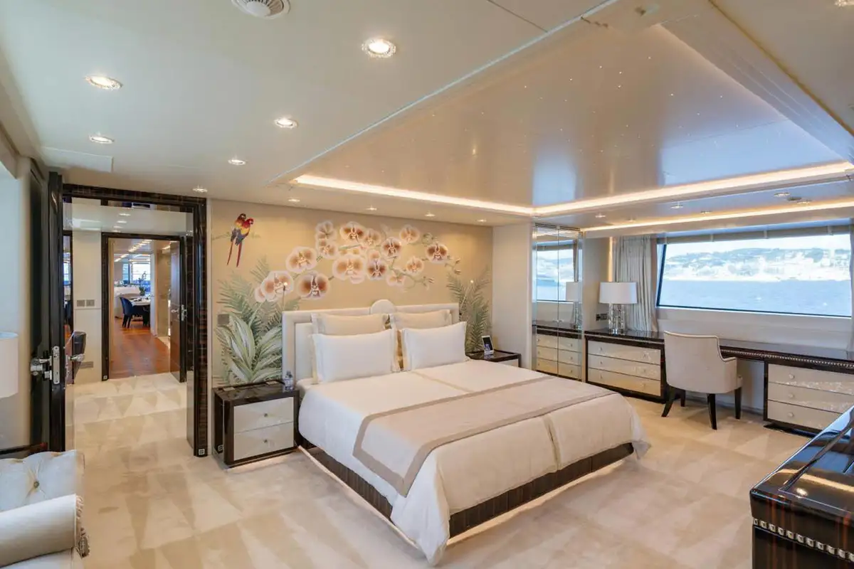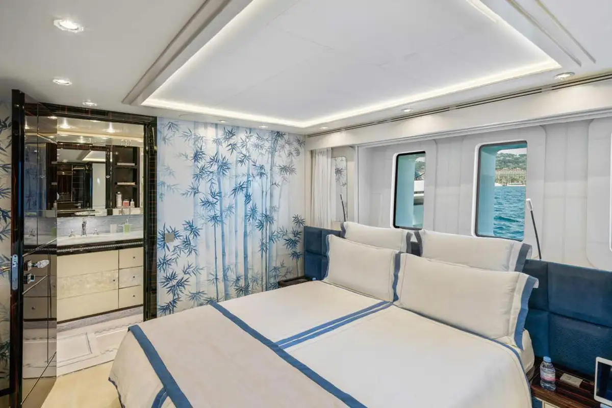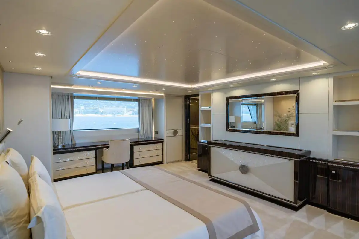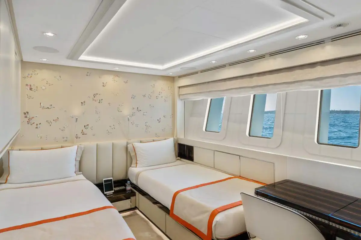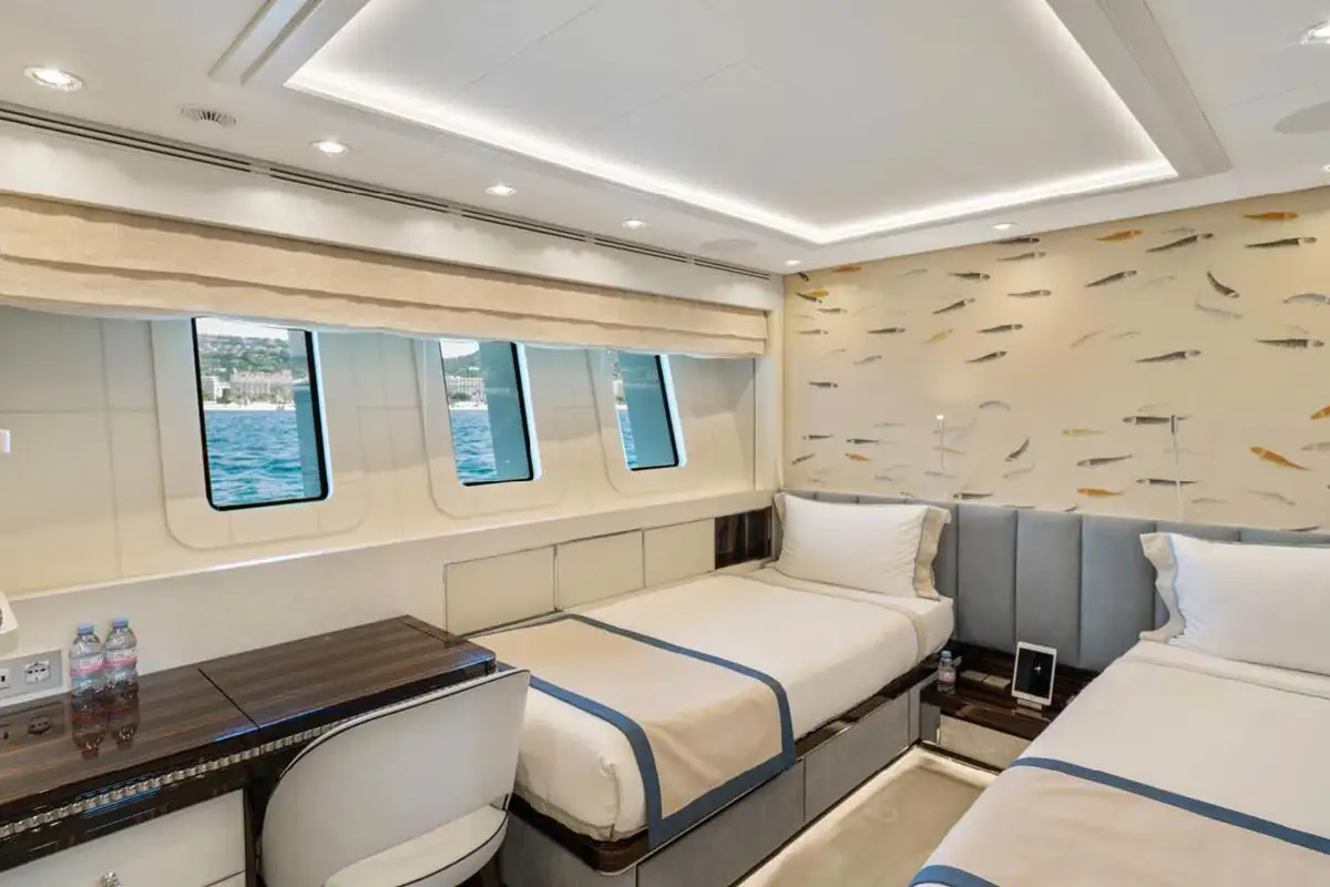 Twelve guests are welcomed across six suites. The principal cabin is located forward on the main deck, with a private study and commanding views. Additional guest cabins are arranged with quiet flexibility, offering comfort for families or well-matched groups.
