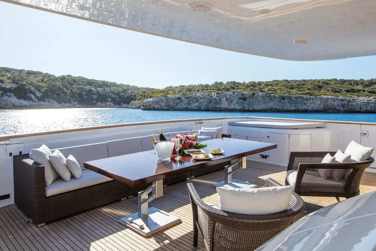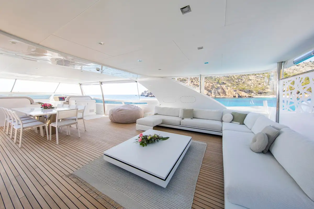 The fully covered sun deck with a large seating lounge and al fresco dining table is the ideal spot to enjoy the days and evenings in privacy on board. For those looking to get that perfect tan, there are sun pads at the bow to relax in a quiet environment. A large swim platform aft is perfect for swimming and launching the toys while also offering an alternative sunbathing area.