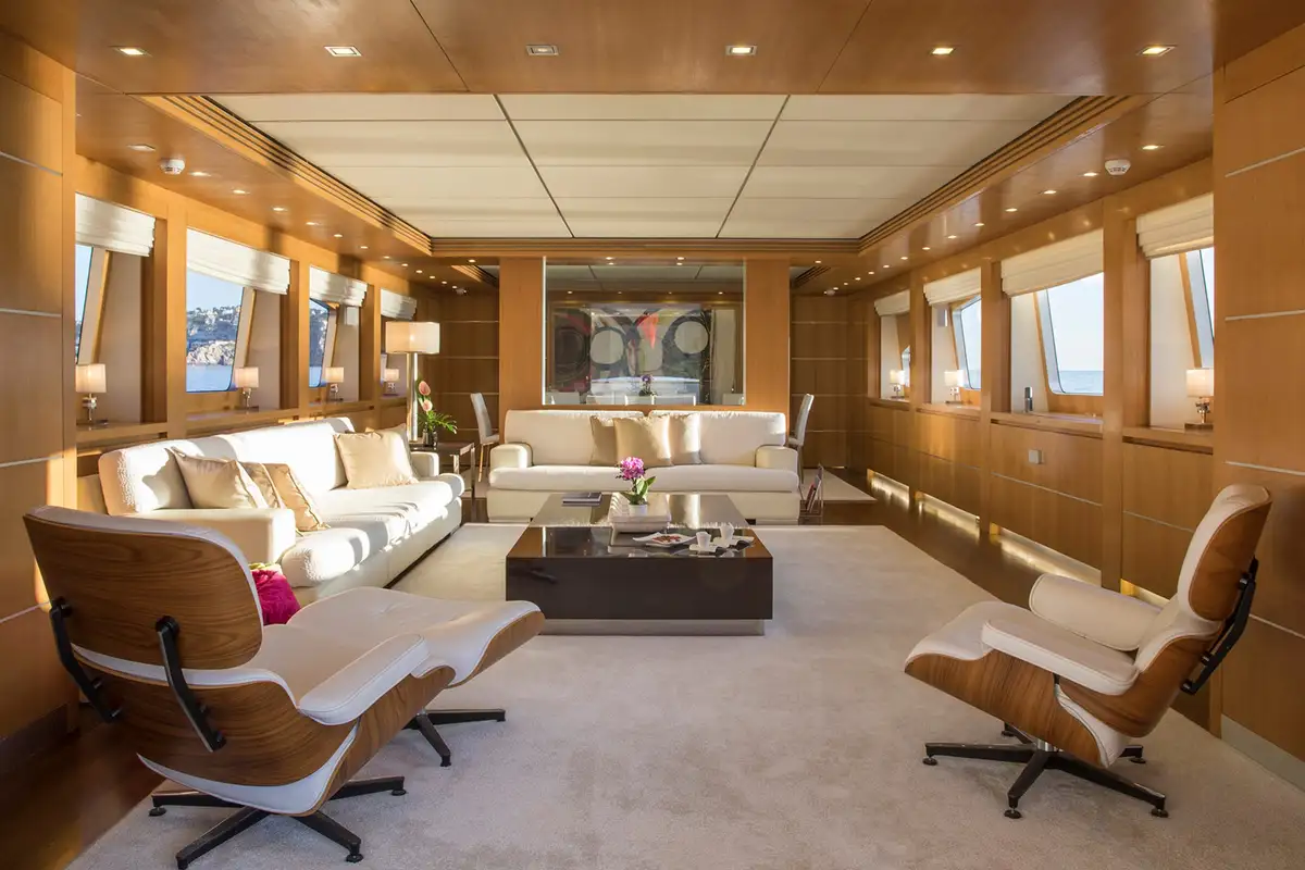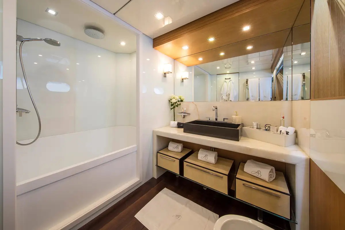 She offers a bright, airy lounge in soft tones and fabrics with sofas and stylish Eames chairs, which leads to a formal dining area forward. The beautiful wooden floor throughout the yacht gives a zen feeling and an inviting sense of warmth. Accommodation for twelve guests is on the lower deck and comprises a master cabin, two double VIPs and two twins each with a pullman berth. All are beautifully appointed and uncluttered for maximum ease.