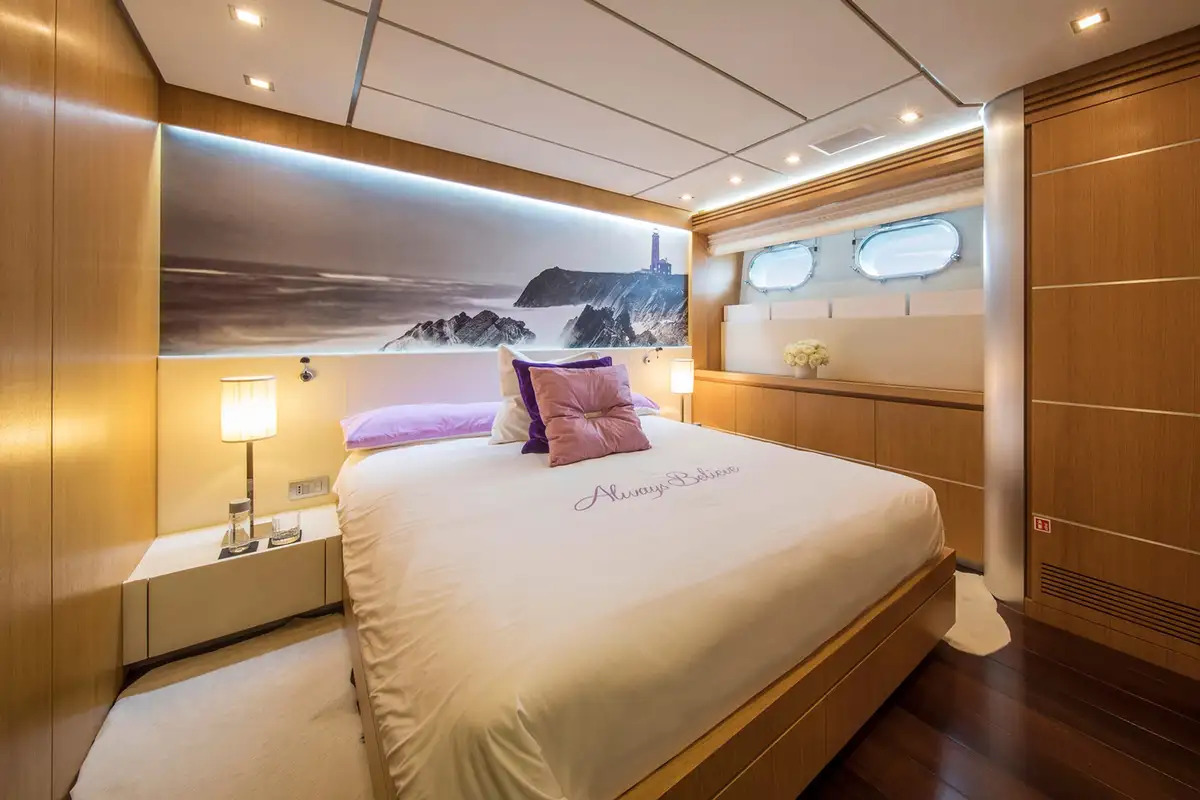 With her sleek profile and exhilarating 30 knot performance, ALWAYS BELIEVE is a fantastic modern yacht to cruise the Mediterranean in style. Family and friends will be delighted by her light interiors and excellent exterior areas.