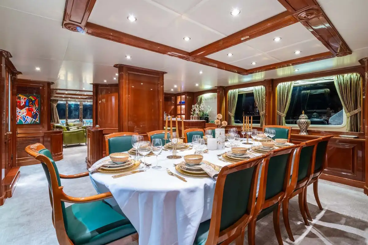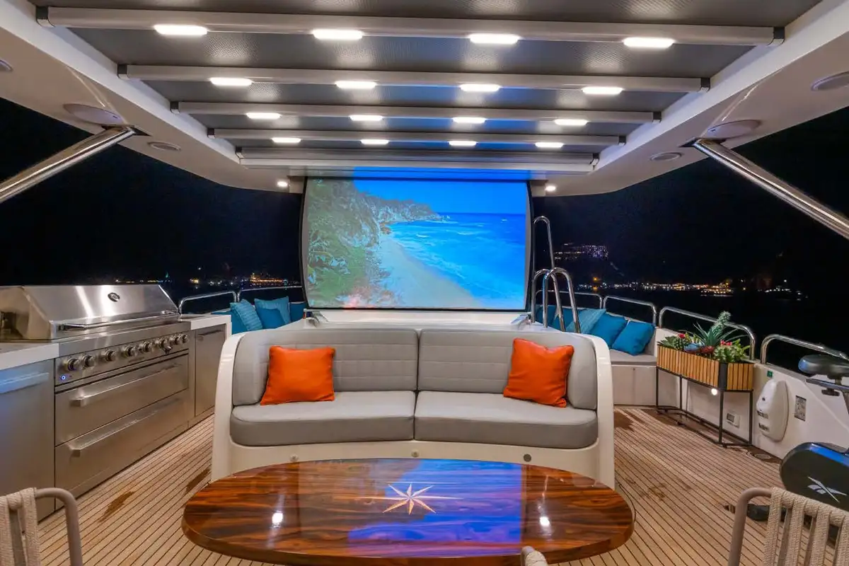 On deck, AMADEA offers multiple al fresco dining and lounging areas. The sun deck features a retractable roof, jacuzzi, expansive sun pads, and a BBQ station, while a projector screen and surround sound create an unforgettable open-air cinema experience. Elegant dining can also be enjoyed on the main and upper decks, each centred around striking varnished wood tables.
