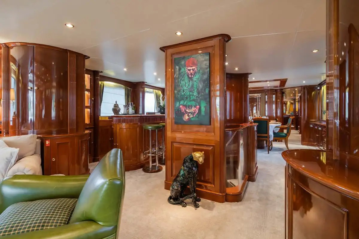 Her interior exudes timeless charm, with classic dark woods, light ceilings, and vibrant artworks lending character throughout the open-plan main lounge, dining area, and bar. For a more intimate setting, the media room offers a cosy space ideal for movie nights.