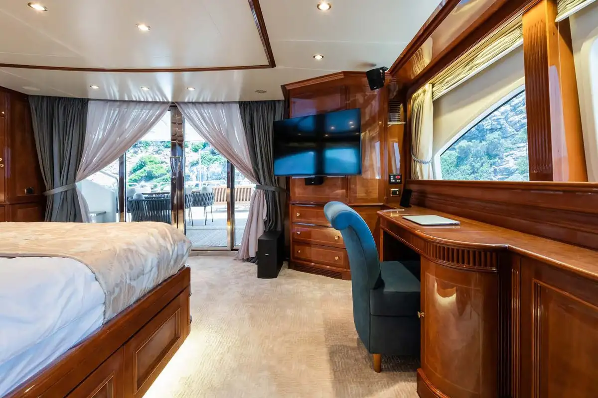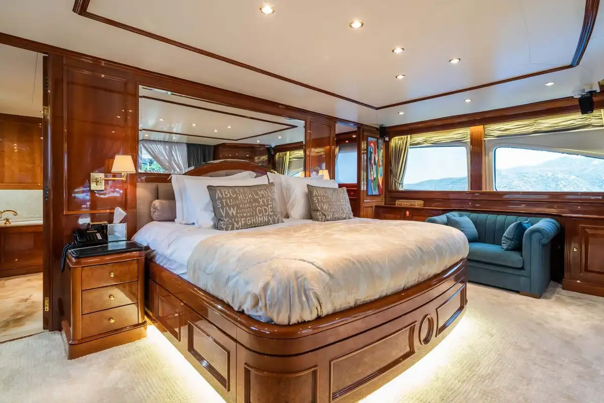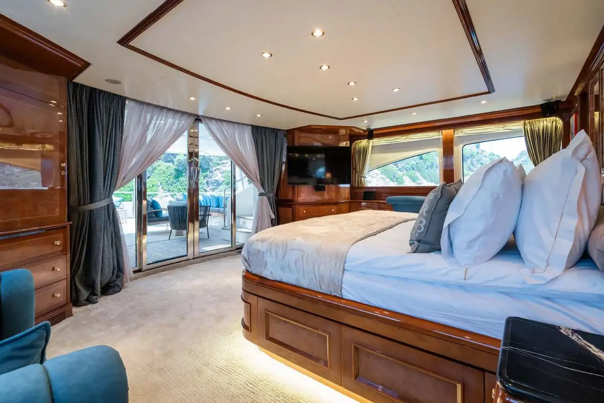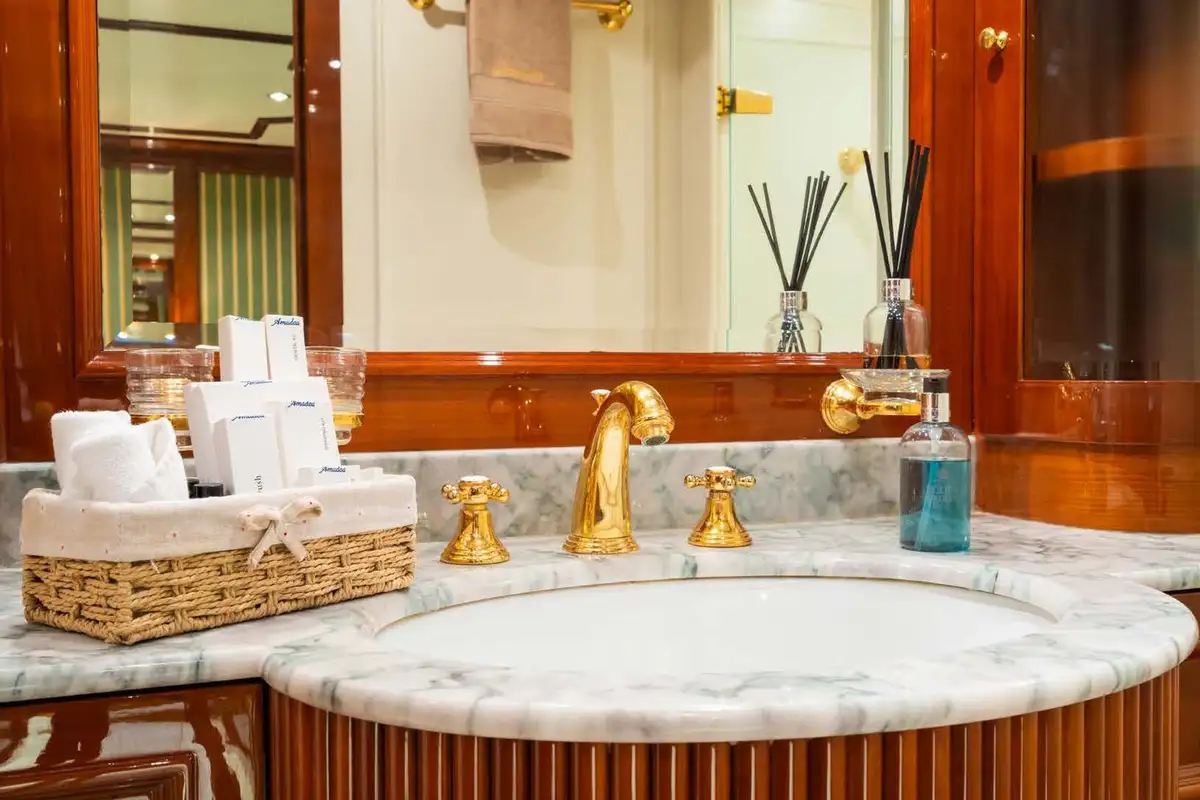 AMADEA accommodates up to 10 guests in four spacious cabins. The full-beam master suite, located on the upper deck, offers direct access to the exterior. On the lower deck, a full-beam VIP and two twin cabins provide comfortable accommodation, while a king-sized sofa bed in the media room adds versatility.