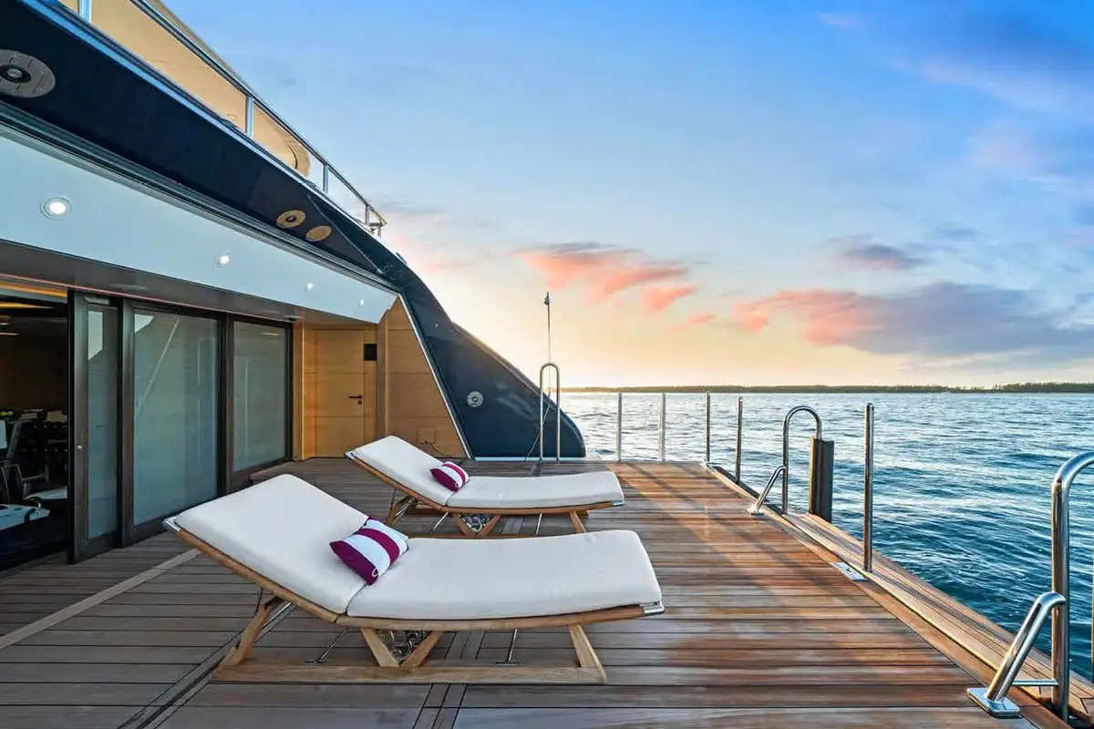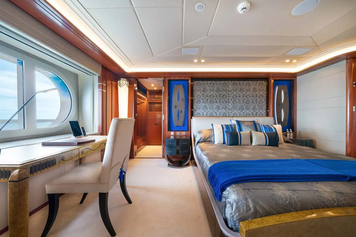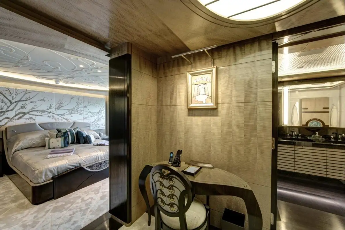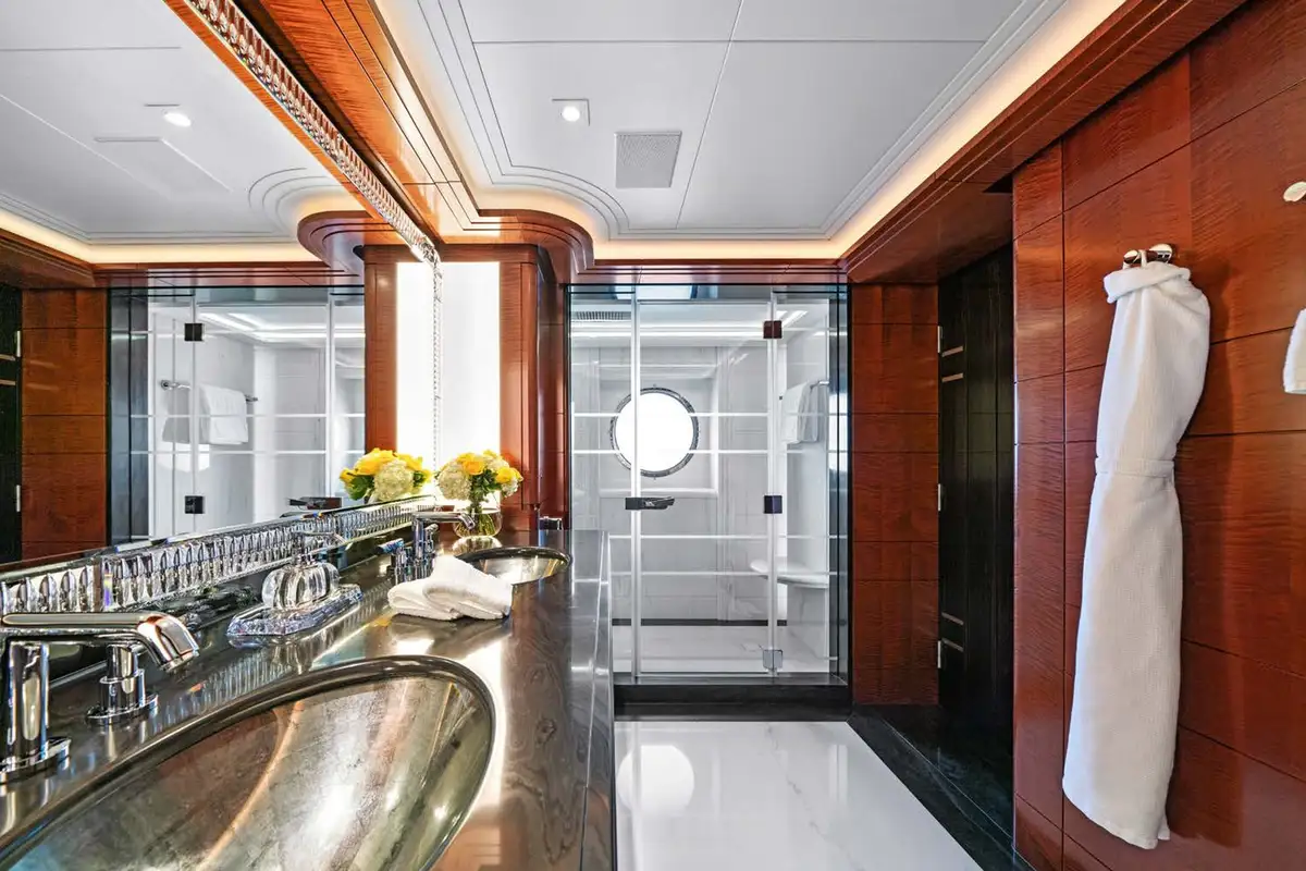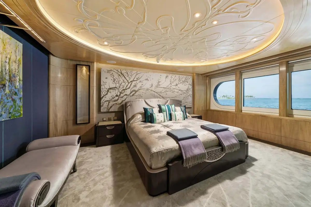 Back on board, freshen up in the yacht’s superb accommodation. Located on the upper deck, the full beam master suite provides uninterrupted panoramic views from the huge windows. It also has his and hers en suite bathrooms, separate dressing rooms, and direct access to a private terrace forward – the perfect spot for a private sundowner. The VIP suite is located on the main deck comprising a large berth with en suite, dressing room and spacious lobby, while there are a further four en suite guest cabins, three double cabins and one twin, on the lower deck.
