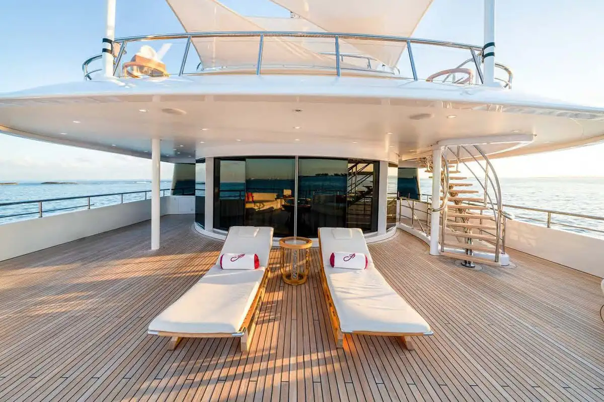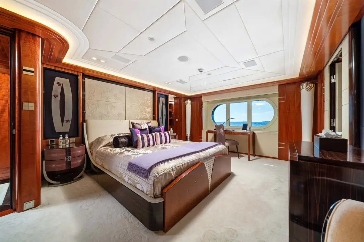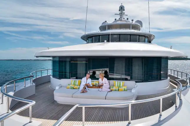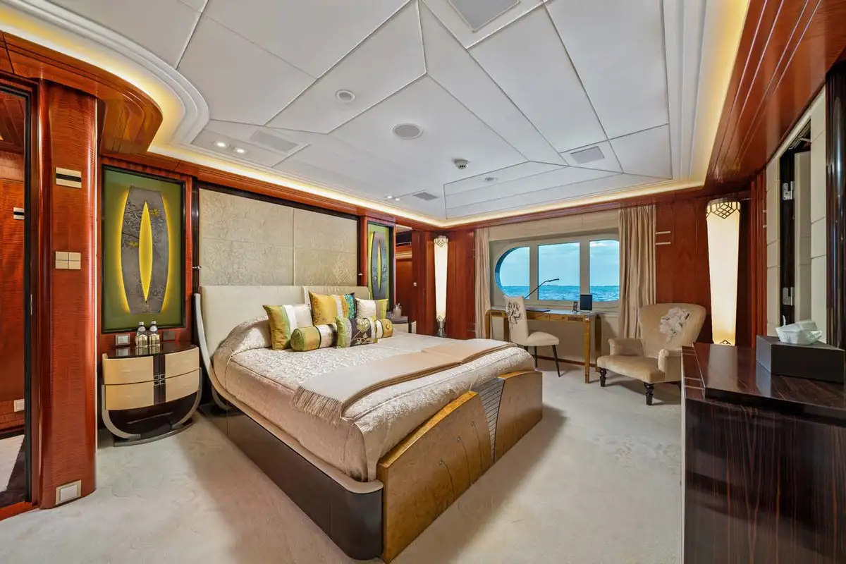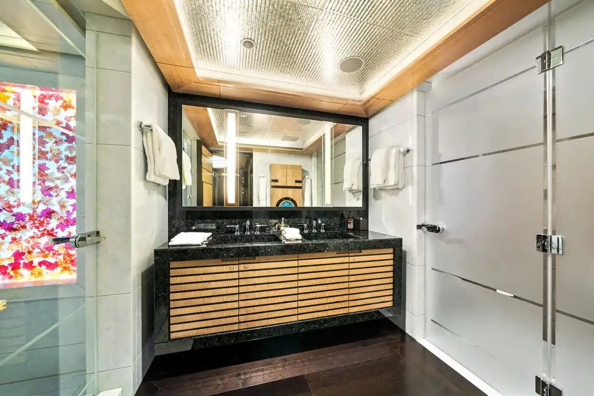 Back on board, freshen up in the yacht’s superb accommodation. Located on the upper deck, the full beam master suite provides uninterrupted panoramic views from the huge windows. It also has his and hers en suite bathrooms, separate dressing rooms, and direct access to a private terrace forward – the perfect spot for a private sundowner. The VIP suite is located on the main deck comprising a large berth with en suite, dressing room and spacious lobby, while there are a further four en suite guest cabins, three double cabins and one twin, on the lower deck.
