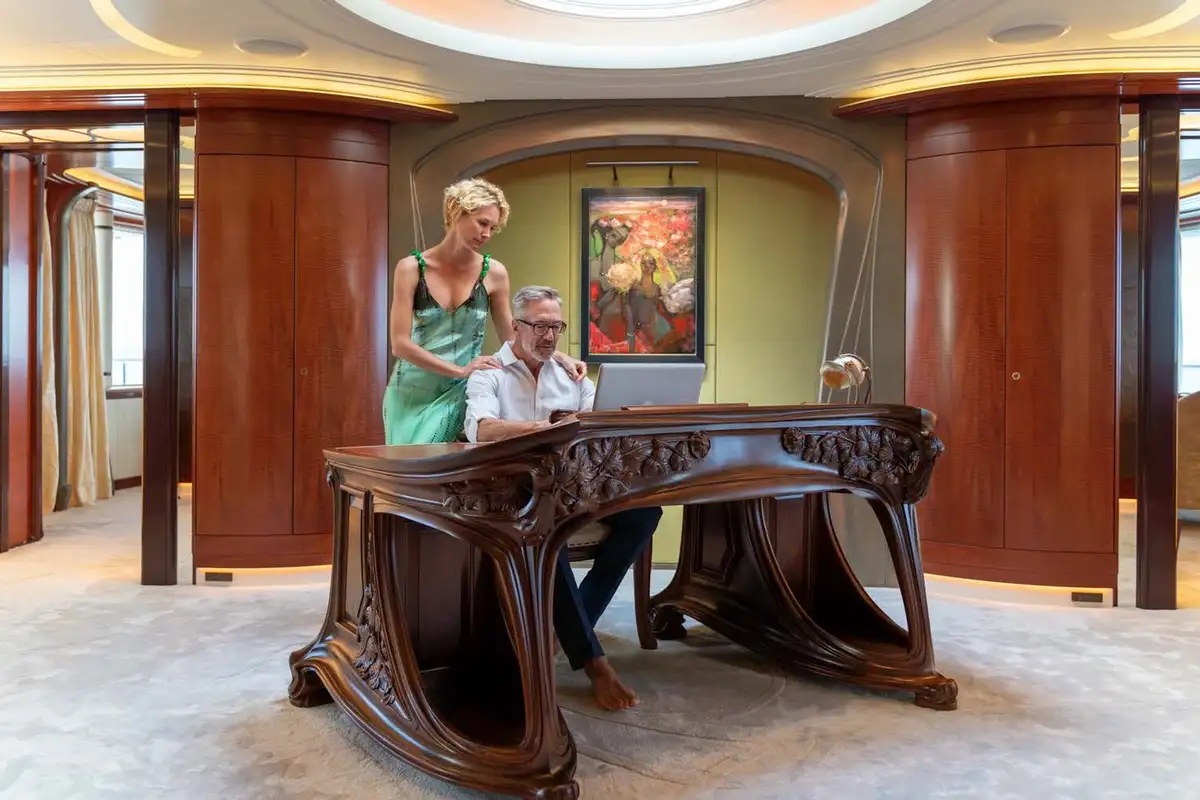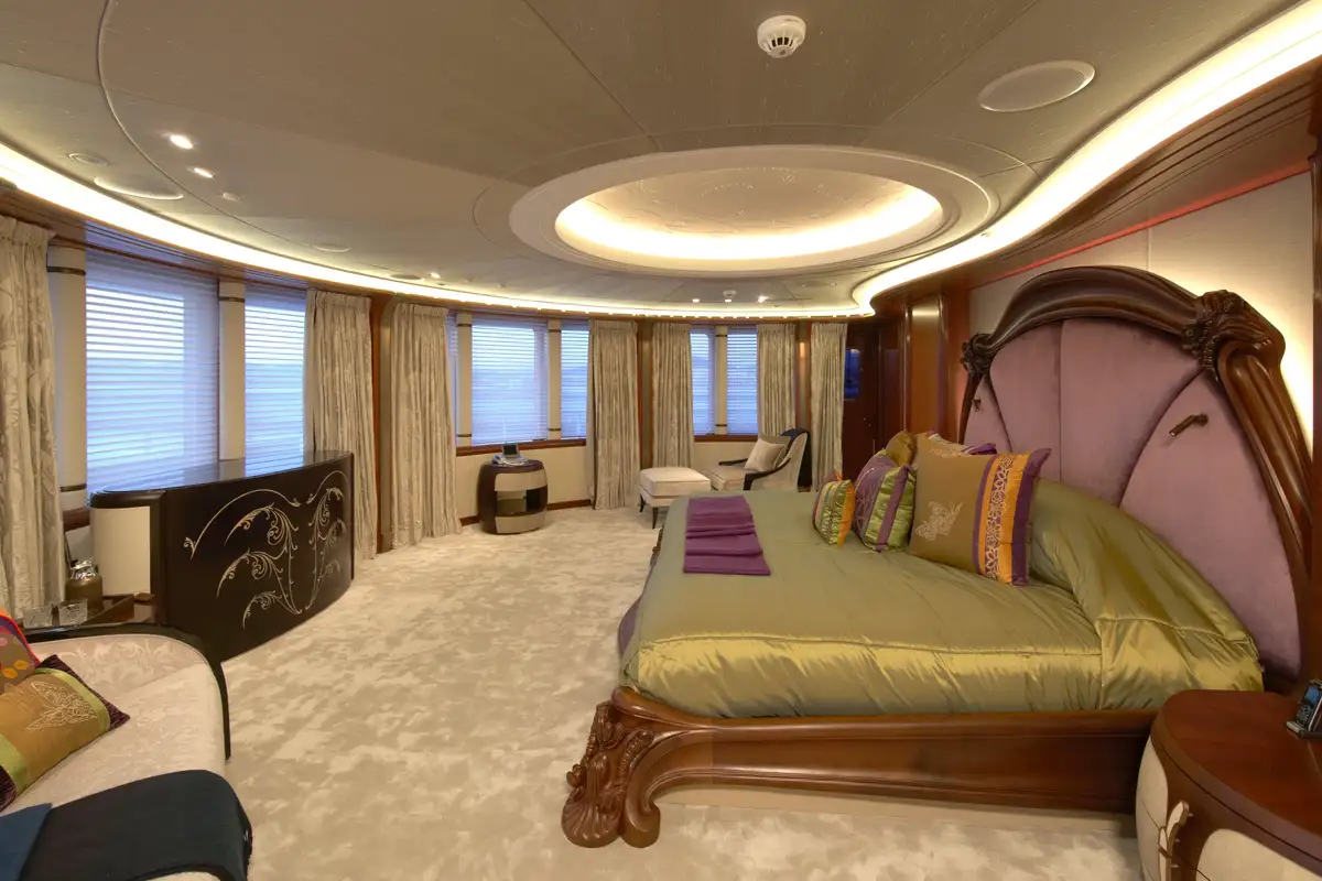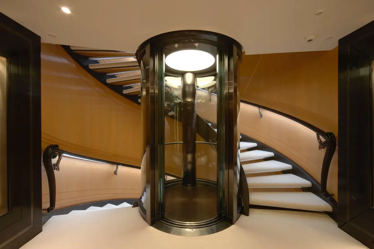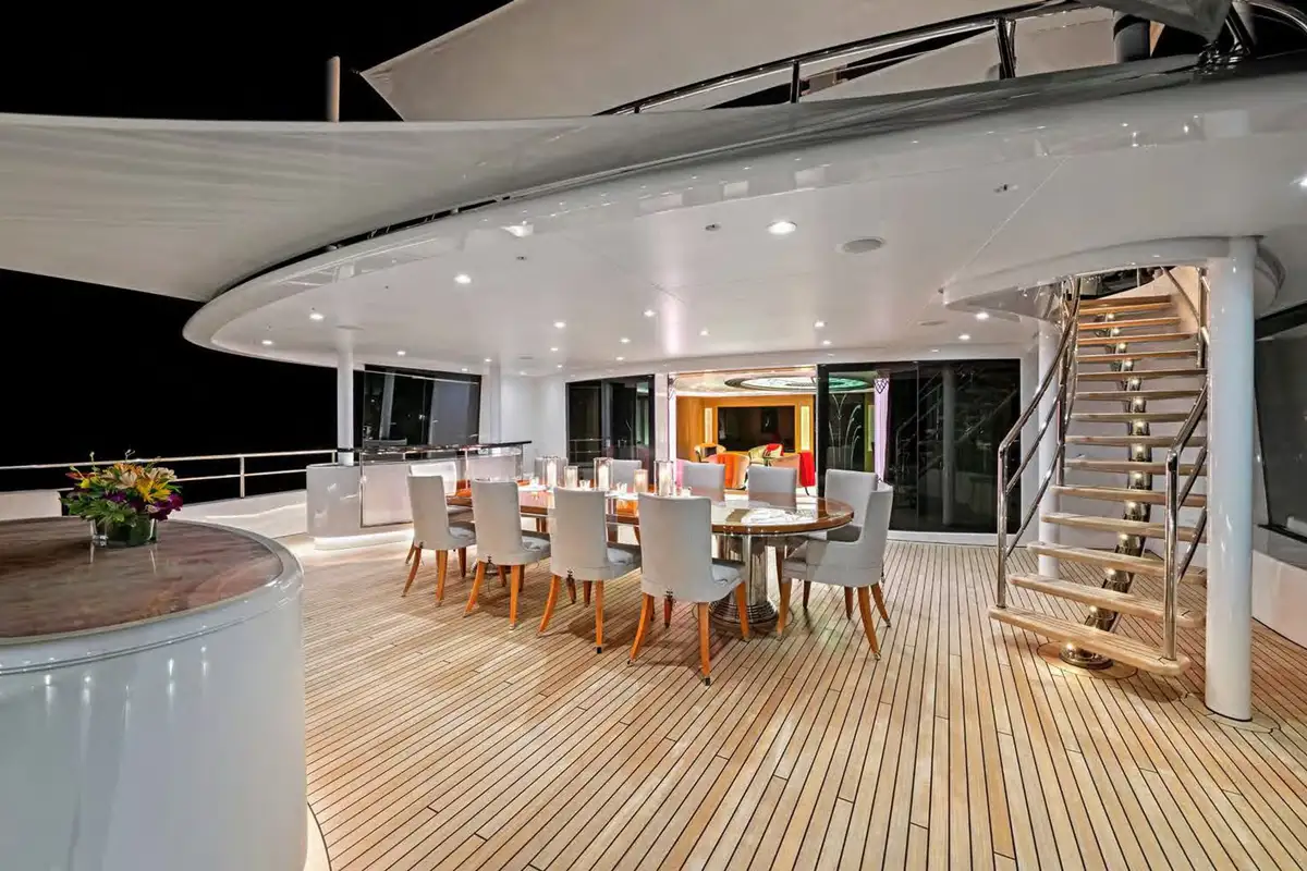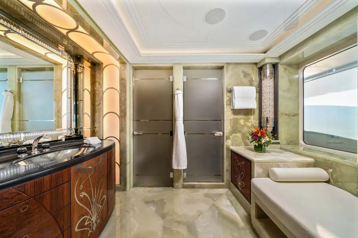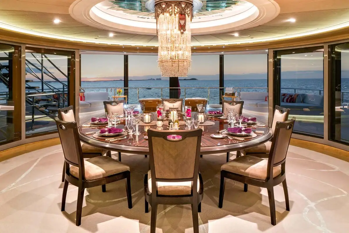 After your private sundowner, join your guests on the upper deck aft deck for pre-dinner cocktails while the chef prepares a delicious dinner for you to enjoy in the stunning formal dining area. Encircled with curved glass doors that can be opened to the elements, a circular table seats 12 guests beneath a bronze and crystal chandelier. After dinner, retire to the piano lounge, enjoy a movie on the large screen or head down to the main deck via the impressive central staircase or glass elevator and relax in the main saloon or the seating aft, sharing stories from the day and making plans for the morning. Relax, eat, sleep, repeat.