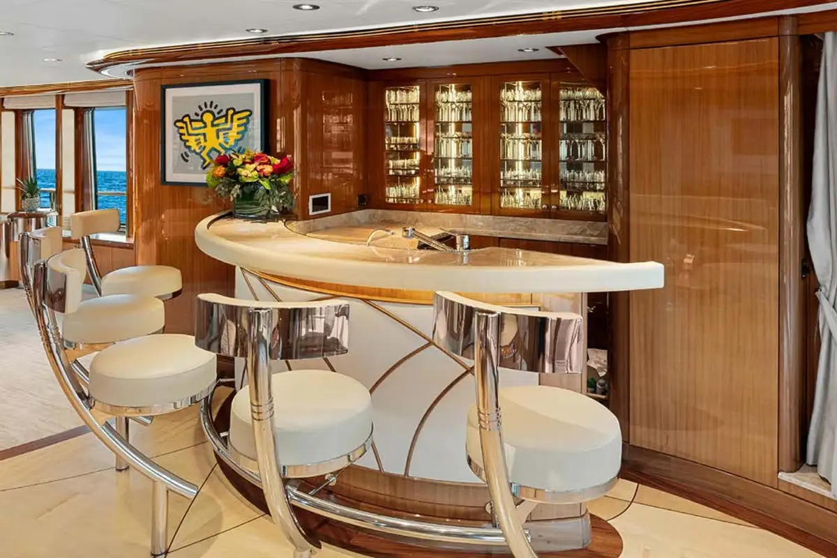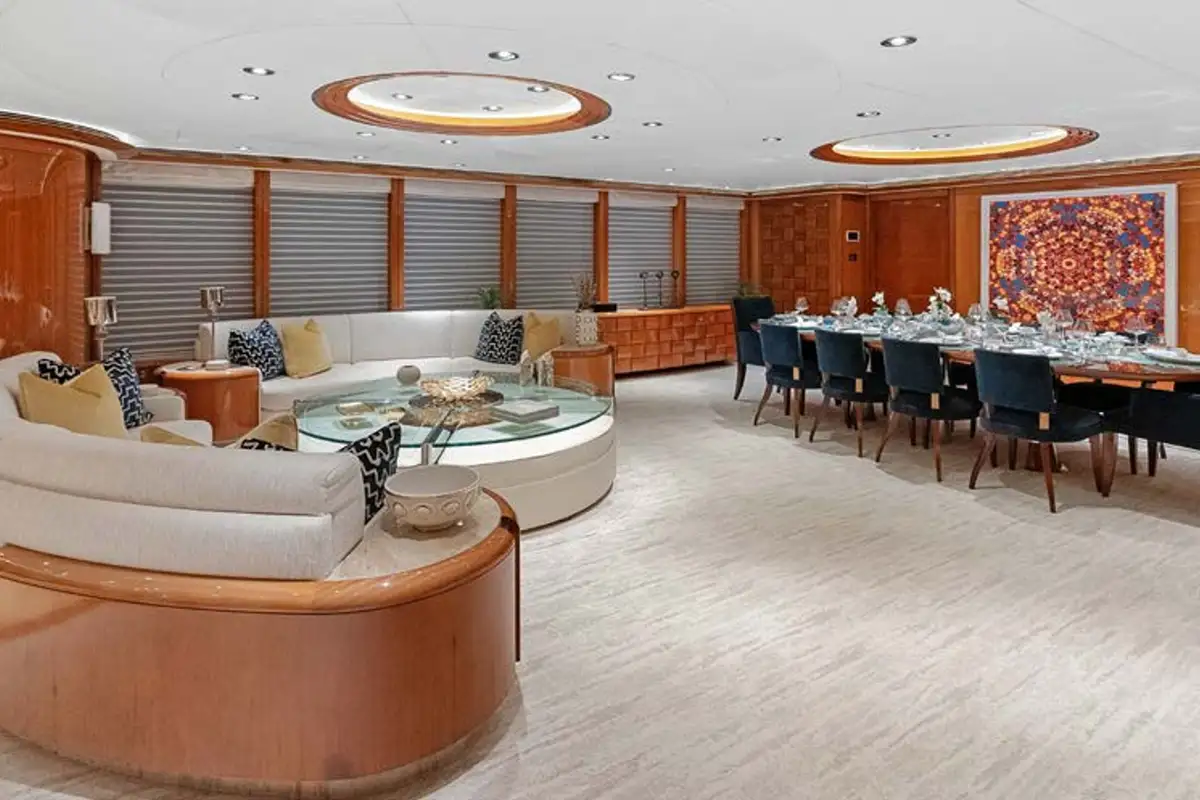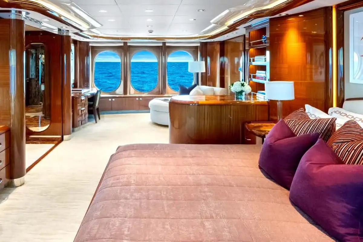 The main deck saloon has gorgeous flowing curves, a marble floor, iconic modern art, huge windows and a high-gloss hardwood finish. There’s a sleek bar, a chic and comfortable lounge, and an impressive dining area.