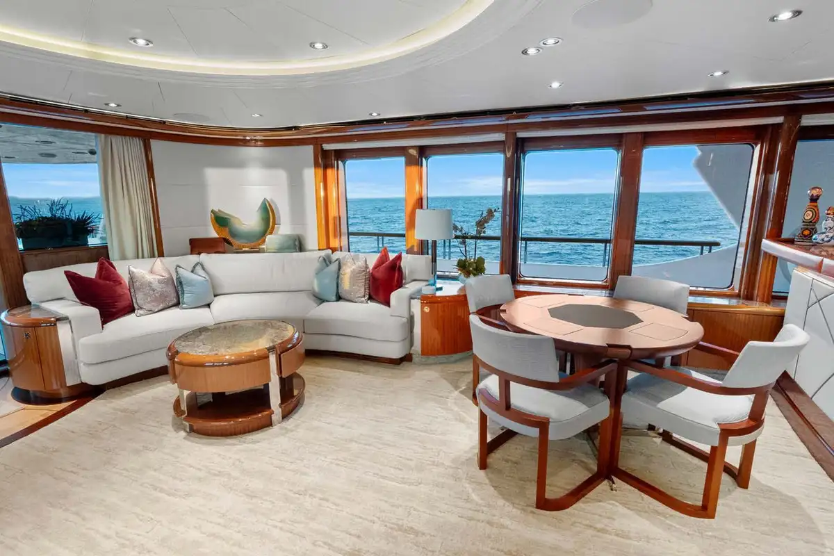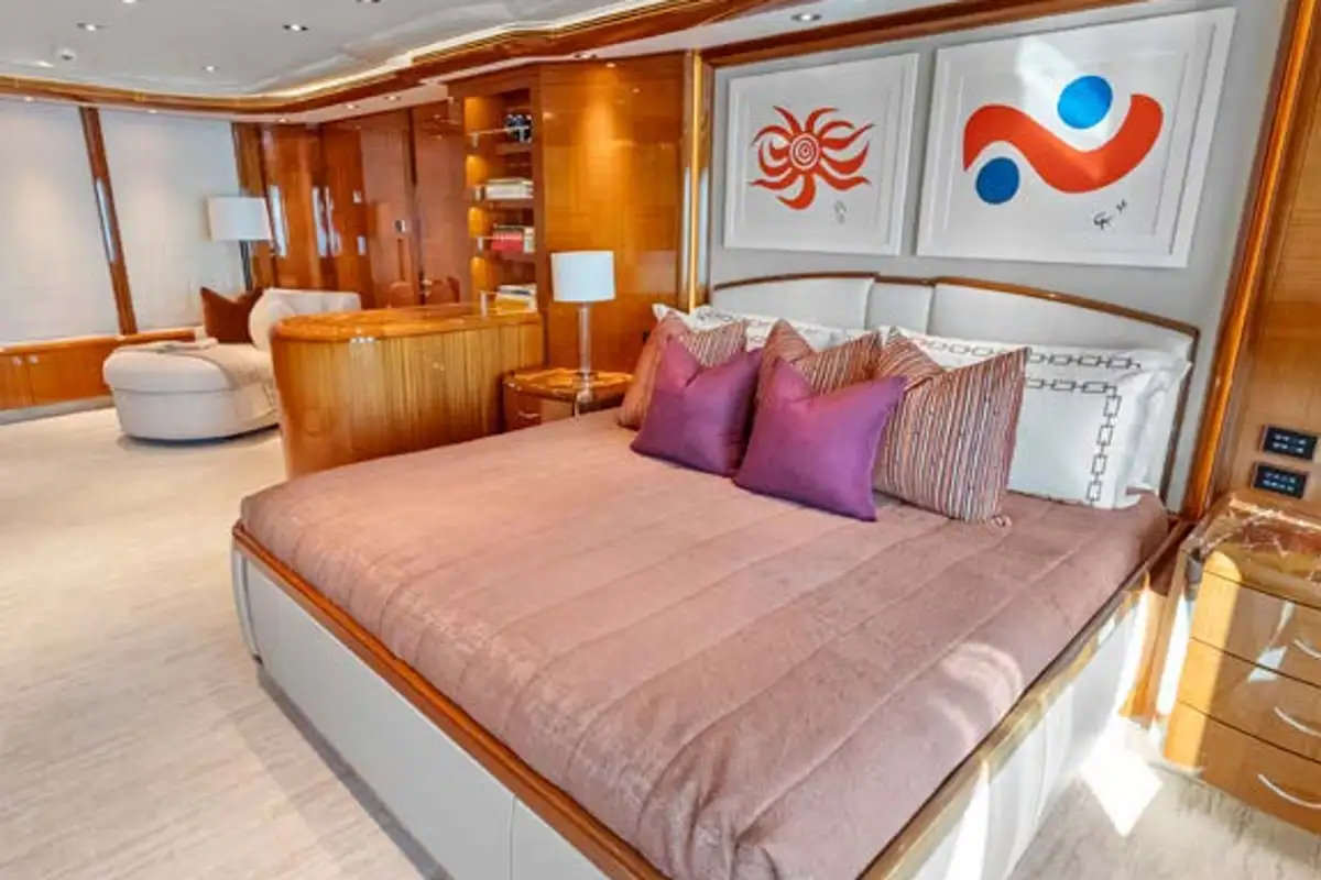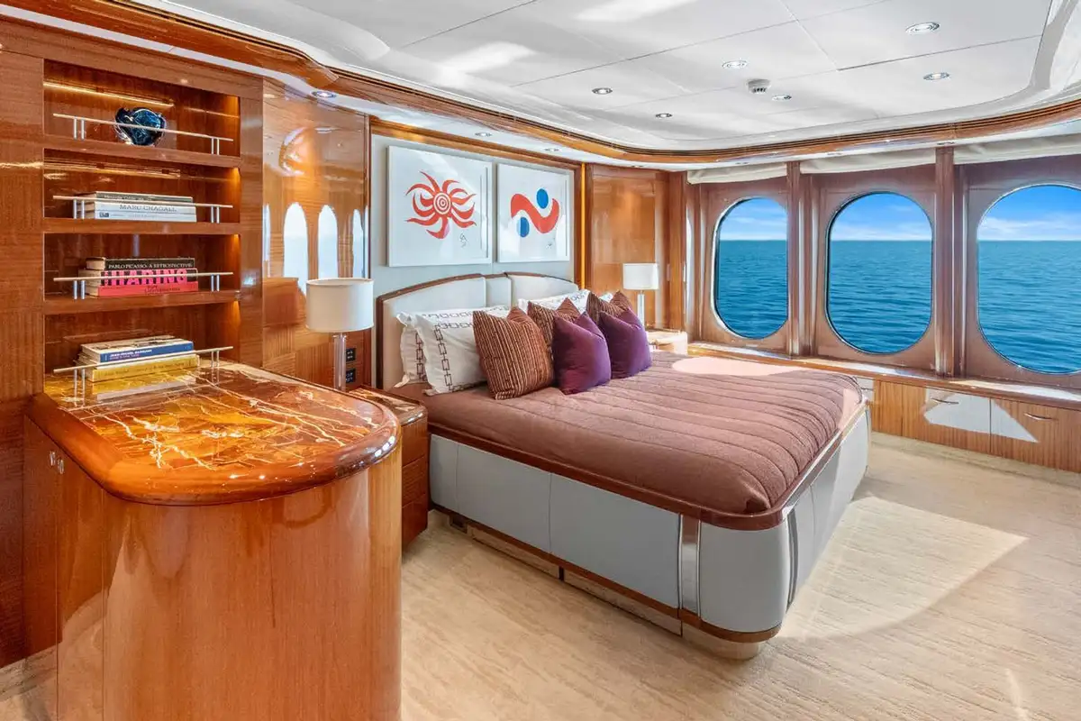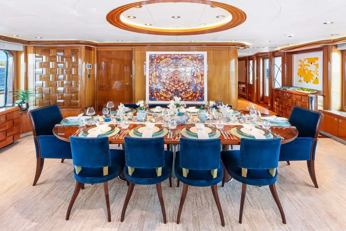 The main deck saloon has gorgeous flowing curves, a marble floor, iconic modern art, huge windows and a high-gloss hardwood finish. There’s a sleek bar, a chic and comfortable lounge, and an impressive dining area.