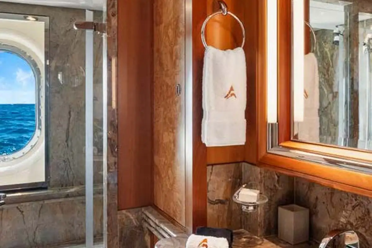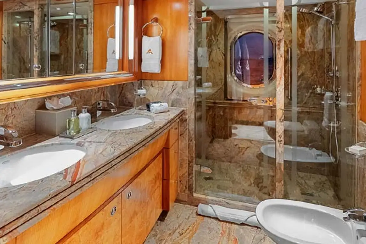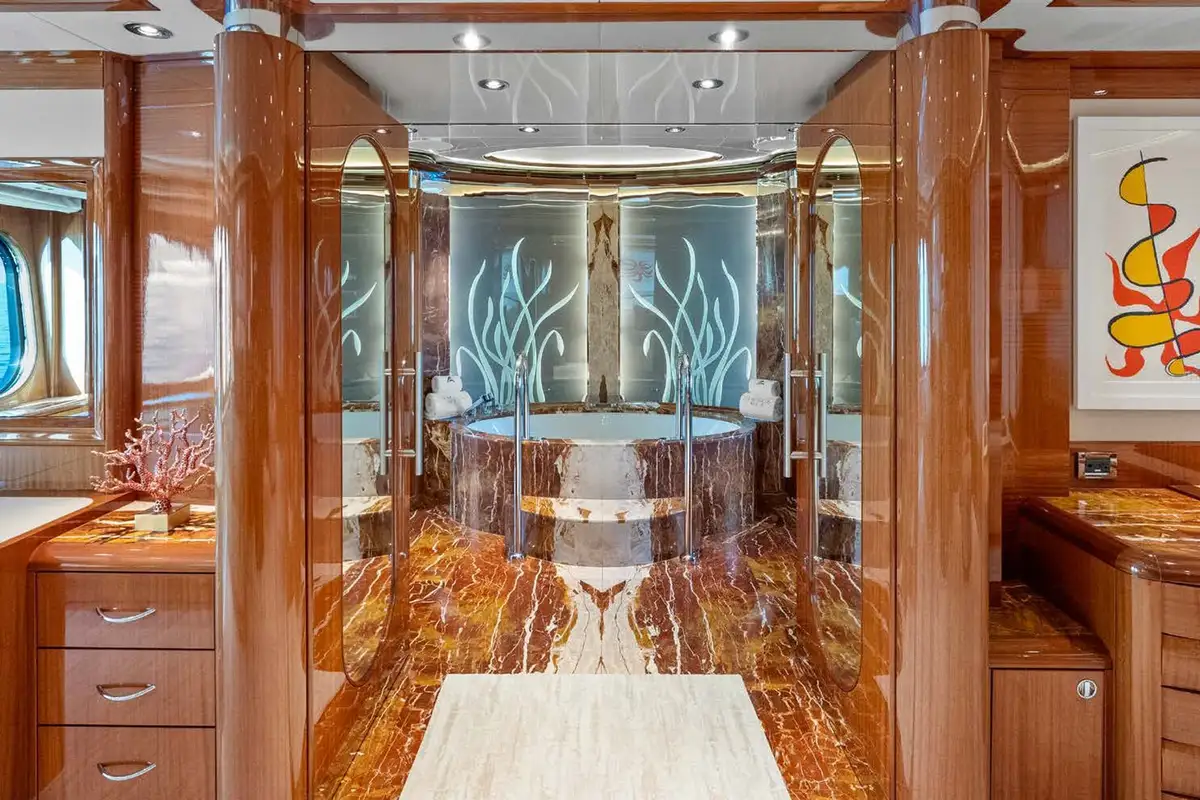 All the way forward on the main deck you’ll find an exceptional master suite. The main cabin is spacious and soothing with subtle mood lighting and an amazing quality of finish. There’s plenty of natural light and great sea views from three big oval windows on each side. You’ll have study and lounge areas for your private use. Double doors lead into the spectacular marble bathroom, which has a walk-in dressing room and an enormous bathtub as well as a large, separate shower.