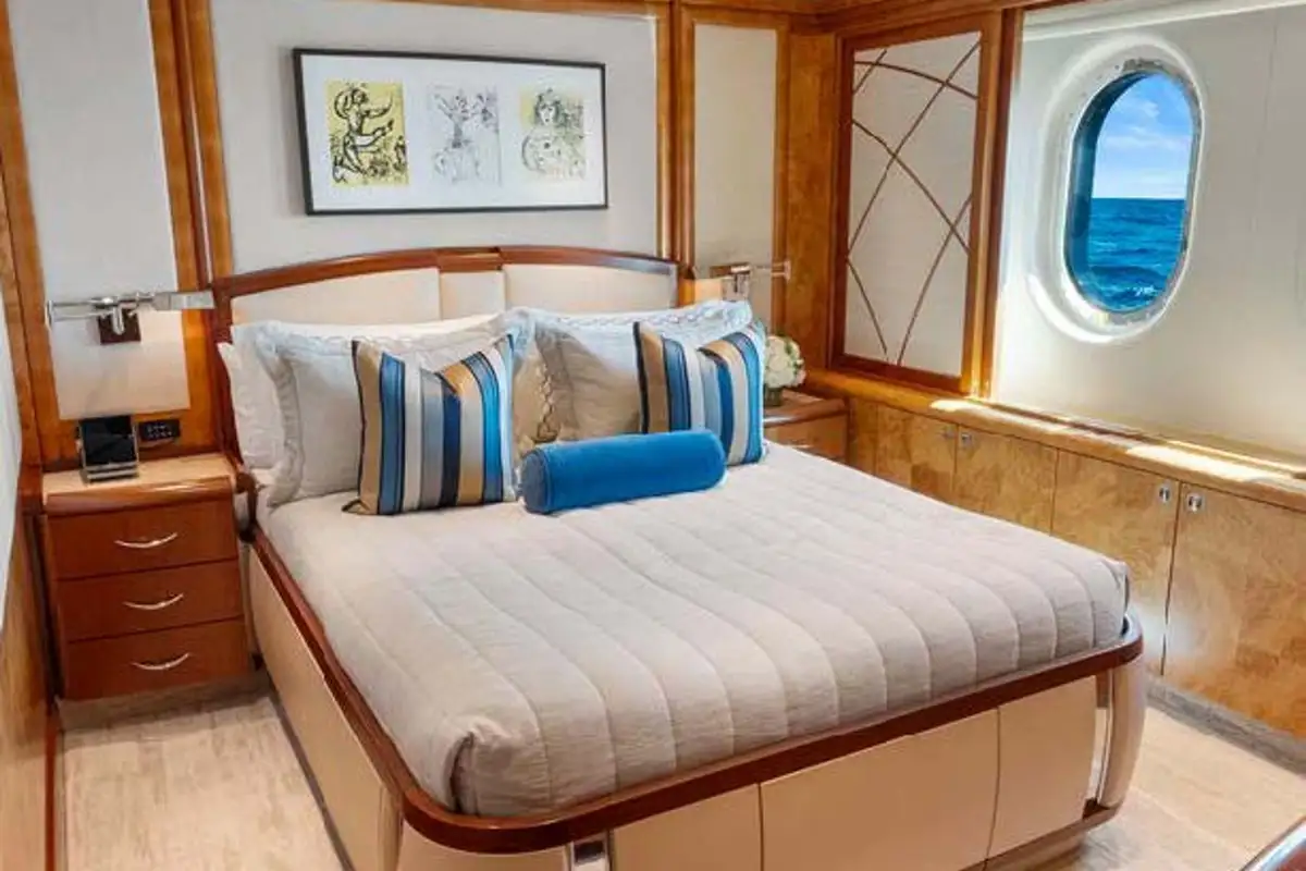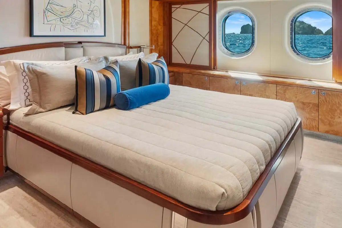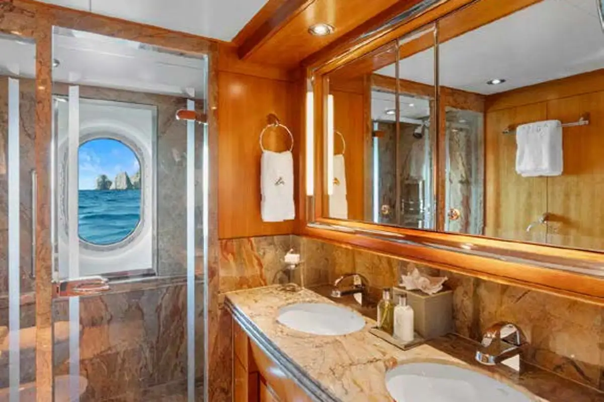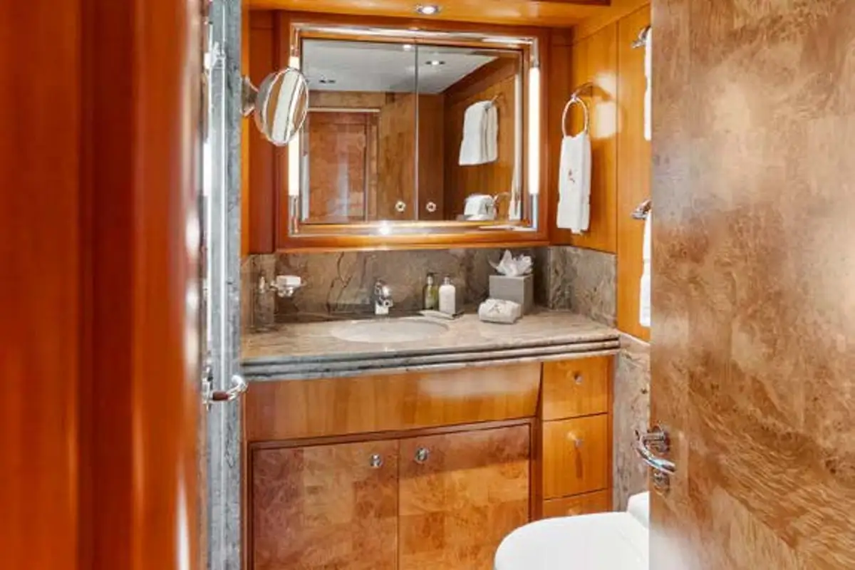 All the way forward on the main deck you’ll find an exceptional master suite. The main cabin is spacious and soothing with subtle mood lighting and an amazing quality of finish. There’s plenty of natural light and great sea views from three big oval windows on each side. You’ll have study and lounge areas for your private use. Double doors lead into the spectacular marble bathroom, which has a walk-in dressing room and an enormous bathtub as well as a large, separate shower.