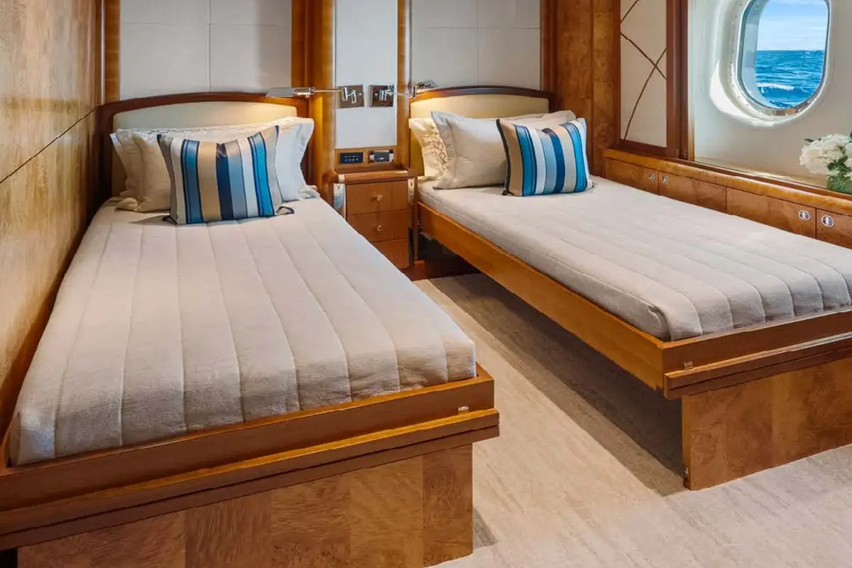 In the other four guest cabins, amidships on the lower deck, your guests will enjoy a high level of luxury with a similar design aesthetic. Each cabin has good sea views through a couple of windows, a marble en suite bathroom and an ample amount of living space.