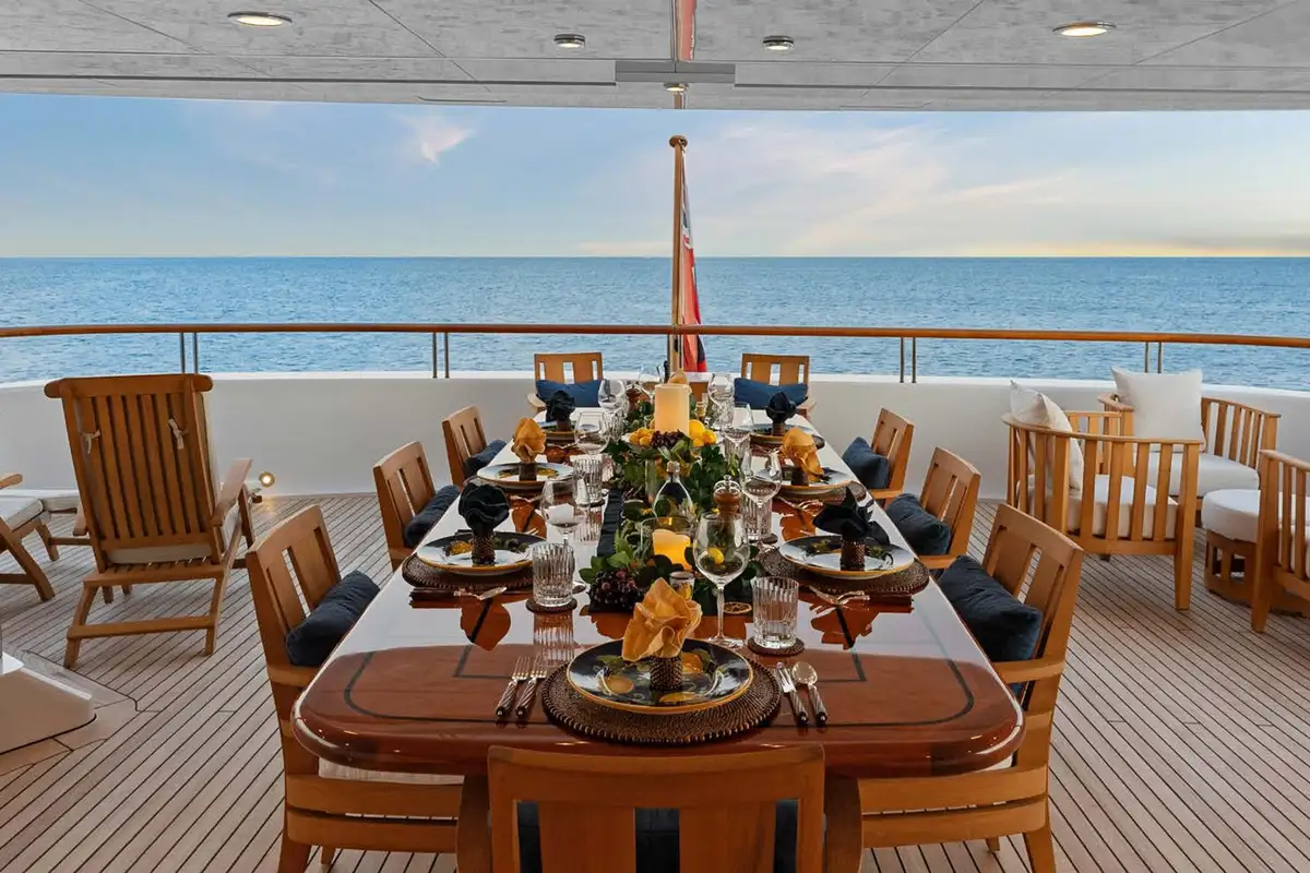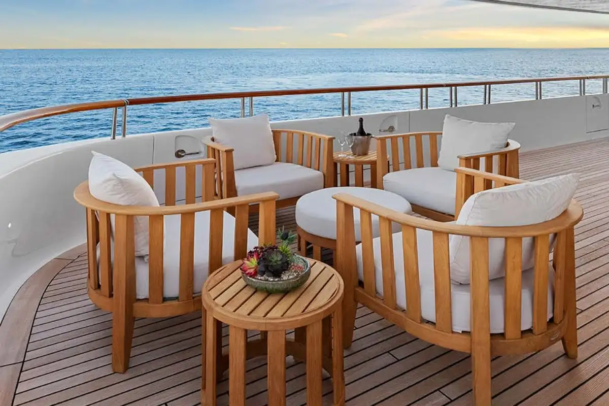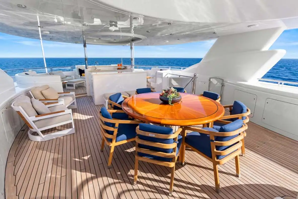 The upper aft deck is the main open-air dining zone on board. It’s elegant and uncluttered with panoramic views from the big teak table and ample space to invite a couple of extra guests on board for a sociable dinner party.