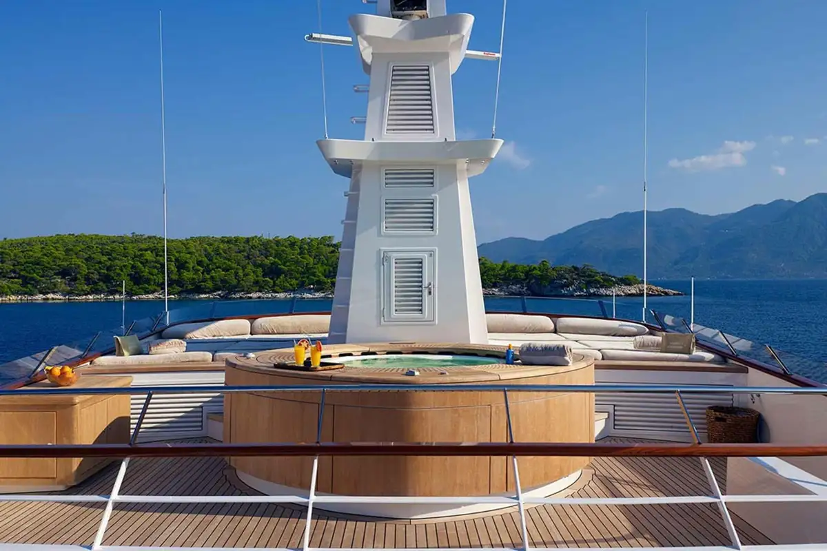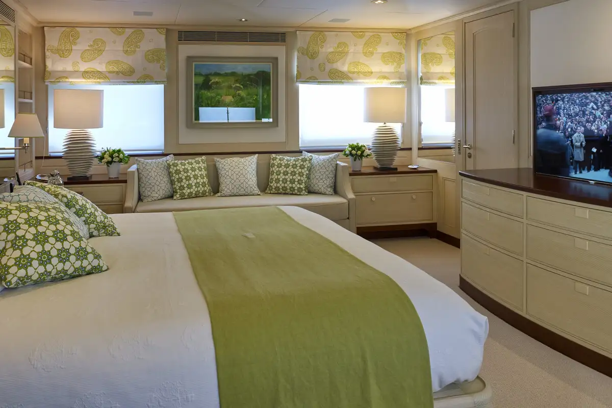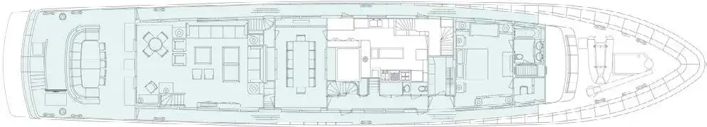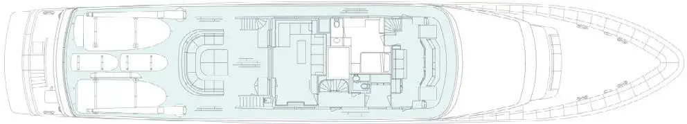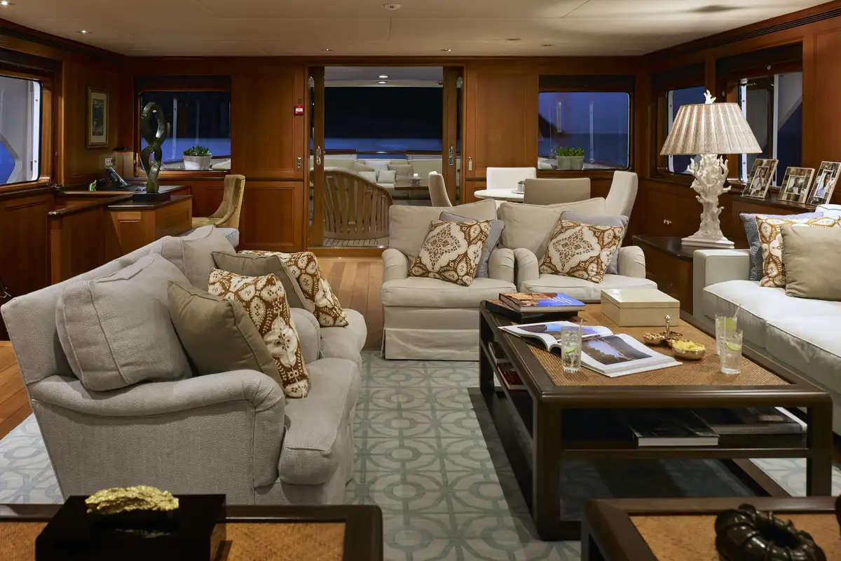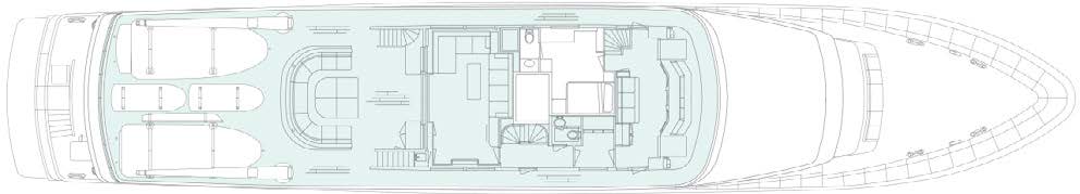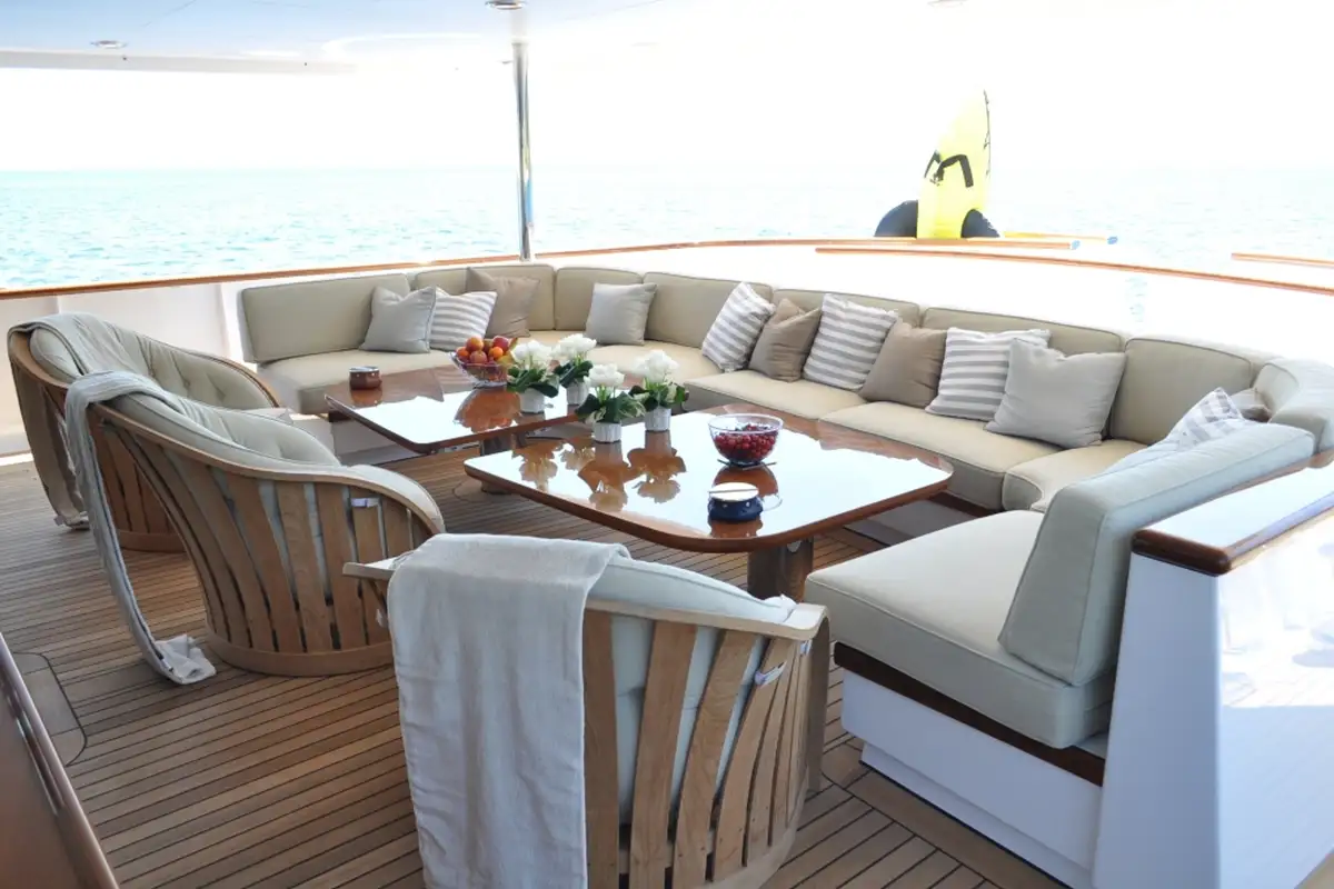 Stepping through the teak-surround sliding doors on the main deck, you find the main lounge, desk area, small four-person cards table and a formal dining area located forward separated from the rest of the living area. Wood panelling is complemented by neutral coloured soft fabrics and bold accessories in-keeping with her timeless style. A second living area is above where the sky lounge sets the scene for a beach-club environment with direct access to the sky lounge outside lounging area. This is without doubt, the perfect spot for a morning coffee or evening drink while admiring the surrounding sea views.