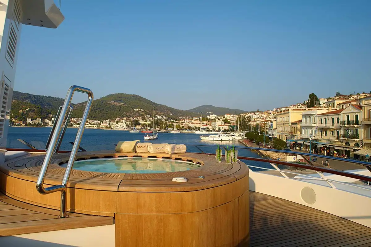 Outside, there is no shortage of dining and seating areas with space on the aft deck and the upper deck. At the highest point, the sun deck offers a raised jacuzzi and towelled sun pads for sun bathing with uninterrupted ocean views. The beach club at sea level offers easy access to the water and serves as the perfect launching platform to test out ANCALLIA’s extensive selection of water toys, snorkelling gear and kayaks.