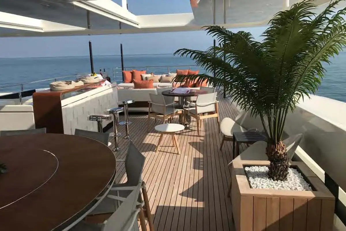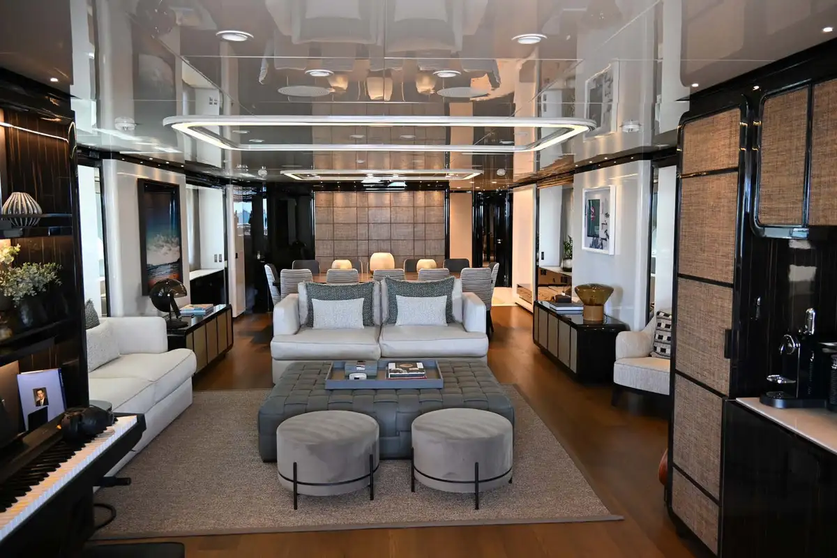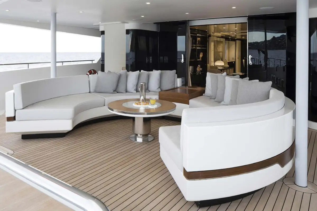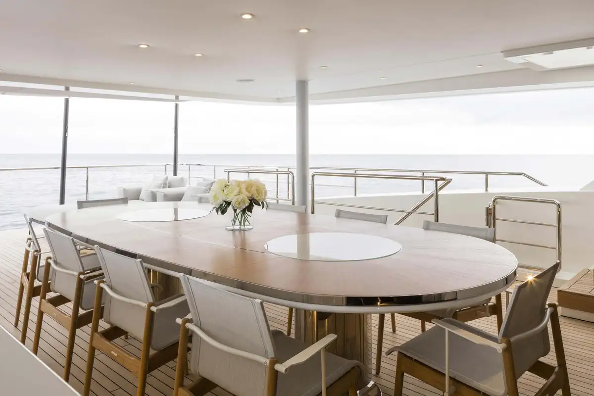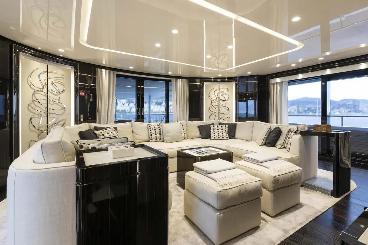 ANDIAMO’s standout feature is surely her infinity pool with its innovative waterfall effect. It enjoys elevated views from its position on the sun deck, where there’s also a bar counter, an expanse of cushioned sun pads, and space to dine alfresco.