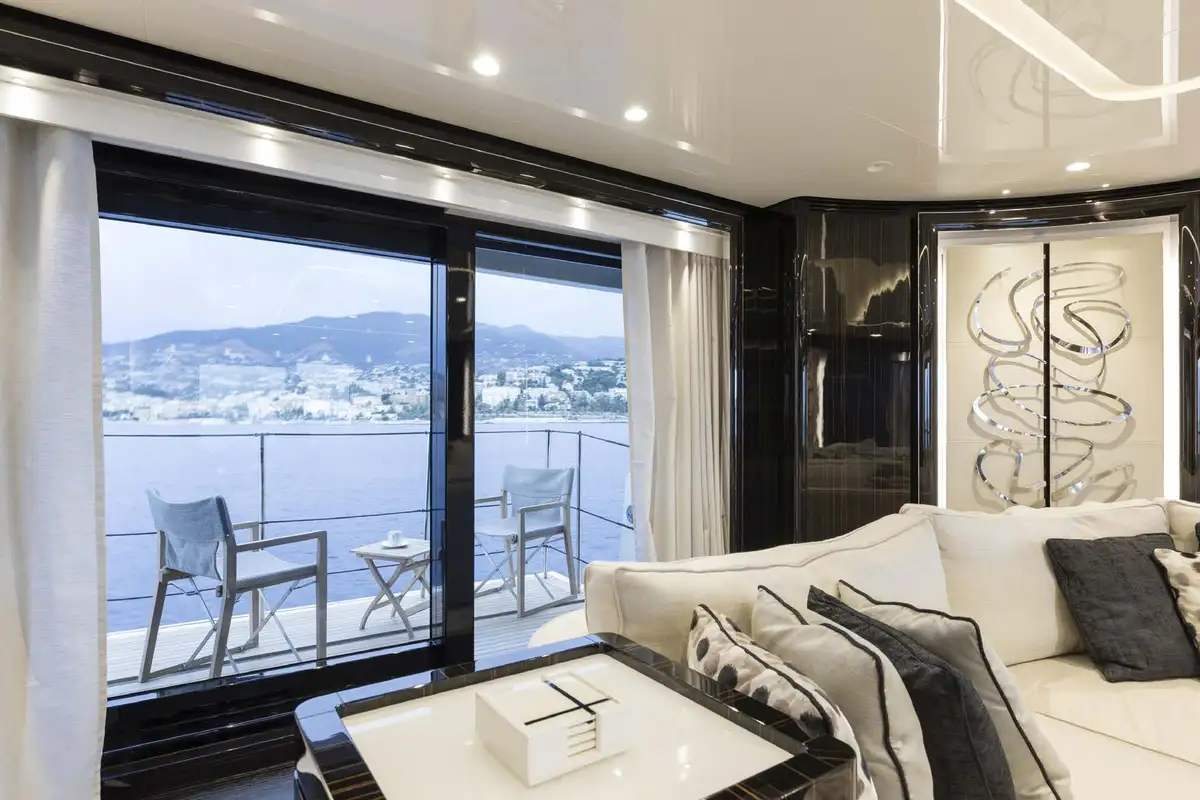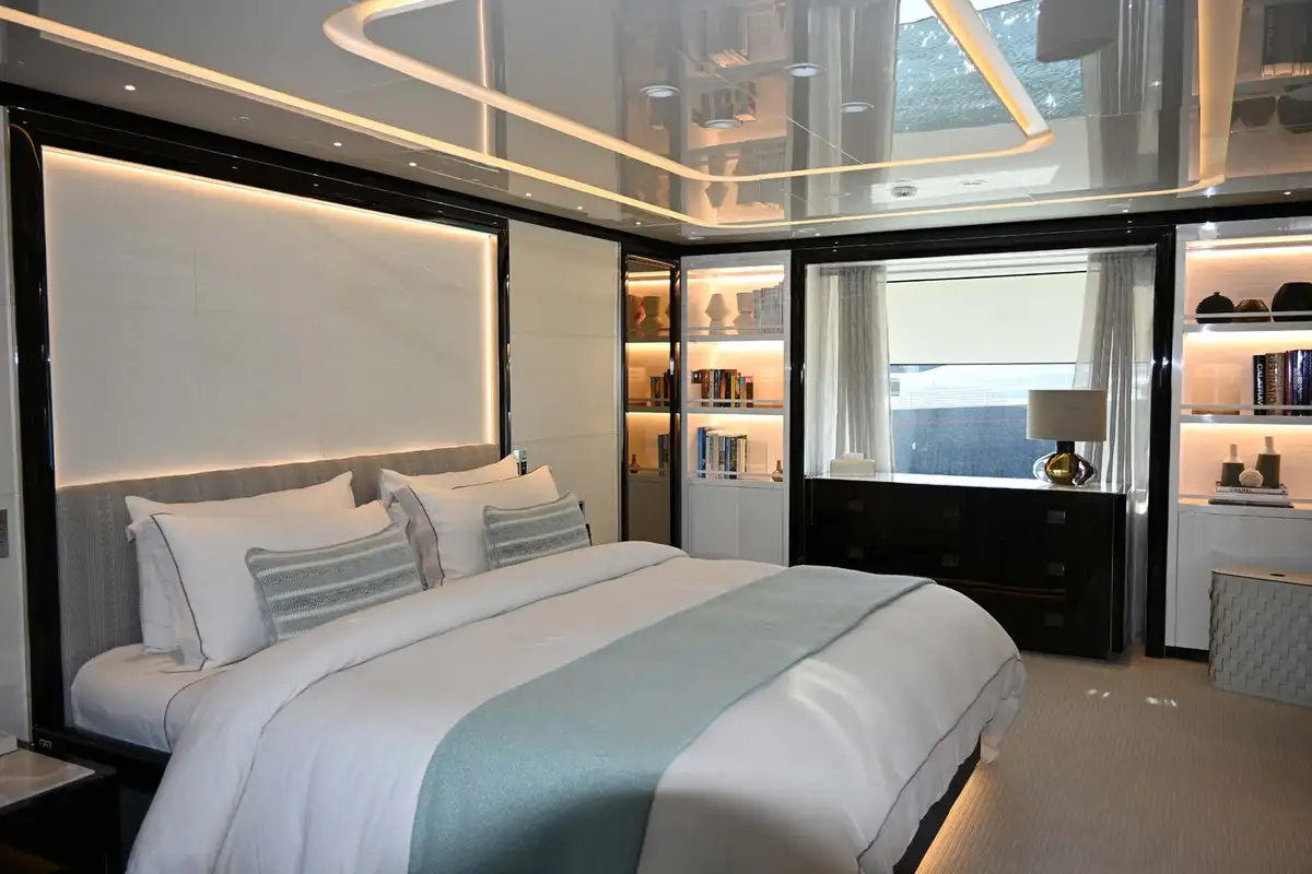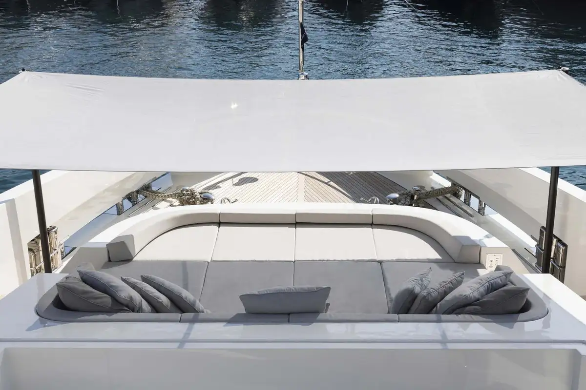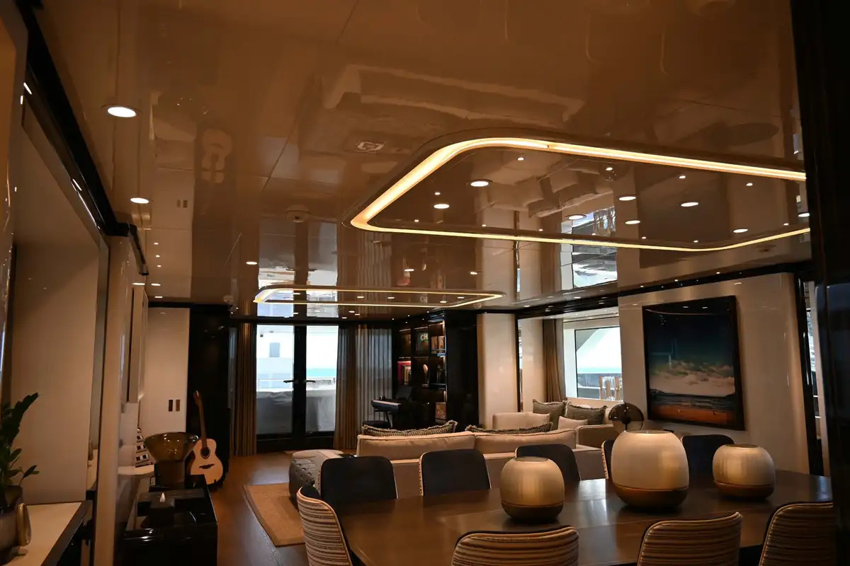 ANDIAMO’s standout feature is surely her infinity pool with its innovative waterfall effect. It enjoys elevated views from its position on the sun deck, where there’s also a bar counter, an expanse of cushioned sun pads, and space to dine alfresco.
